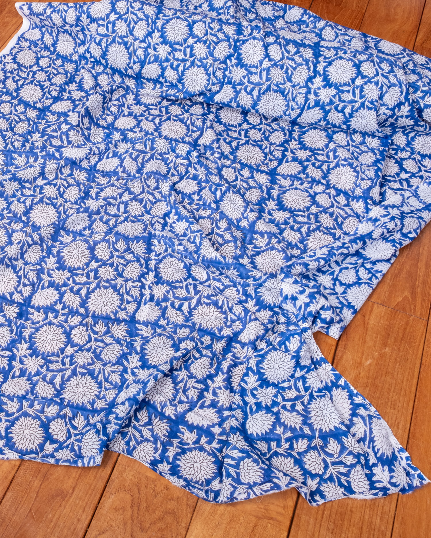 【3個セット】〔1m単位切り売り〕ジャイプル 職人手作り木版染め 色彩美しいボタニカルデザイン〔幅約113cm〕〔ブルー系 更紗柄〕 おしゃれ 生地 テーブルクロス 手芸素材などへの商品写真 3枚目 生地を広げてみたところです。横幅もしっかりあります。注文個数に応じた長さにカットしてお送りいたします。