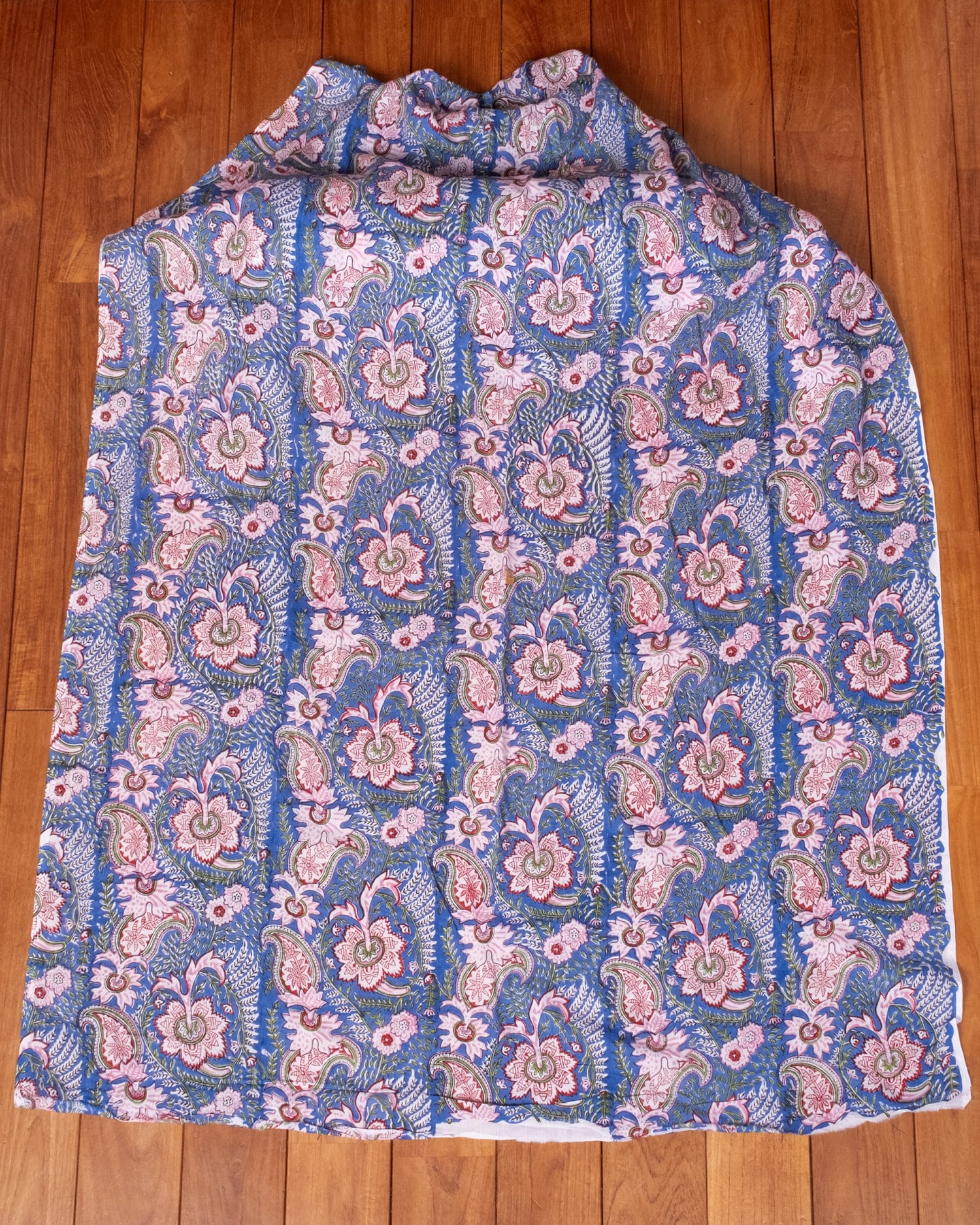 木版染めとは、ウッドブロック(木版)を用いて一つ一つ模様を染めこんだ優雅で贅沢な仕上がりの布です。大量生産には向かない、非常に時間のかかる丁寧な手仕事の賜物といえます。インドは美しい布の宝庫ですが、その中でも特に素敵な一枚に仕上がっています。