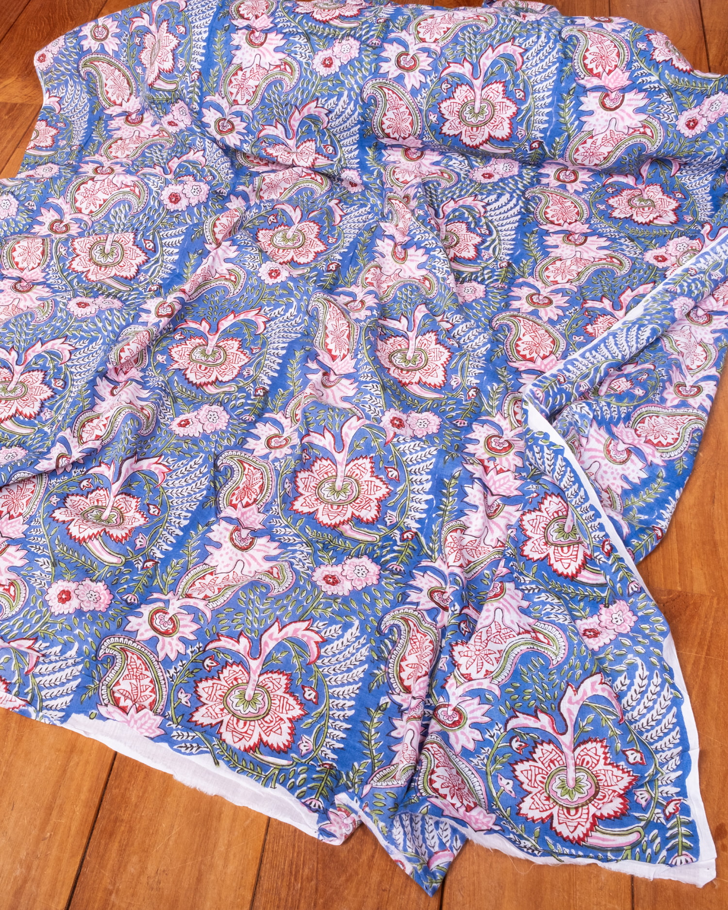 【3個セット】〔1m単位切り売り〕ジャイプル 職人手作り木版染め 色彩美しいボタニカルデザイン〔幅約111cm〕〔ブルー系 更紗柄〕 おしゃれ 生地 テーブルクロス 手芸素材などへ 通販店