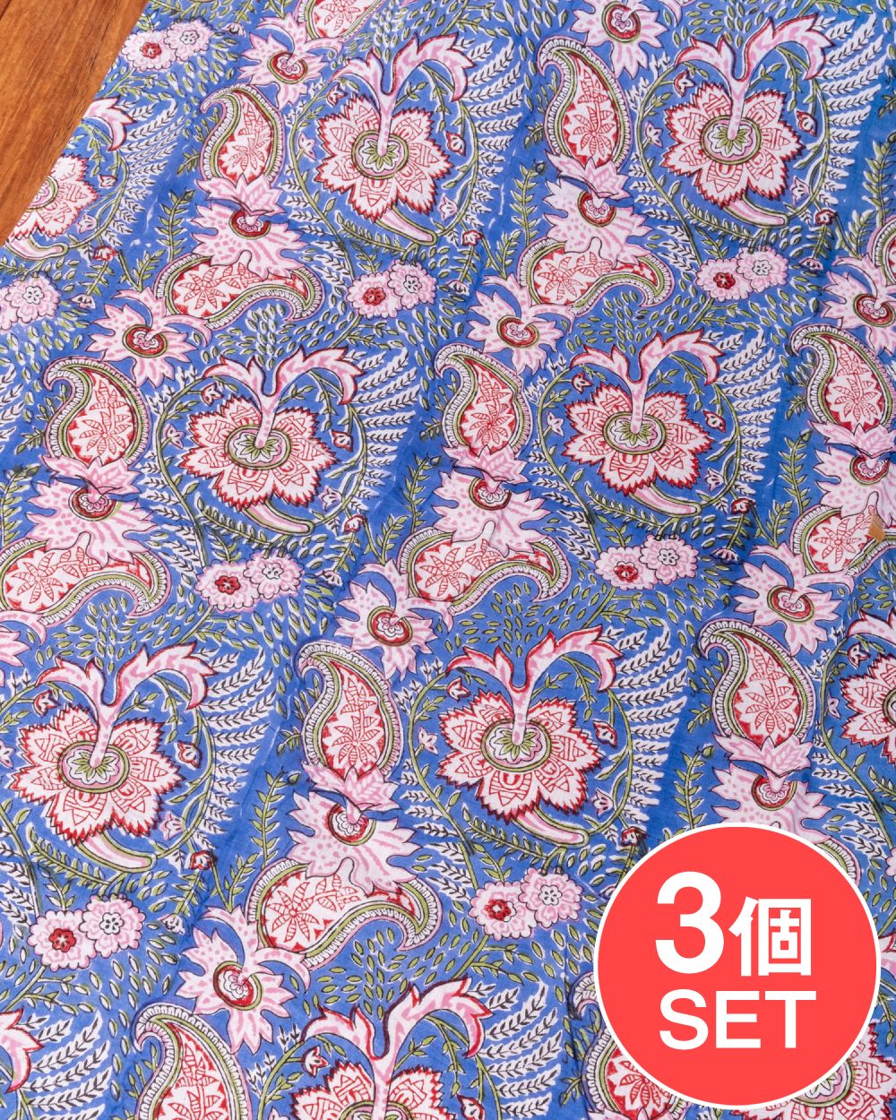 【3個セット】〔1m単位切り売り〕ジャイプル 職人手作り木版染め 色彩美しいボタニカルデザイン〔幅約111cm〕〔ブルー系 更紗柄〕 おしゃれ 生地 テーブルクロス 手芸素材などへ