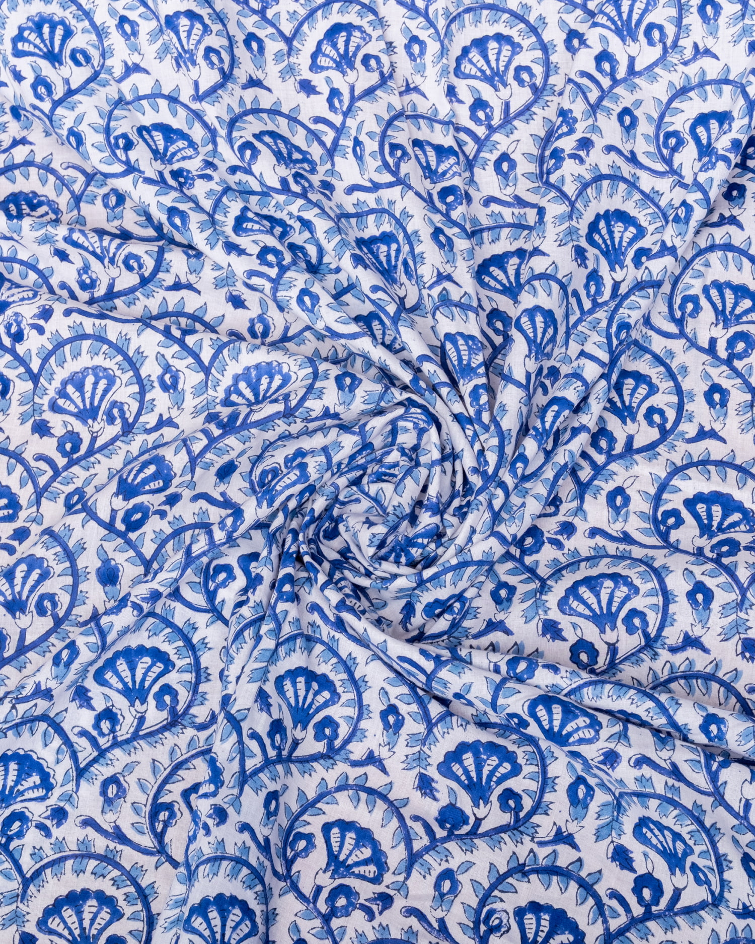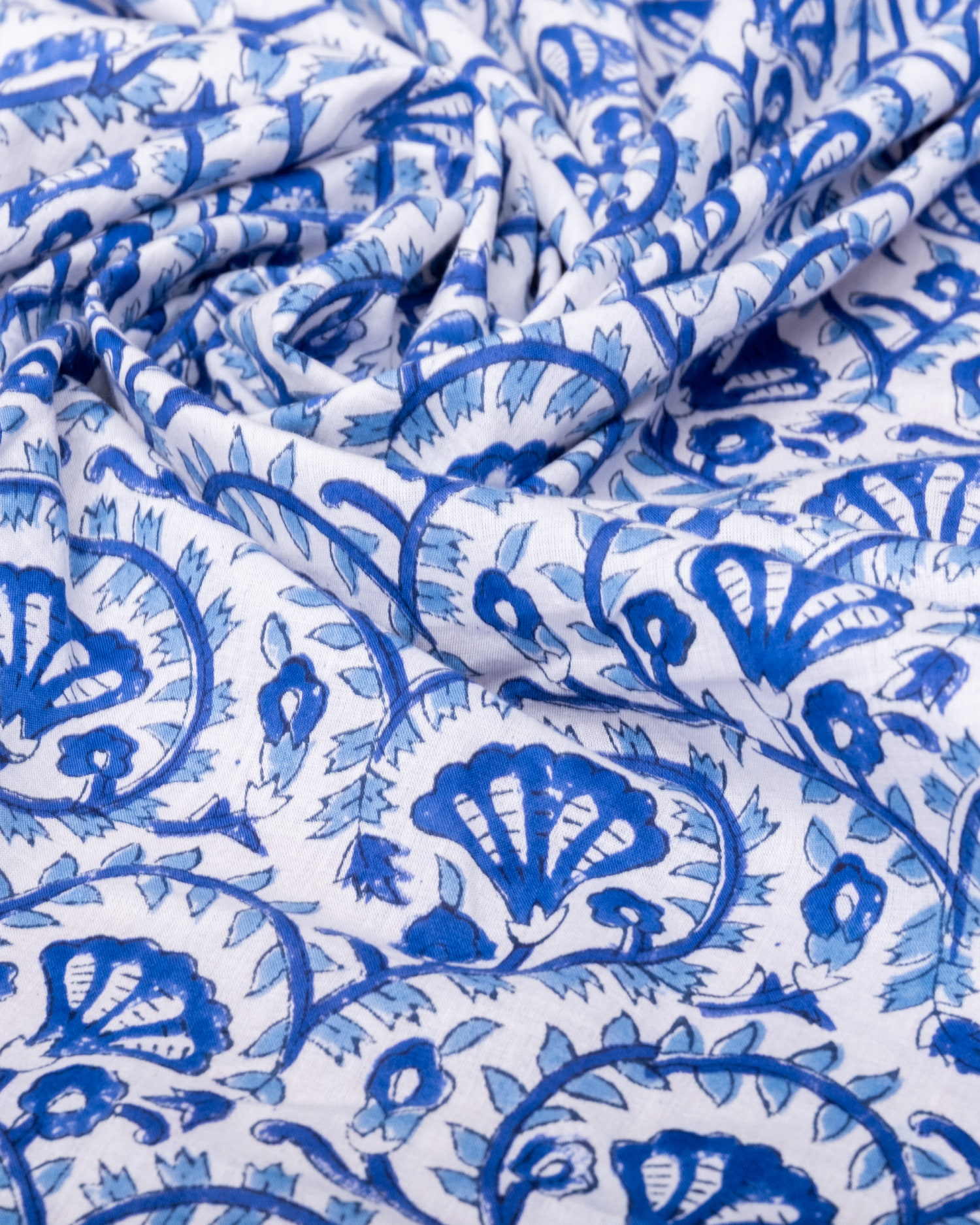 【3個セット】〔1m単位切り売り〕ジャイプル 職人手作り木版染め 色彩美しいボタニカルデザイン〔幅約106cm〕〔ブルー系 更紗柄〕 おしゃれ 生地 テーブルクロス 手芸素材などへ 通販店