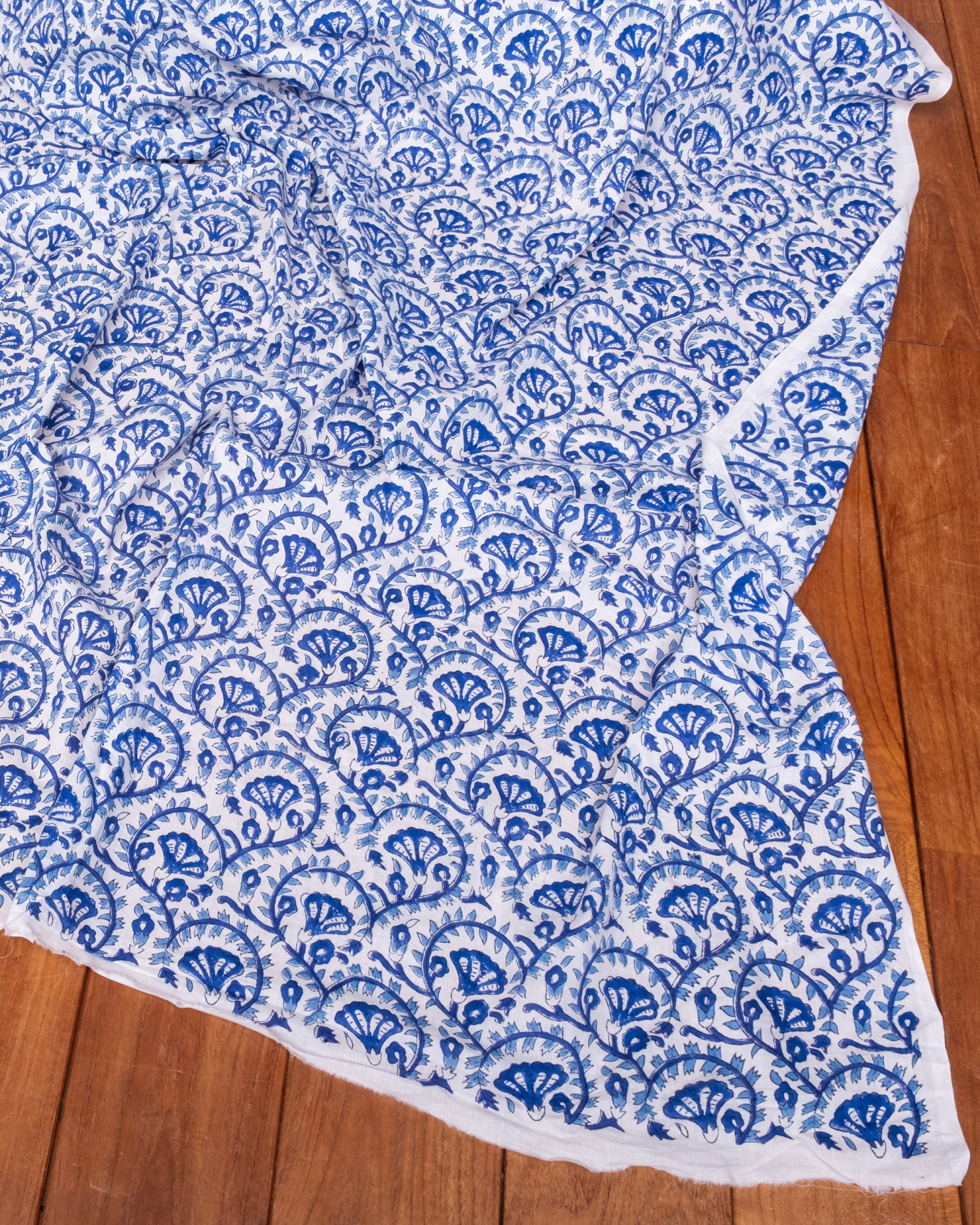 木版染めとは、ウッドブロック(木版)を用いて一つ一つ模様を染めこんだ優雅で贅沢な仕上がりの布です。大量生産には向かない、非常に時間のかかる丁寧な手仕事の賜物といえます。インドは美しい布の宝庫ですが、その中でも特に素敵な一枚に仕上がっています。