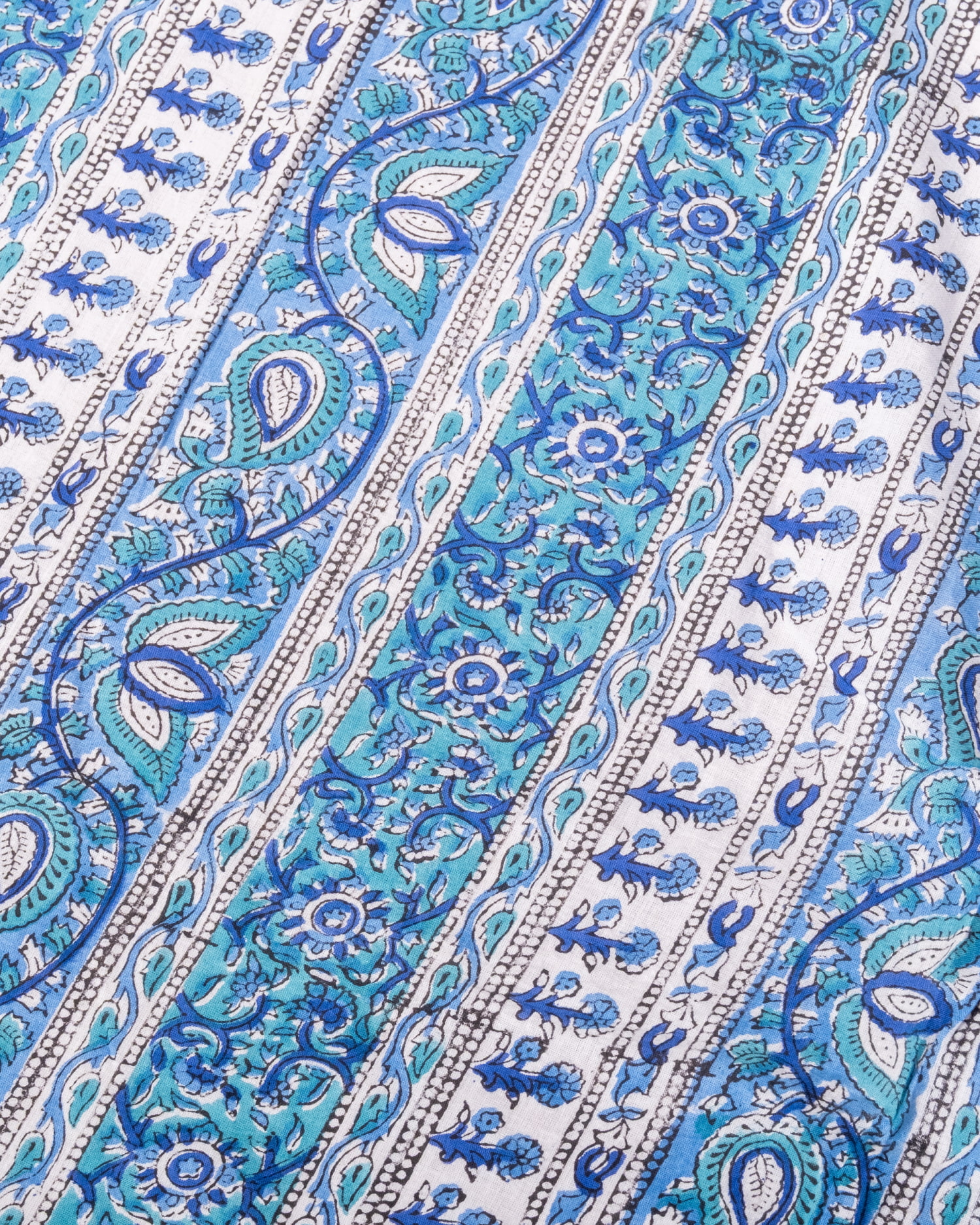 【3個セット】〔1m単位切り売り〕ジャイプル 職人手作り木版染め 色彩美しいボタニカルデザイン〔幅約109cm〕〔ブルー×青緑系 更紗柄〕 おしゃれ 生地 テーブルクロス 手芸素材などへの商品写真 6枚目 生地の拡大写真です