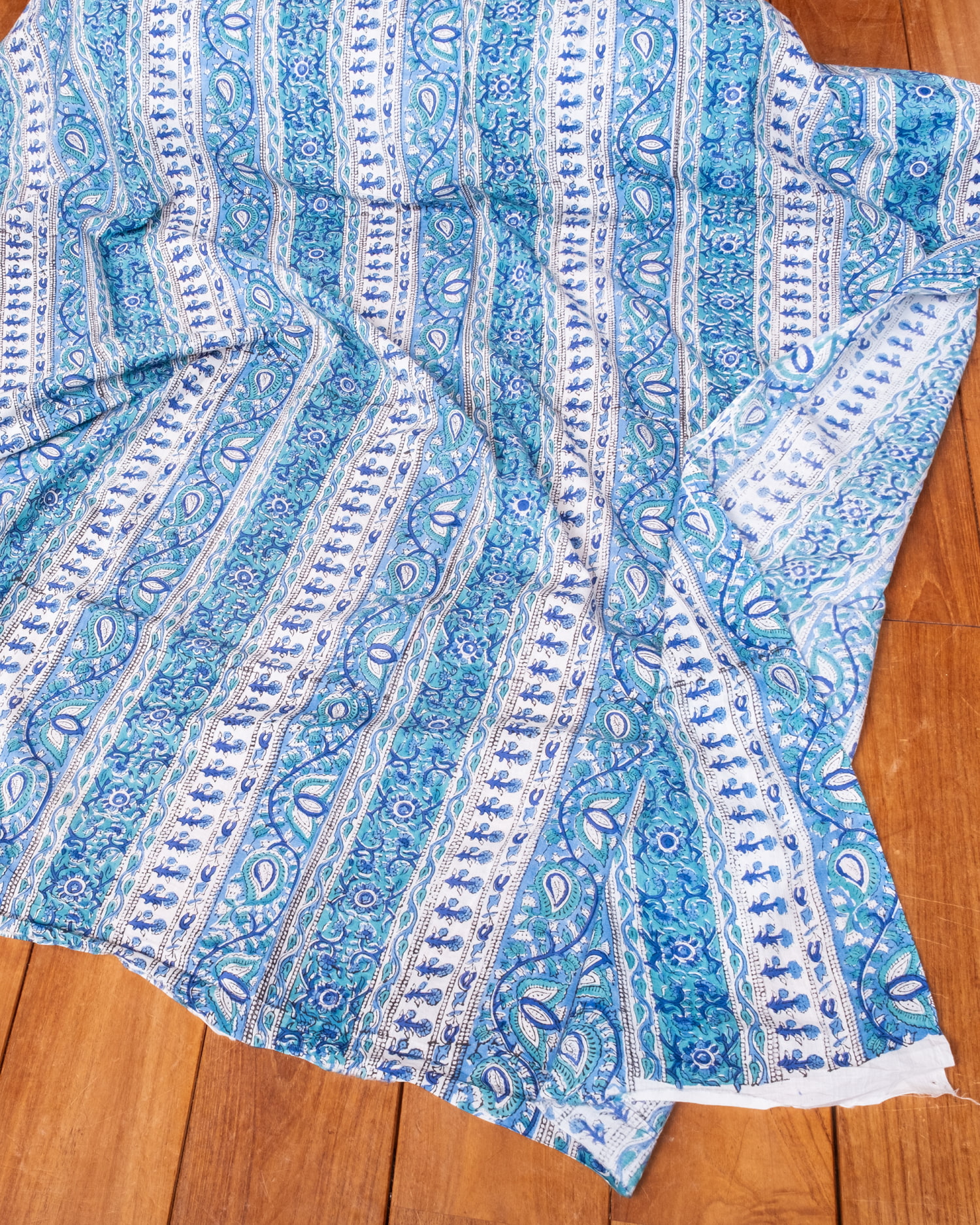 【3個セット】〔1m単位切り売り〕ジャイプル 職人手作り木版染め 色彩美しいボタニカルデザイン〔幅約109cm〕〔ブルー×青緑系 更紗柄〕 おしゃれ 生地 テーブルクロス 手芸素材などへの商品写真 3枚目 生地を広げてみたところです。横幅もしっかりあります。注文個数に応じた長さにカットしてお送りいたします。