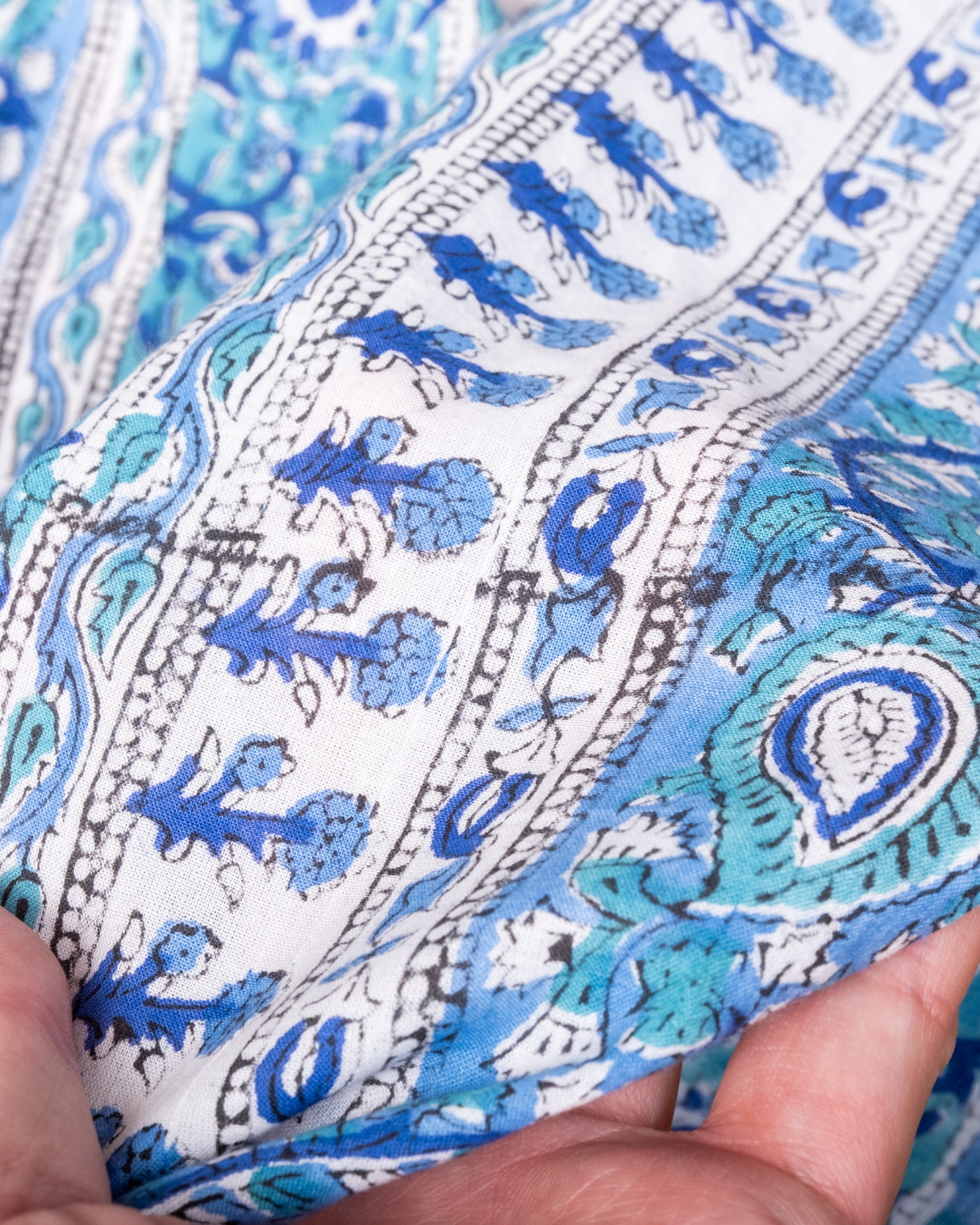 【3個セット】〔1m単位切り売り〕ジャイプル 職人手作り木版染め 色彩美しいボタニカルデザイン〔幅約109cm〕〔ブルー×青緑系 更紗柄〕 おしゃれ 生地 テーブルクロス 手芸素材などへの商品写真 5枚目 インドならではの布ですね。