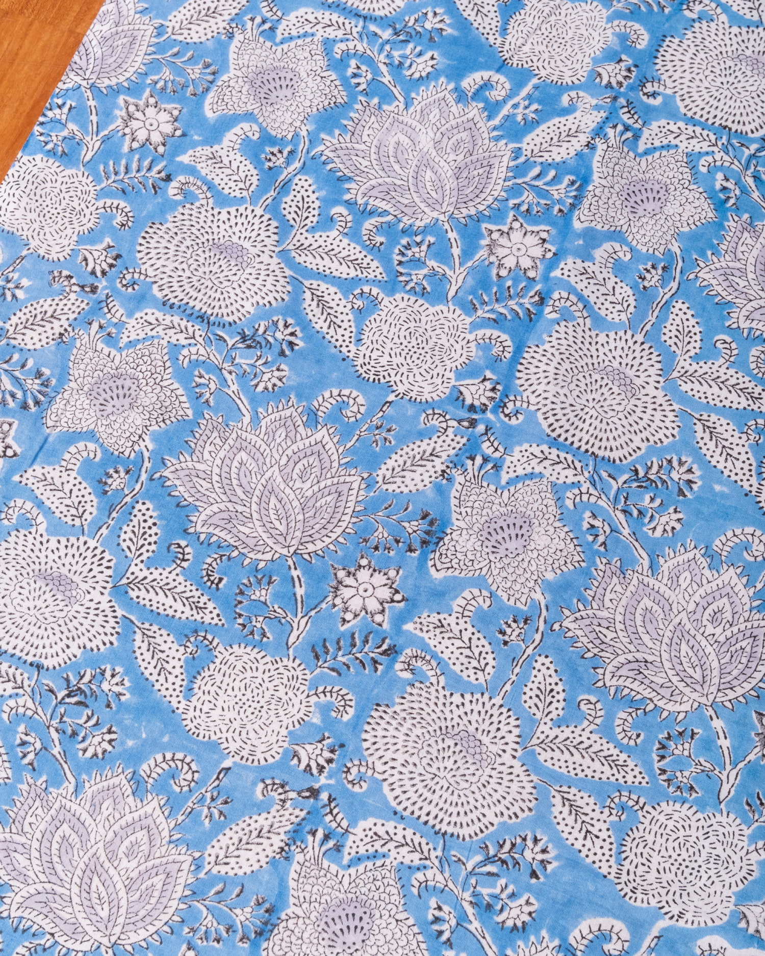 木版染めとは、ウッドブロック(木版)を用いて一つ一つ模様を染めこんだ優雅で贅沢な仕上がりの布です。大量生産には向かない、非常に時間のかかる丁寧な手仕事の賜物といえます。インドは美しい布の宝庫ですが、その中でも特に素敵な一枚に仕上がっています。ハンドメイドのウッドブロックプリントにしか出せない、独特のムラがありとても雰囲気があります。