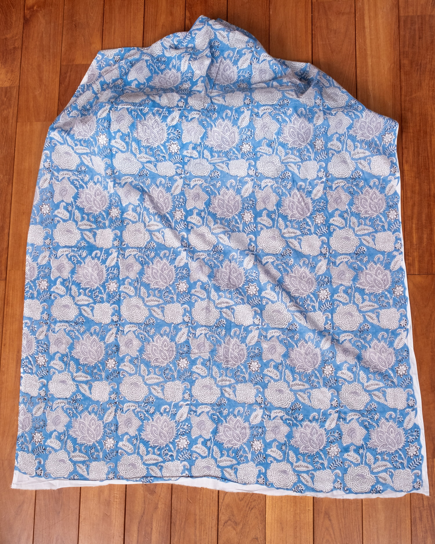 〔1m単位切り売り〕ジャイプル 職人手作り木版染め 色彩美しいボタニカルデザイン〔幅約106cm〕〔水色系 更紗柄〕 おしゃれ 生地 テーブルクロス 手芸素材などへ x 3個