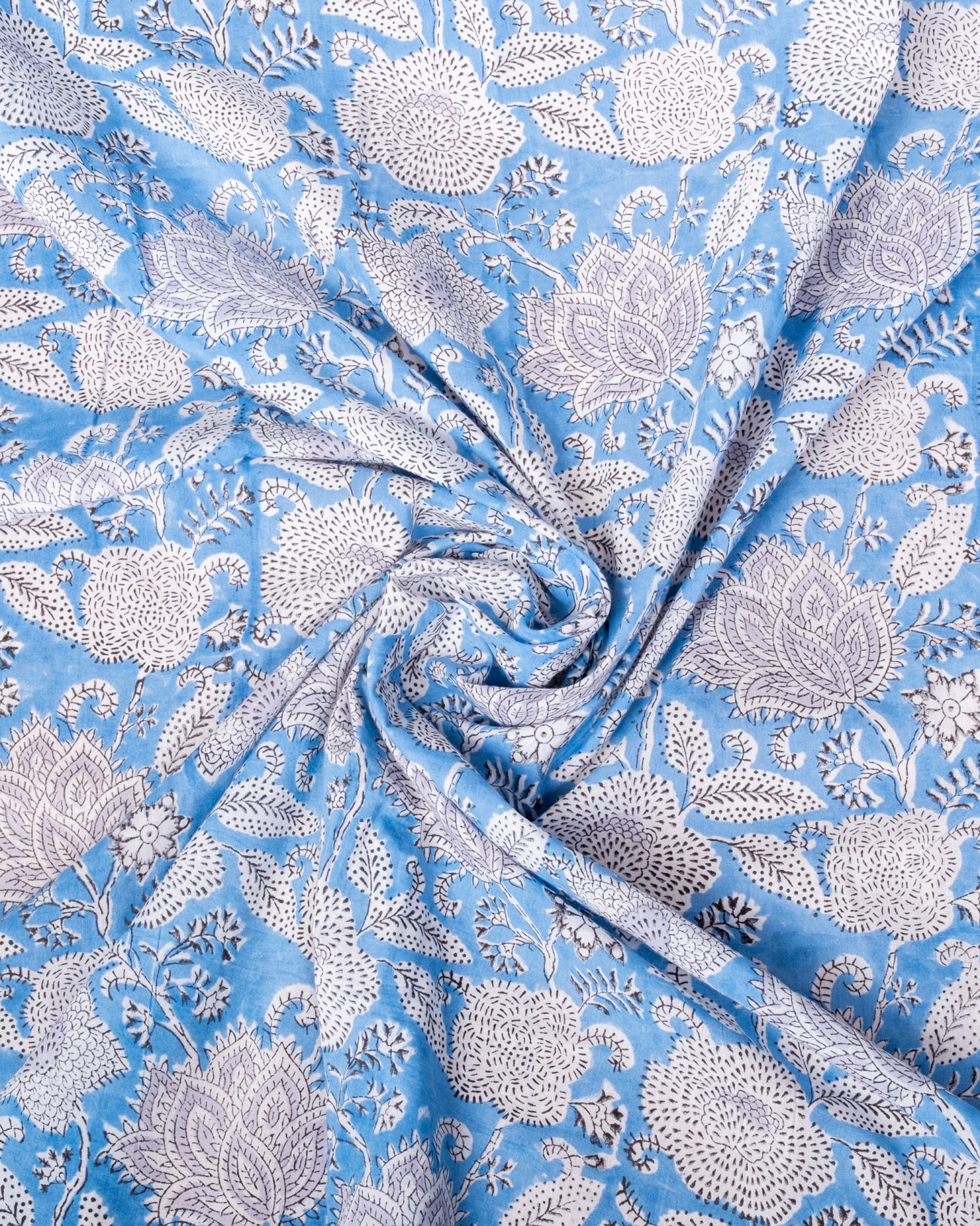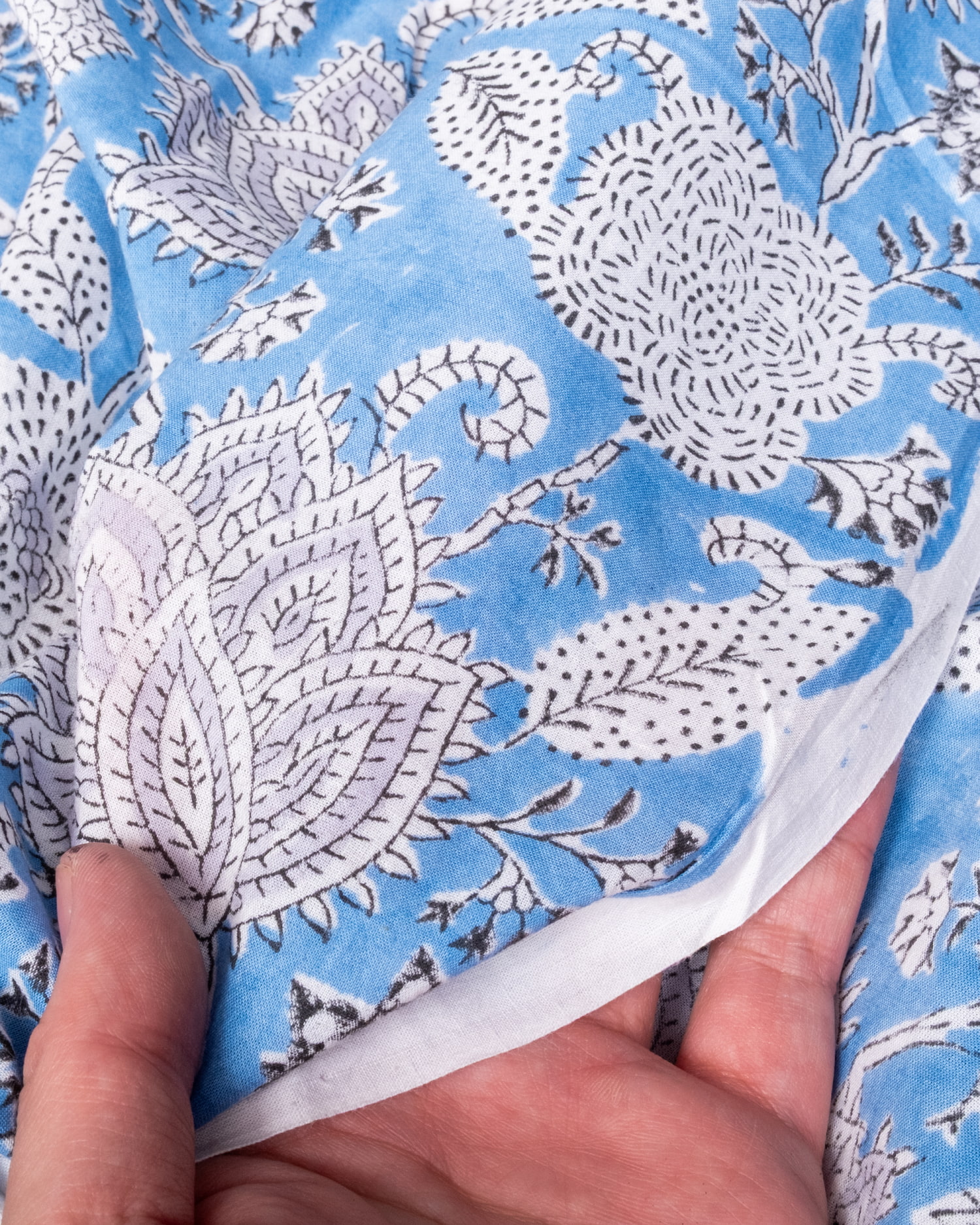 【3個セット】〔1m単位切り売り〕ジャイプル 職人手作り木版染め 色彩美しいボタニカルデザイン〔幅約106cm〕〔水色系 更紗柄〕 おしゃれ 生地 テーブルクロス 手芸素材などへ