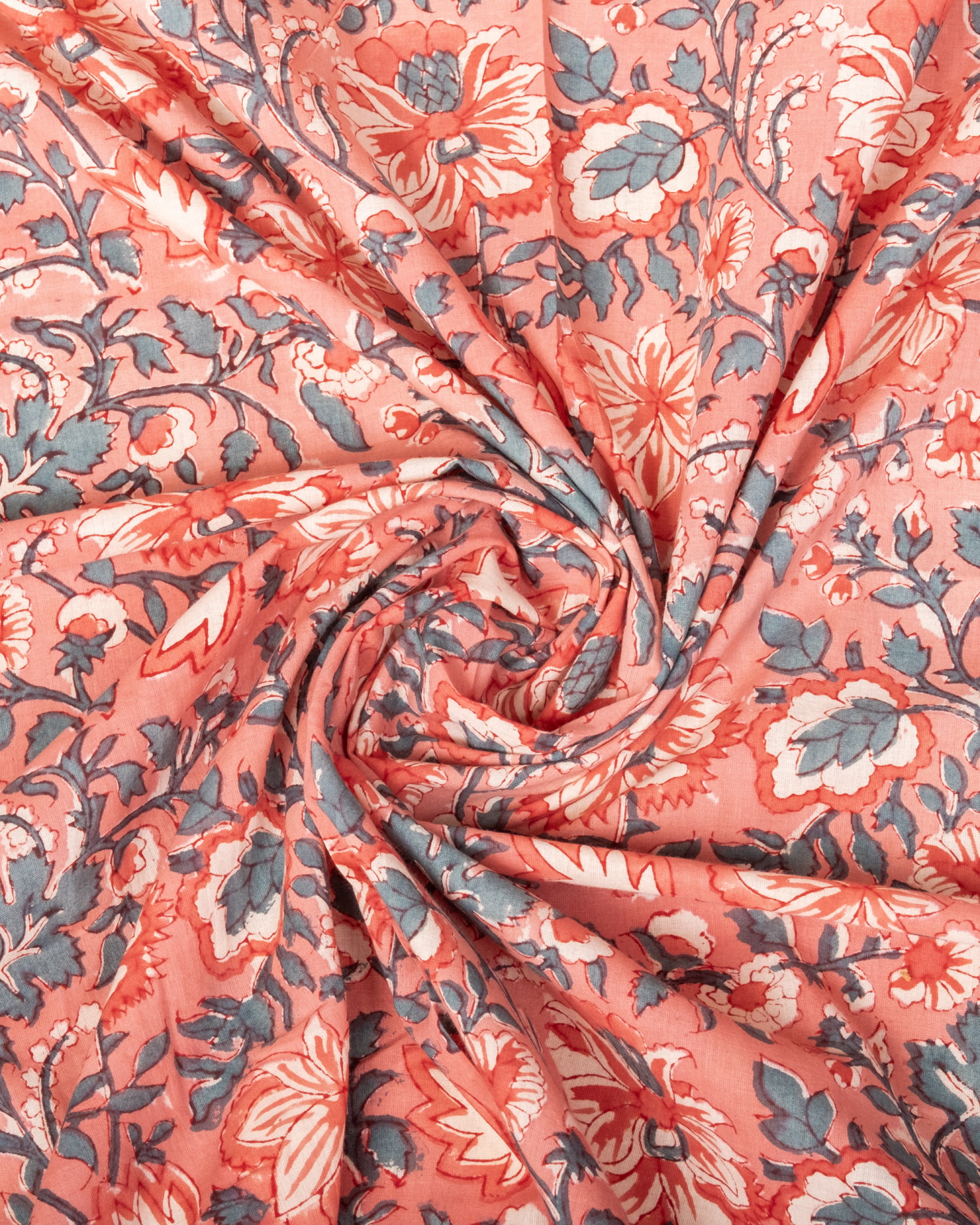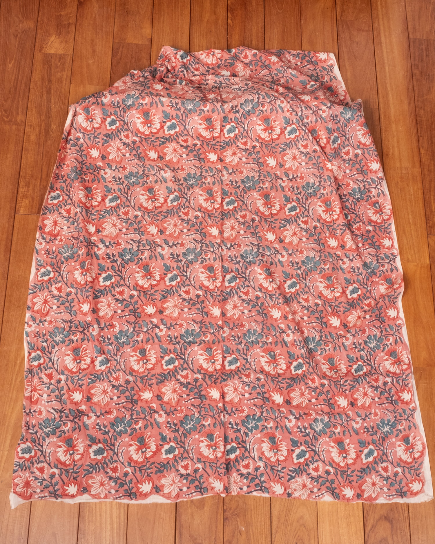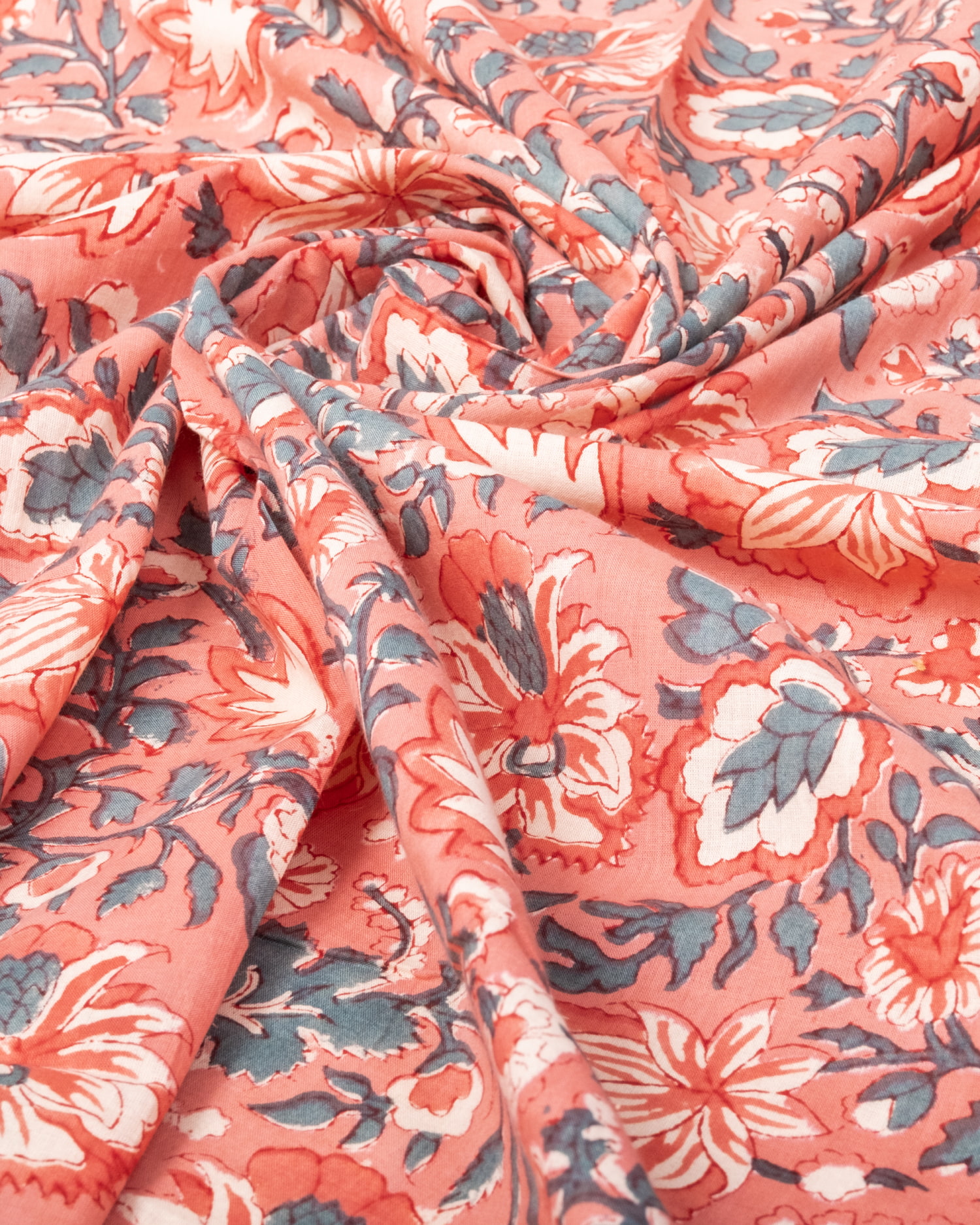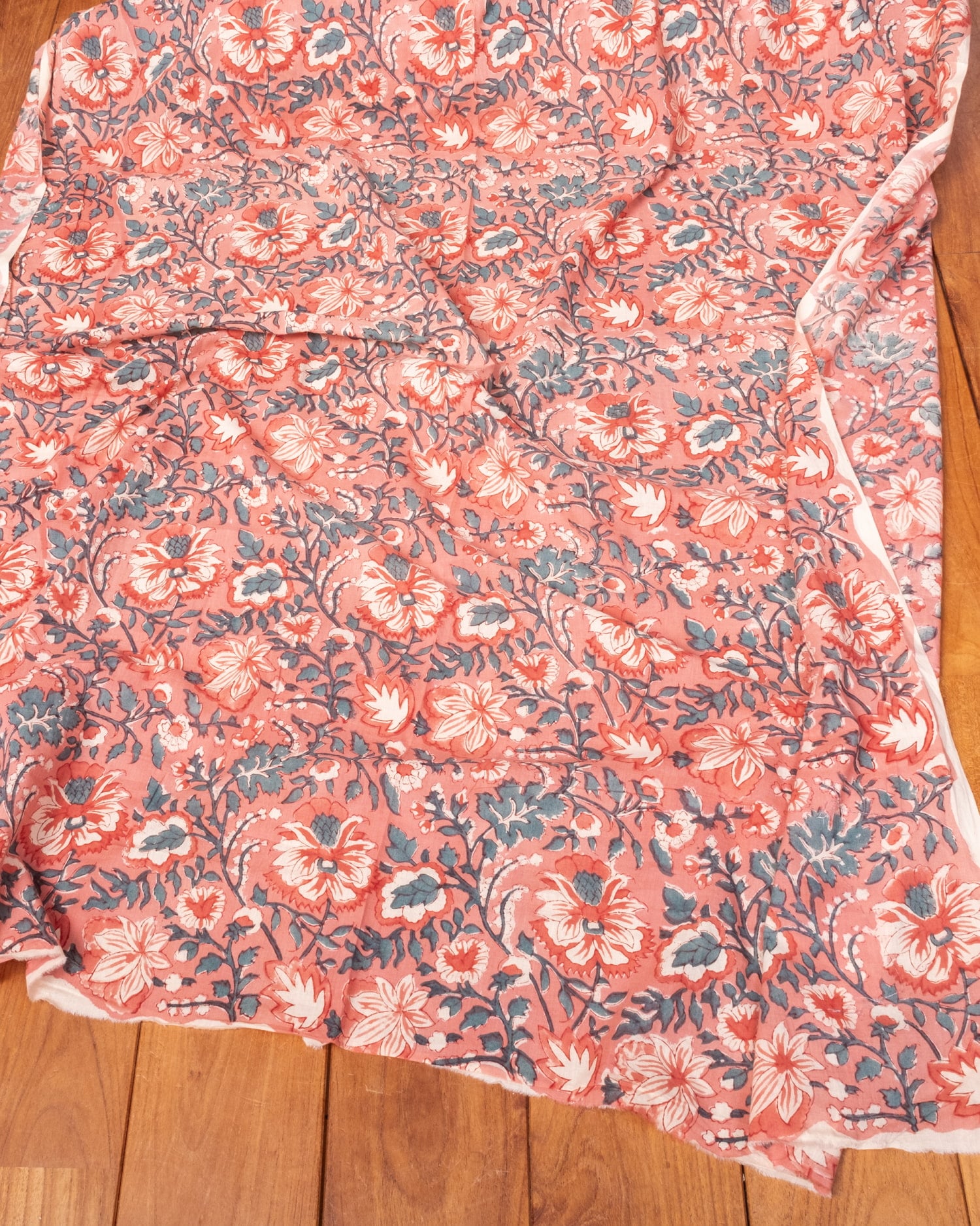 〔1m単位切り売り〕ジャイプル 職人手作り木版染め 色彩美しいボタニカルデザイン〔幅約109cm〕〔サーモンオレンジ系 更紗柄〕 おしゃれ 生地 テーブルクロス 手芸素材などへ x 3個