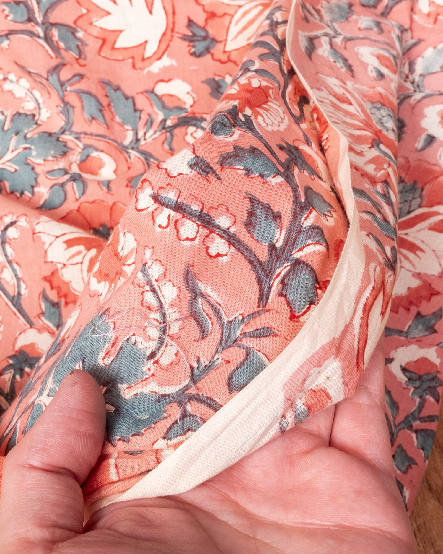 木版染めとは、ウッドブロック(木版)を用いて一つ一つ模様を染めこんだ優雅で贅沢な仕上がりの布です。大量生産には向かない、非常に時間のかかる丁寧な手仕事の賜物といえます。インドは美しい布の宝庫ですが、その中でも特に素敵な一枚に仕上がっています。ハンドメイドのウッドブロックプリントにしか出せない、独特のムラがありとても雰囲気があります。