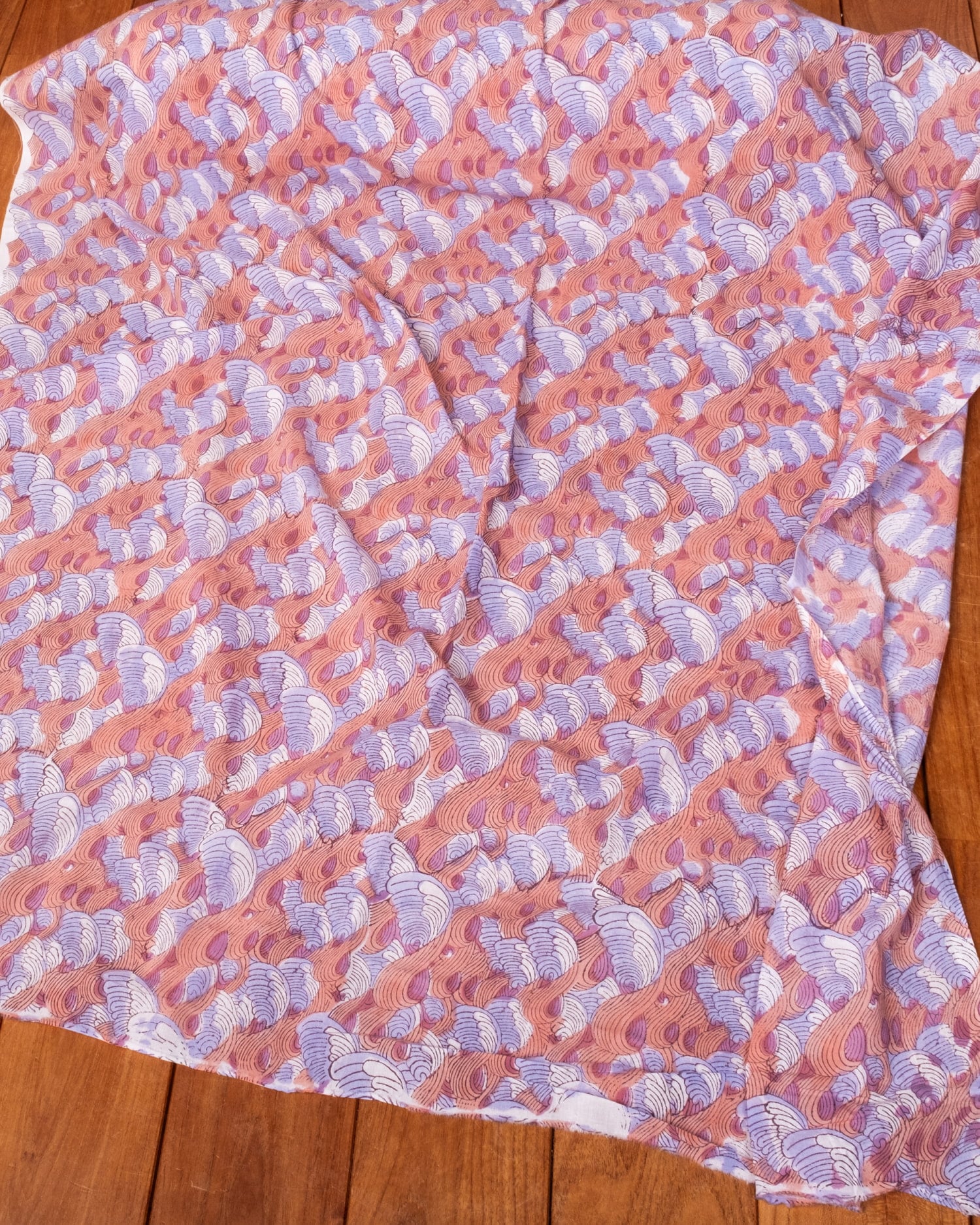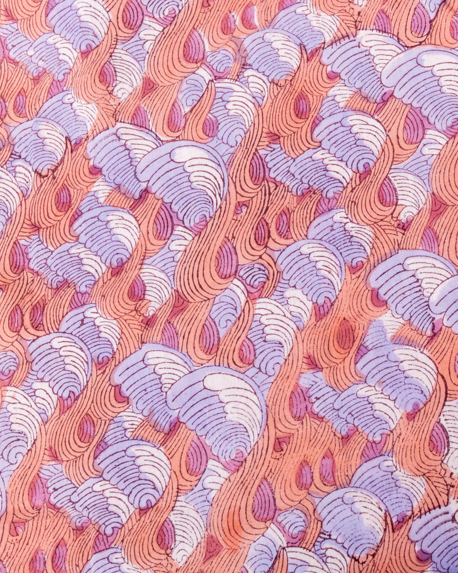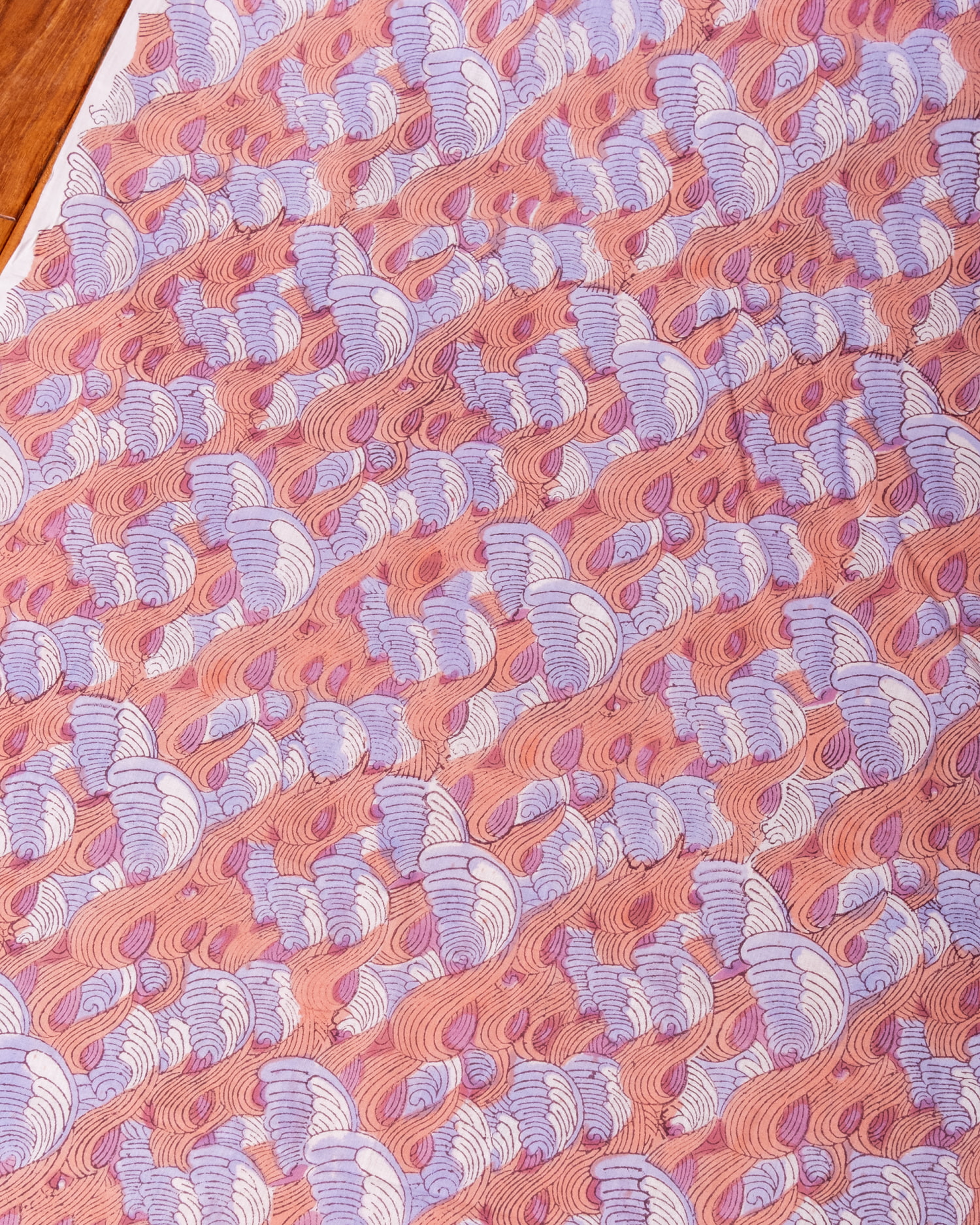 〔1m単位切り売り〕ジャイプル 職人手作り木版染め 色彩美しいボタニカルデザイン〔幅約110cm〕〔サーモン×紫系 波模様〕 おしゃれ 生地 テーブルクロス 手芸素材などへ x 3個