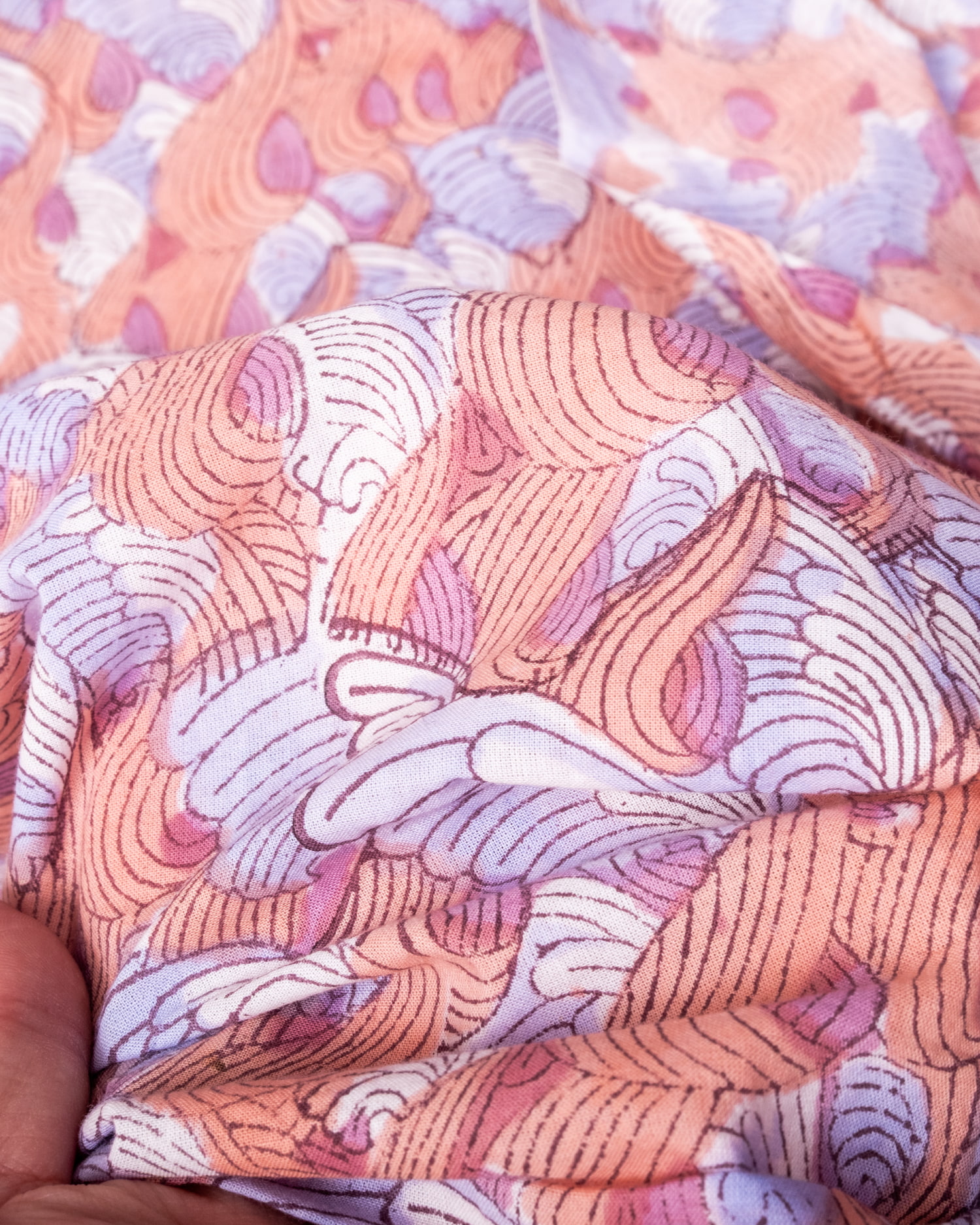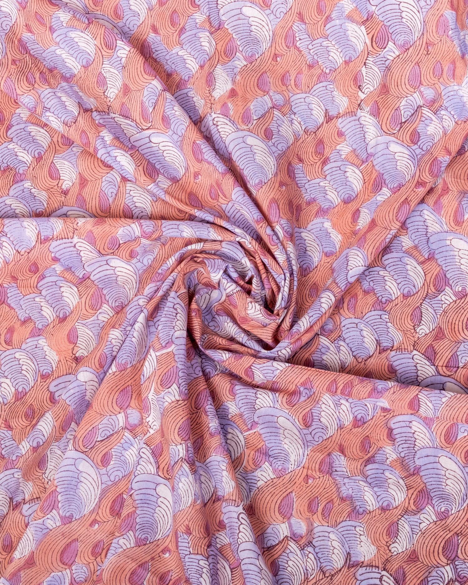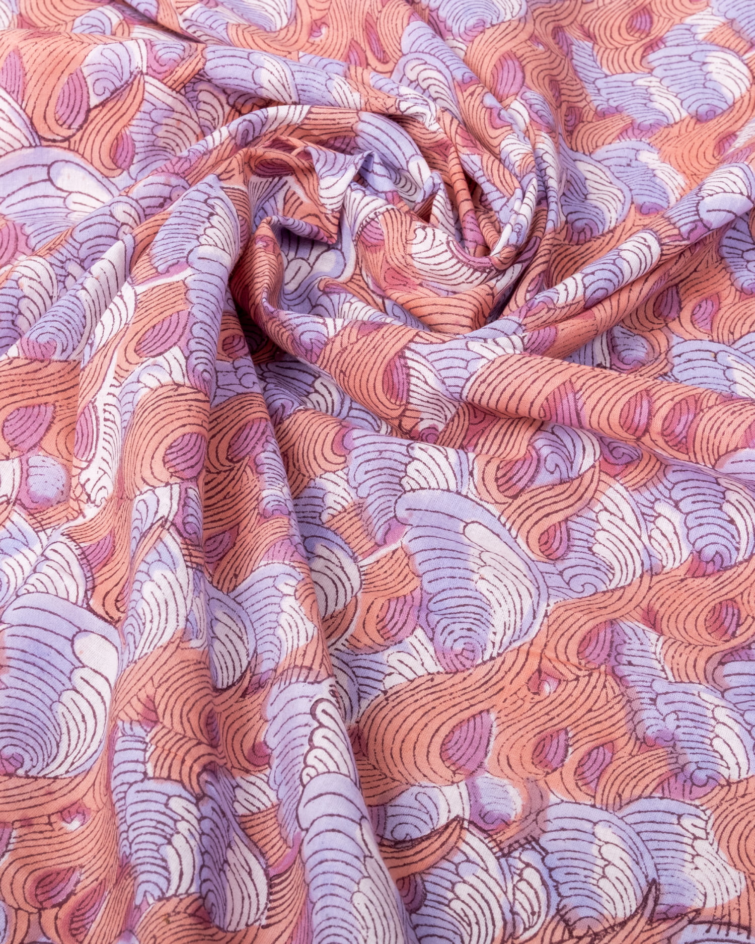 【3個セット】〔1m単位切り売り〕ジャイプル 職人手作り木版染め 色彩美しいボタニカルデザイン〔幅約110cm〕〔サーモン×紫系 波模様〕 おしゃれ 生地 テーブルクロス 手芸素材などへ