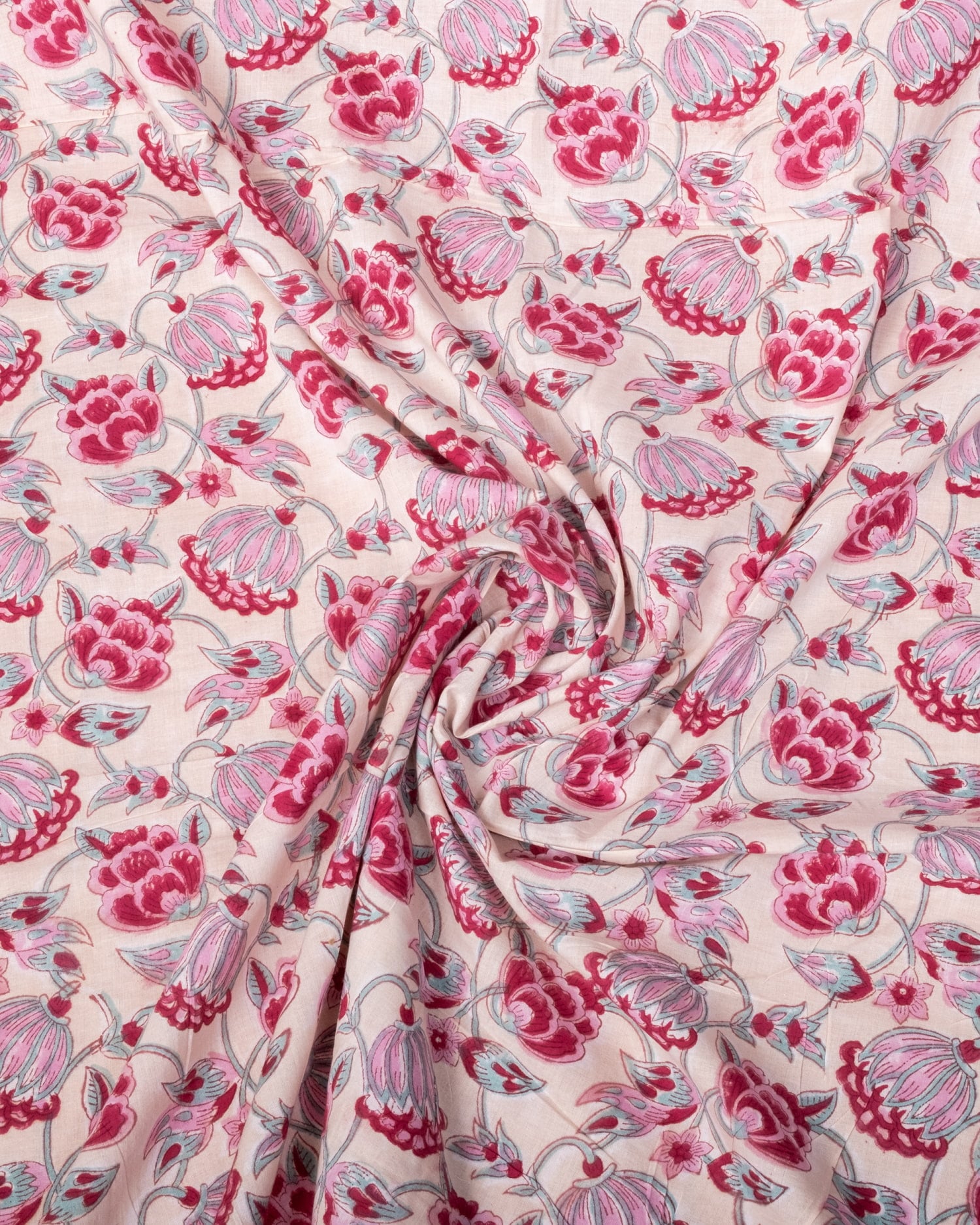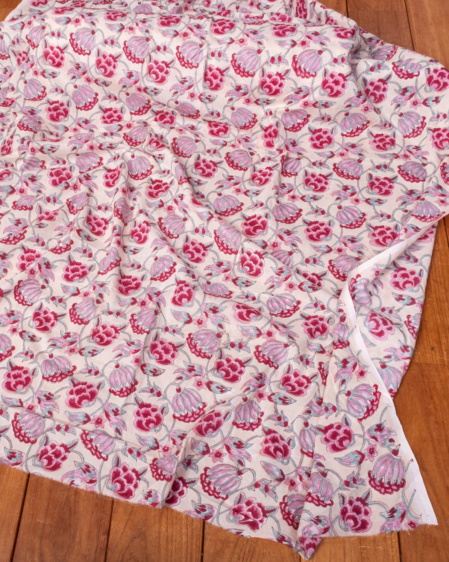 〔1m単位切り売り〕ジャイプル 職人手作り木版染め 色彩美しいボタニカルデザイン〔幅約108cm〕〔薄黄クリーム×ピンク×赤系 更紗柄〕 おしゃれ 生地 テーブルクロス 手芸素材などへ x 3個