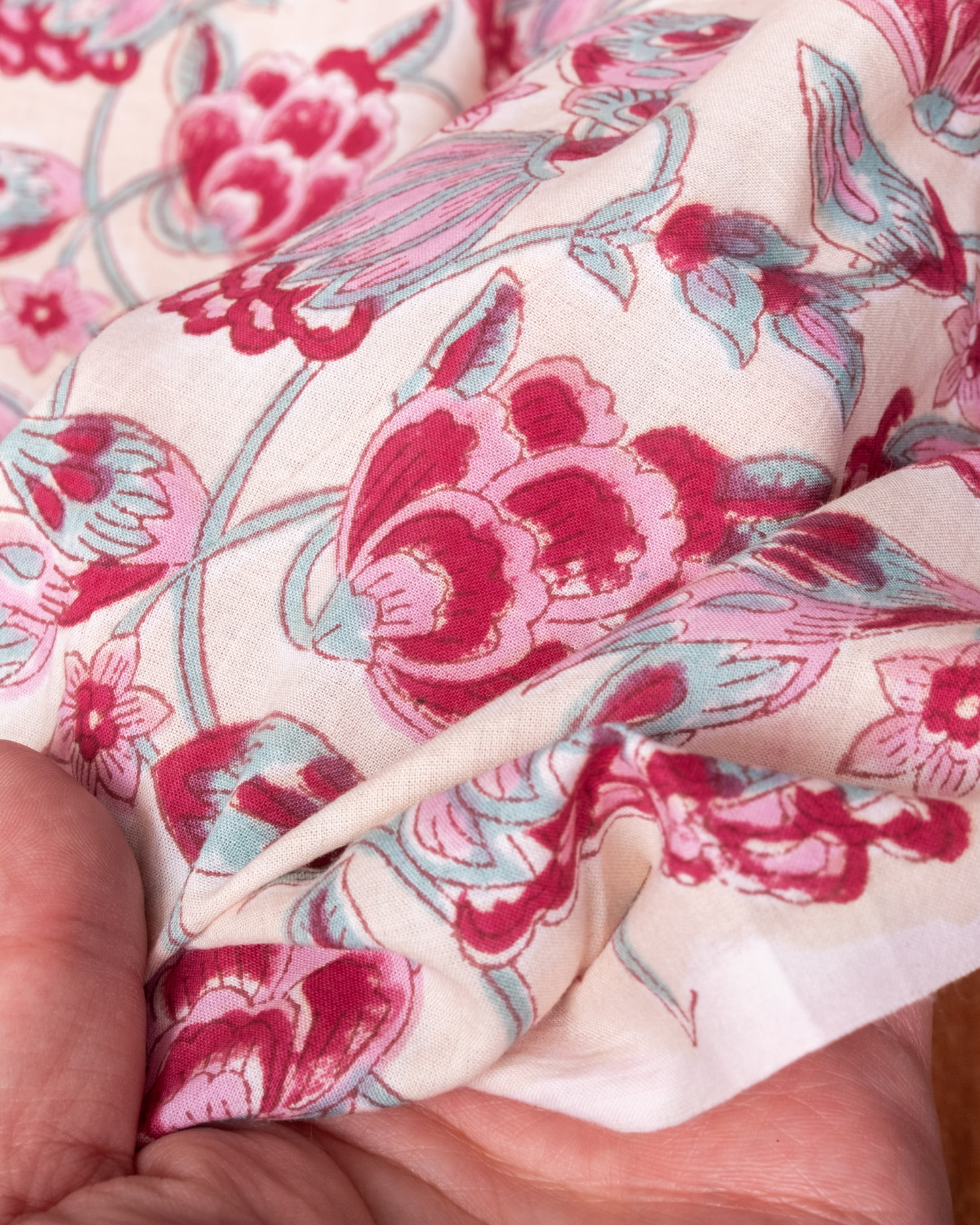 とってもかわいい生地がジャイプルからやってきました。どこかプロヴァンスなテイストも感じさせる、魅力的な色彩とデザイン。職人さんが全て手作りしており、インドらしい木版と鮮やかな色彩がきわだつ、インド綿100%のファブリックです。ナチュラルな風合いは、派手すぎずほどよく上品な雰囲気で、どんなお部屋にも馴染み、相性良くフィットしてくれそうです。