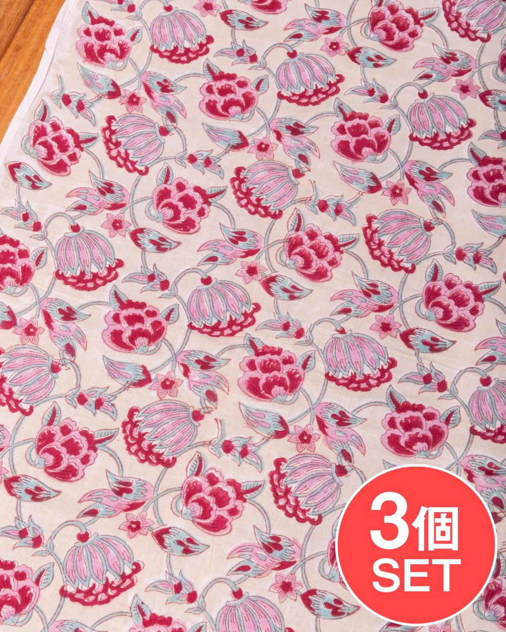 【3個セット】〔1m単位切り売り〕ジャイプル 職人手作り木版染め 色彩美しいボタニカルデザイン〔幅約108cm〕〔薄黄クリーム×ピンク×赤系 更紗柄〕 おしゃれ 生地 テーブルクロス 手芸素材などへ