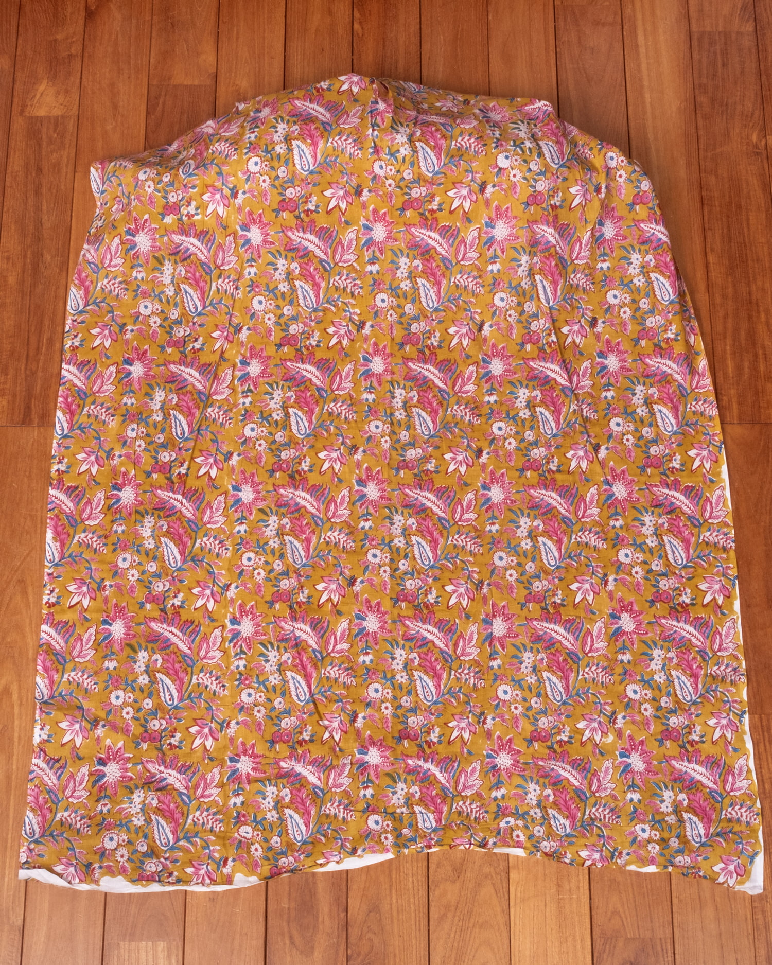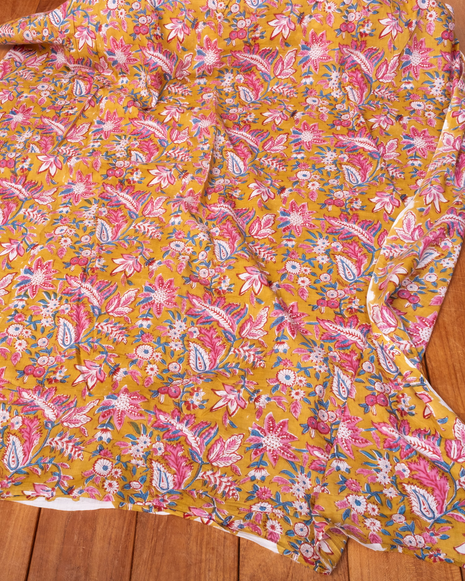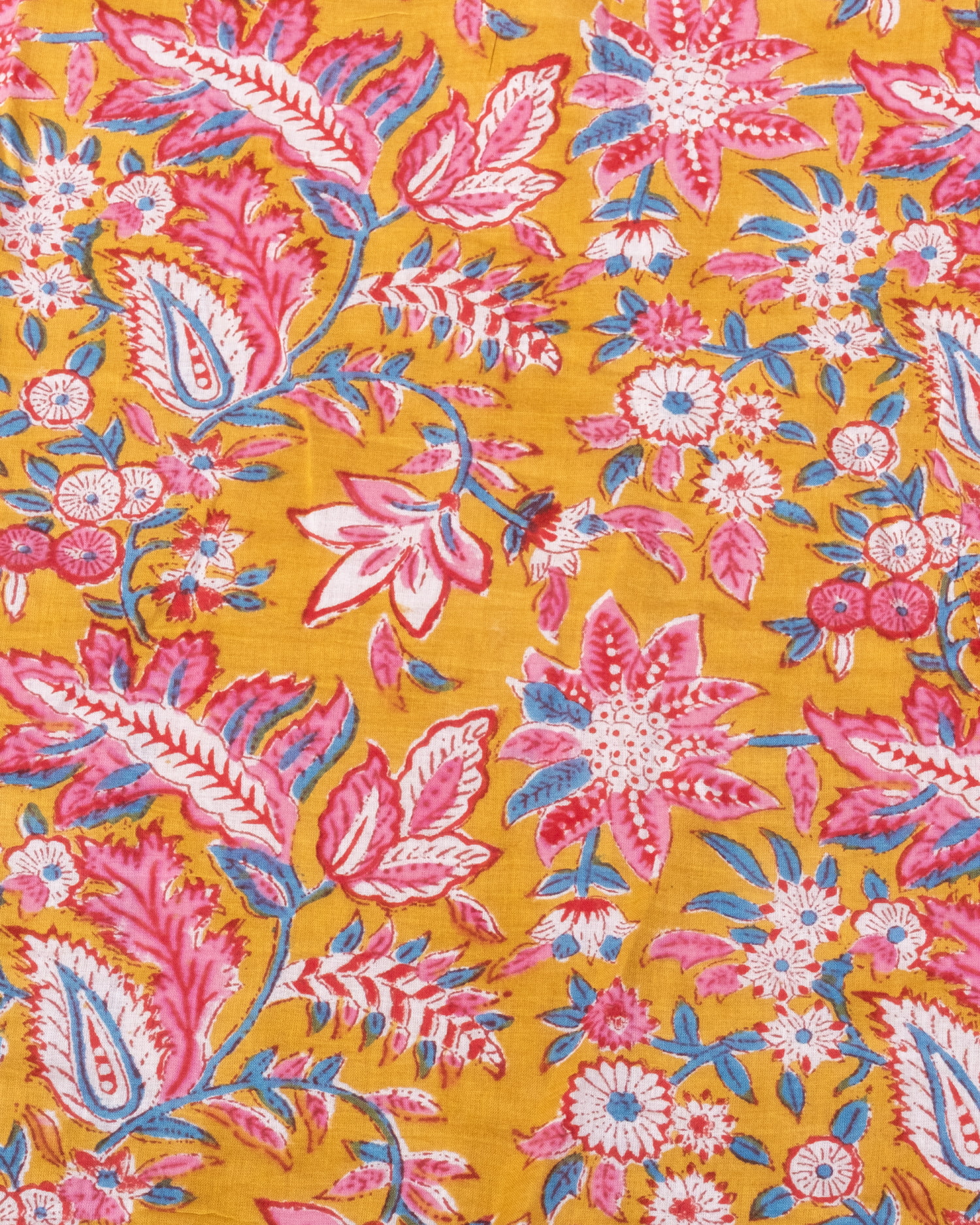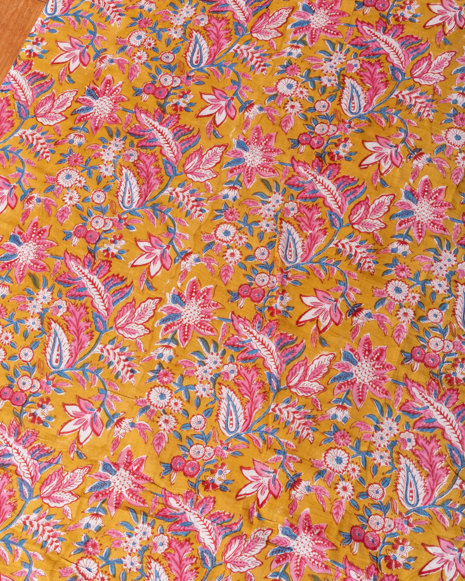 〔1m単位切り売り〕ジャイプル 職人手作り木版染め 色彩美しいボタニカルデザイン〔幅約111cm〕〔黄土×ピンク×青緑系 更紗柄〕 おしゃれ 生地 テーブルクロス 手芸素材などへ x 3個
