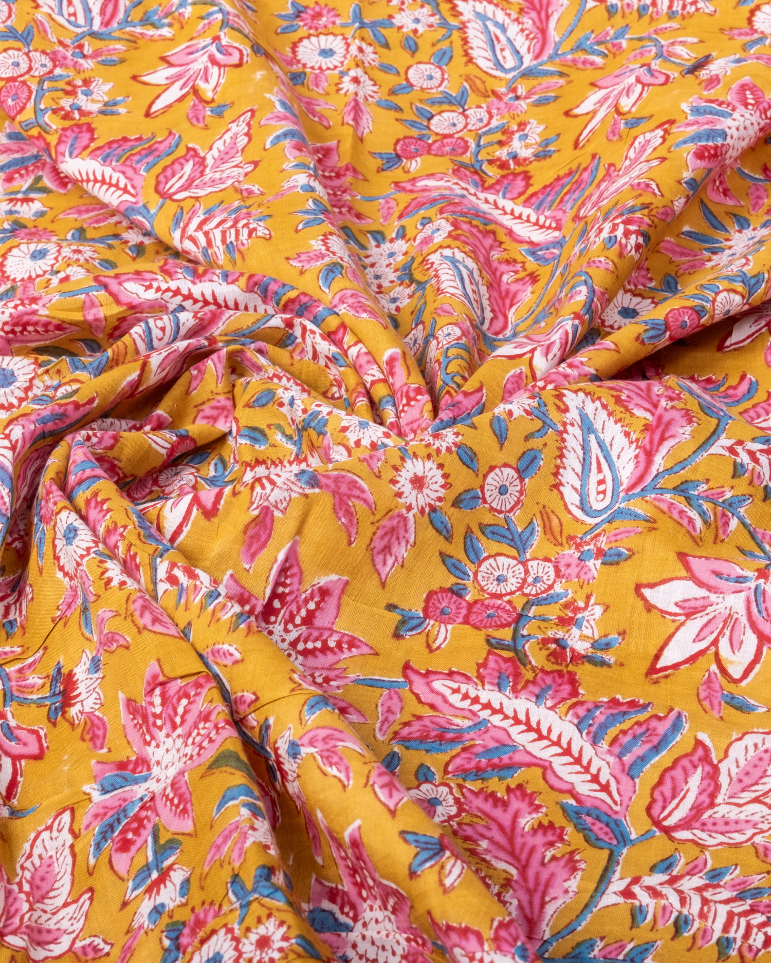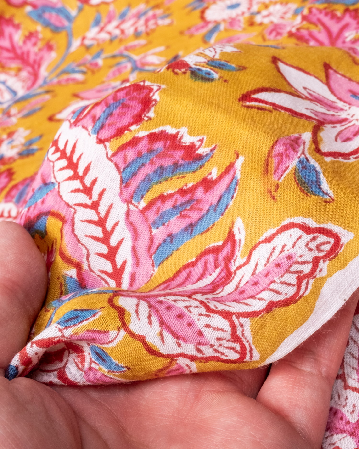 【3個セット】〔1m単位切り売り〕ジャイプル 職人手作り木版染め 色彩美しいボタニカルデザイン〔幅約111cm〕〔黄土×ピンク×青緑系 更紗柄〕 おしゃれ 生地 テーブルクロス 手芸素材などへ