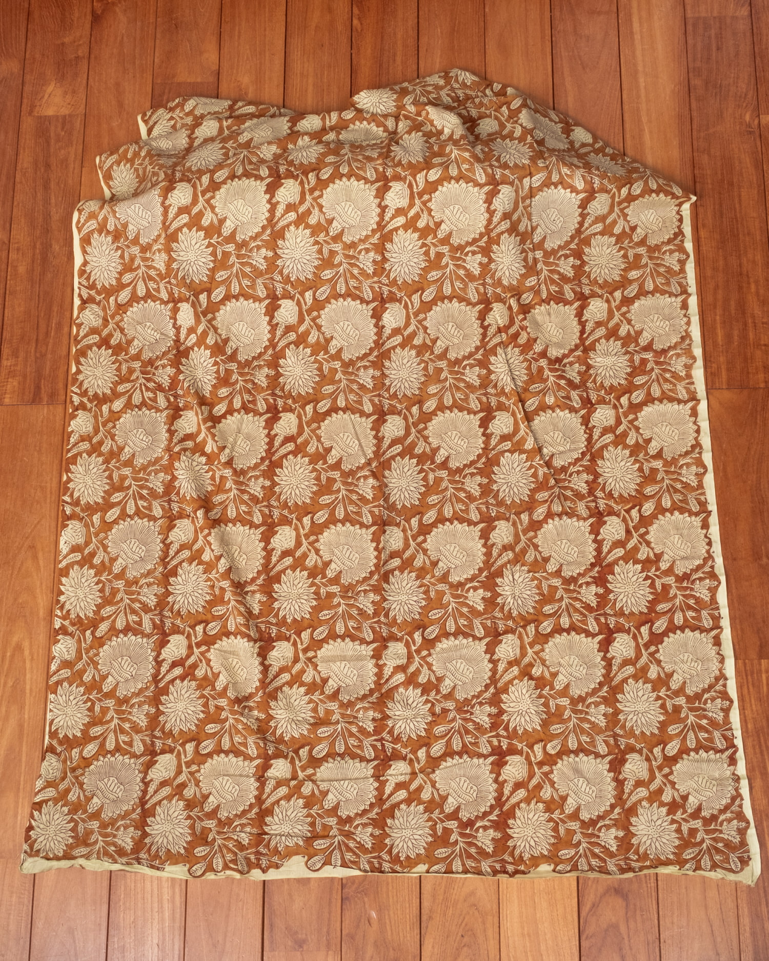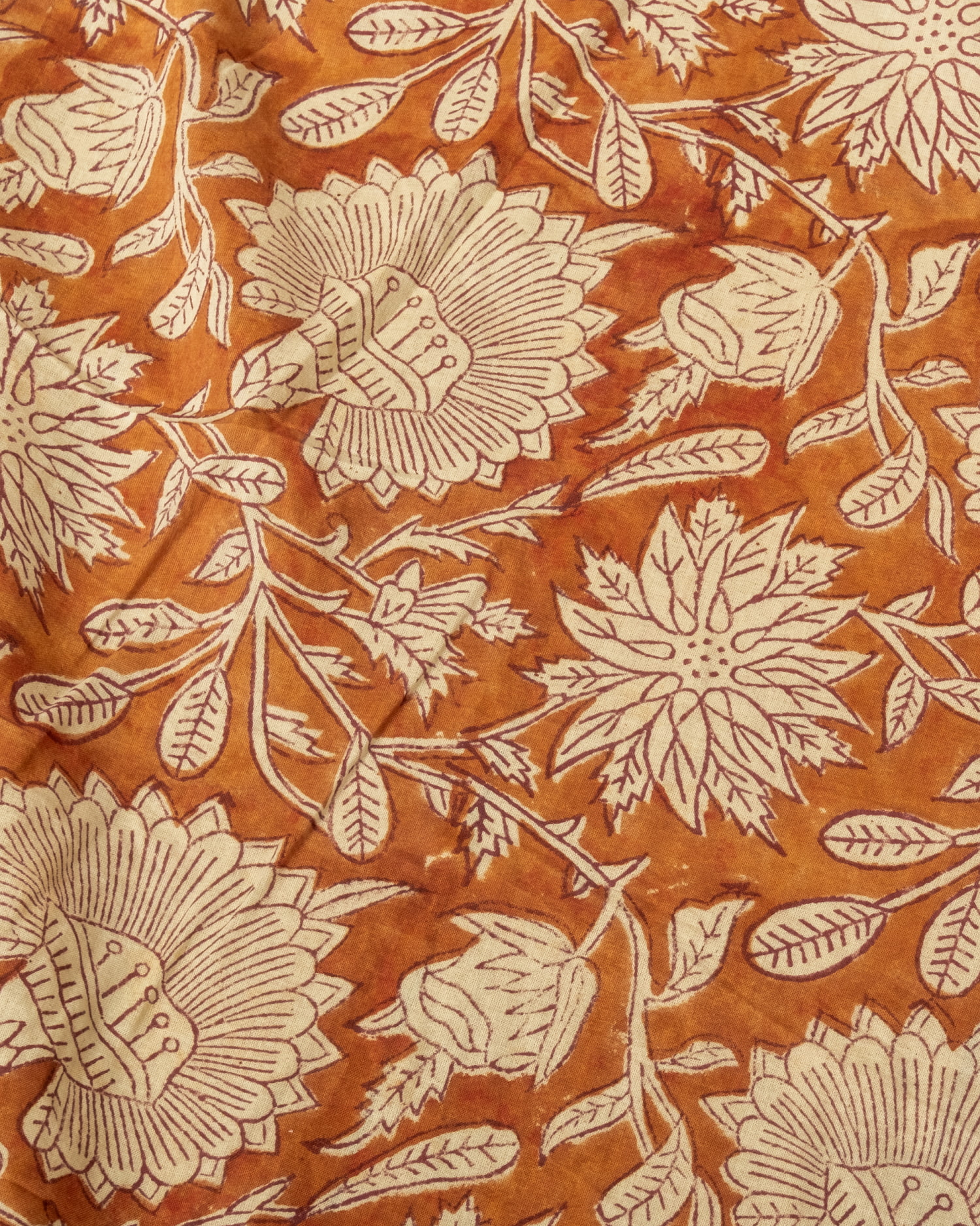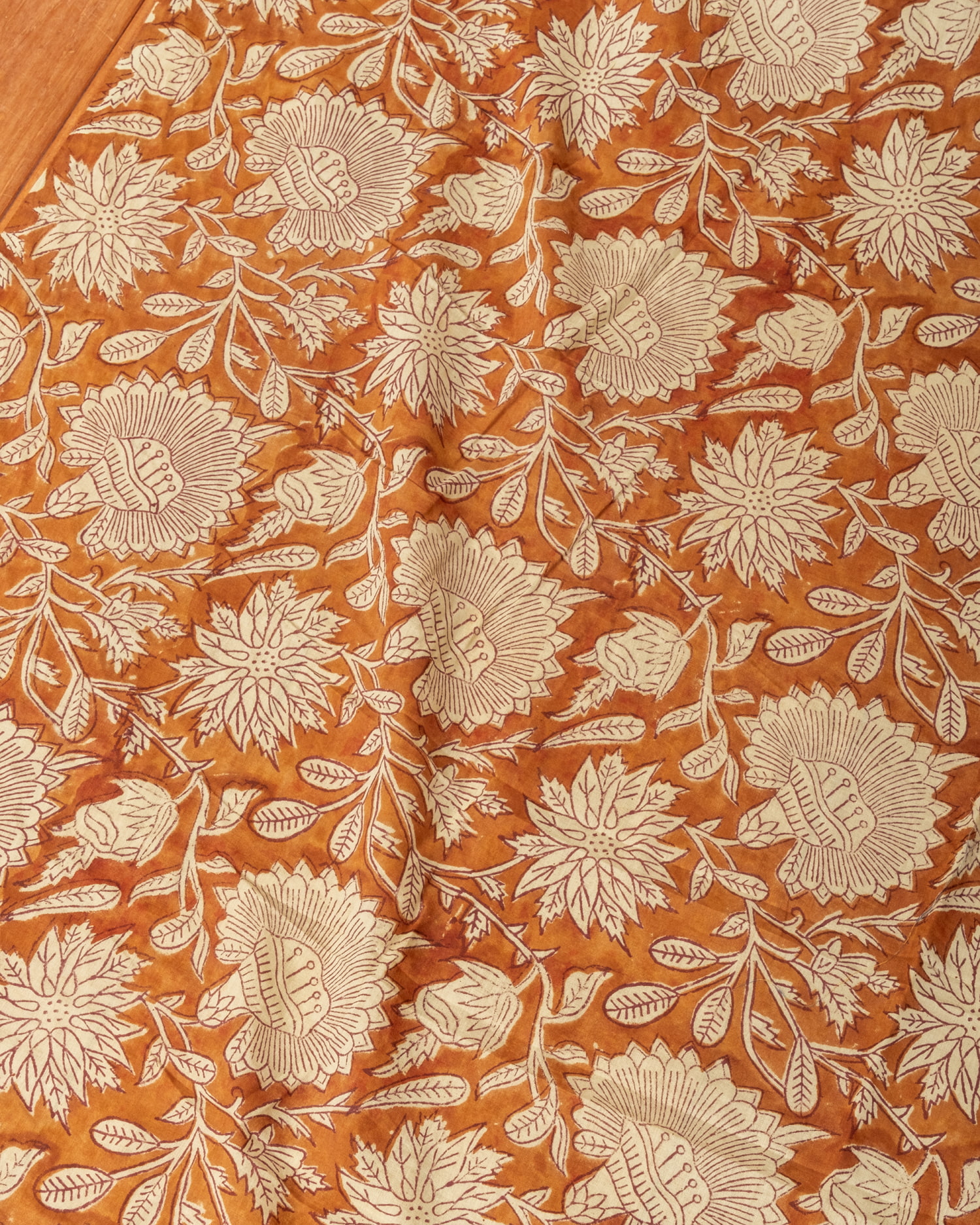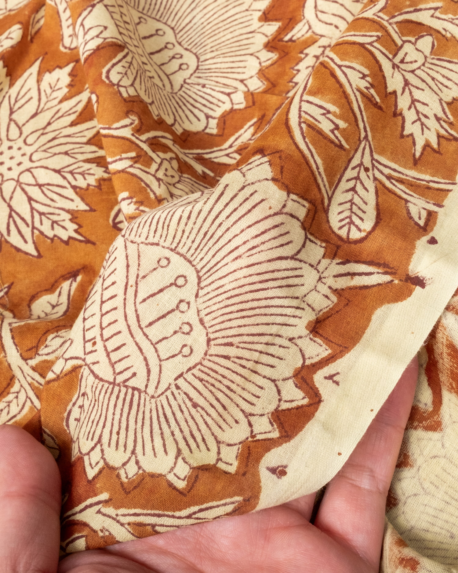 木版染めとは、ウッドブロック(木版)を用いて一つ一つ模様を染めこんだ優雅で贅沢な仕上がりの布です。大量生産には向かない、非常に時間のかかる丁寧な手仕事の賜物といえます。インドは美しい布の宝庫ですが、その中でも特に素敵な一枚に仕上がっています。ハンドメイドのウッドブロックプリントにしか出せない、独特のムラがありとても雰囲気があります。