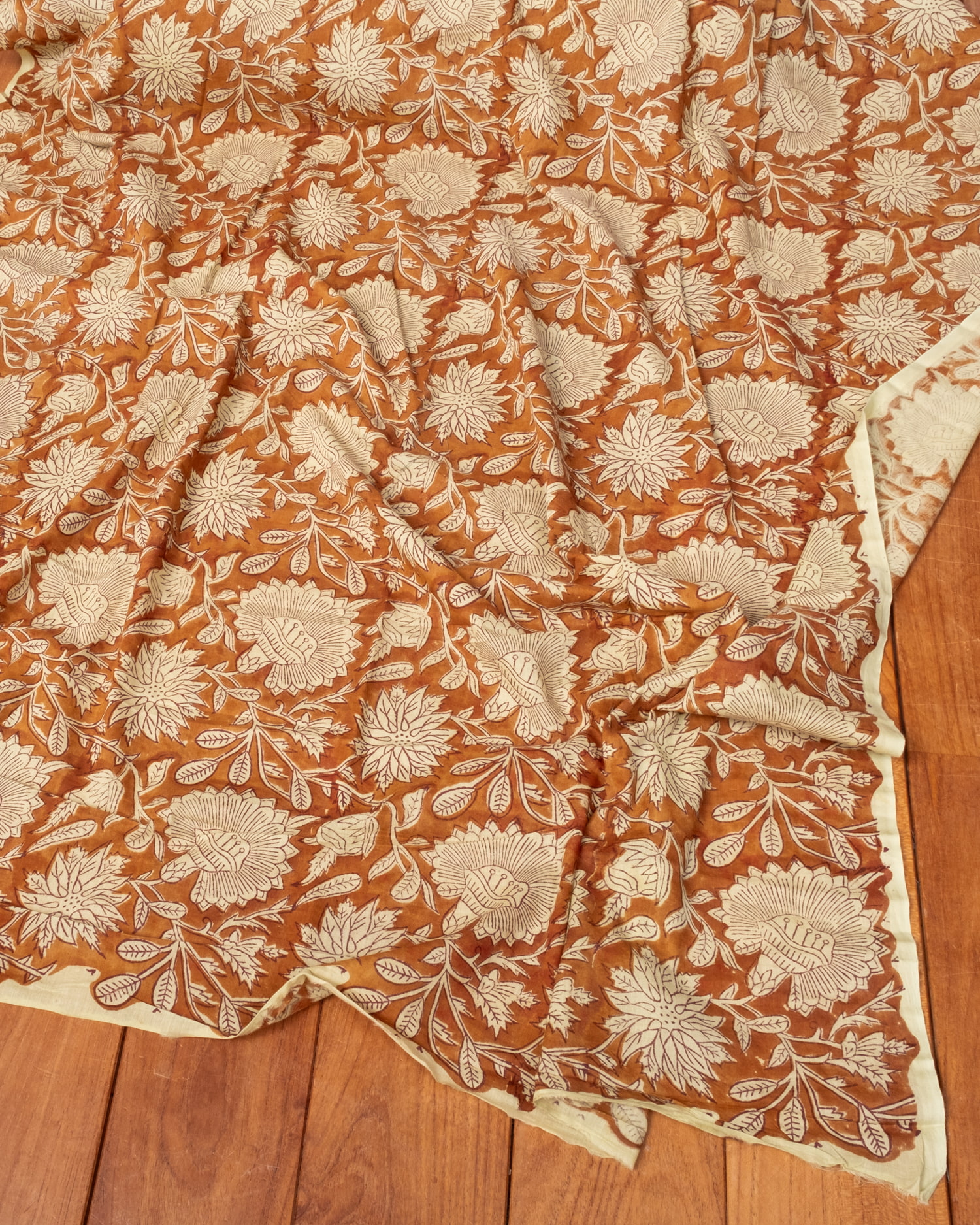 〔1m単位切り売り〕ジャイプル 職人手作り木版染め 色彩美しいボタニカルデザイン〔幅約110cm〕〔ブラウン系 更紗柄〕 おしゃれ 生地 テーブルクロス 手芸素材などへ x 3個