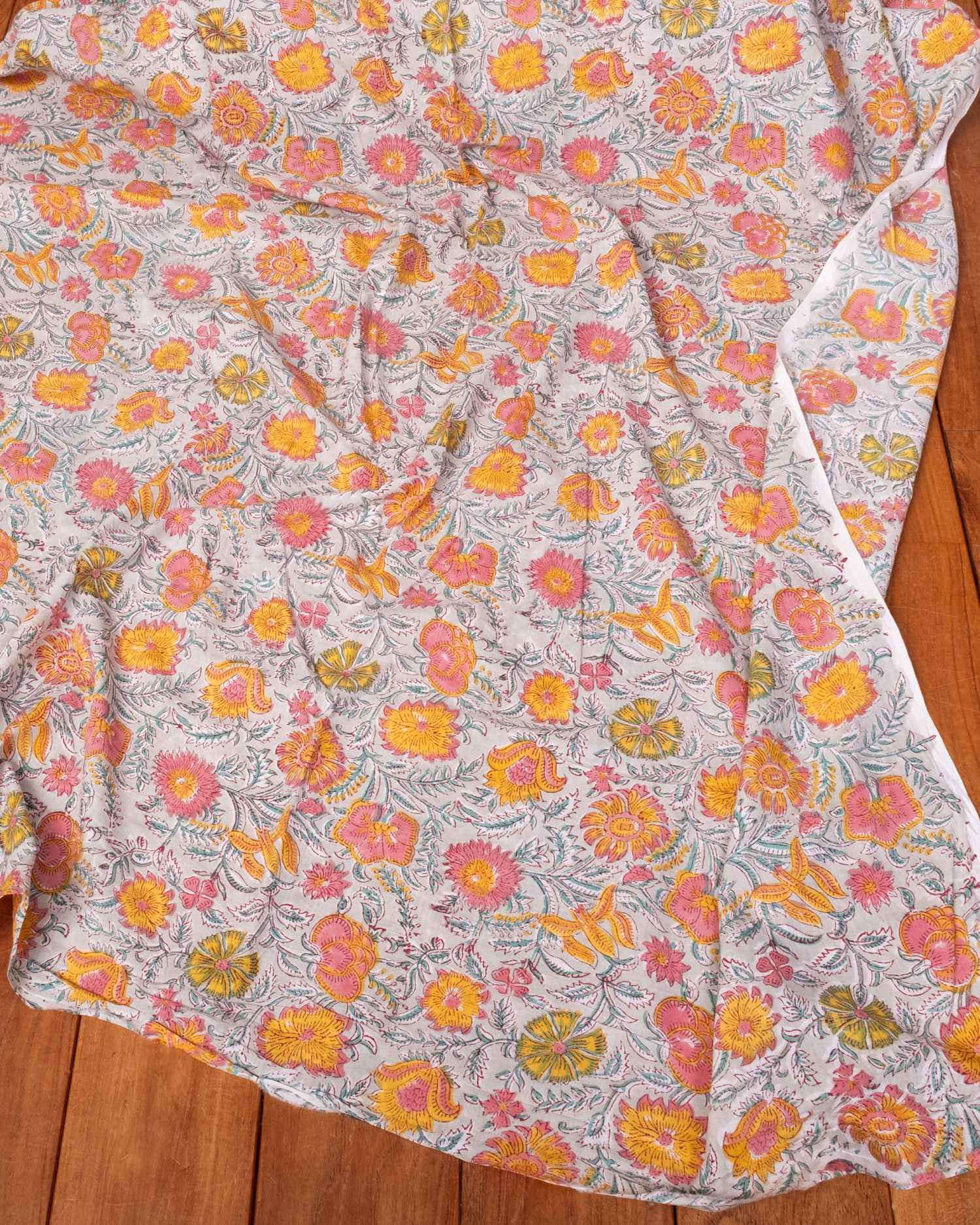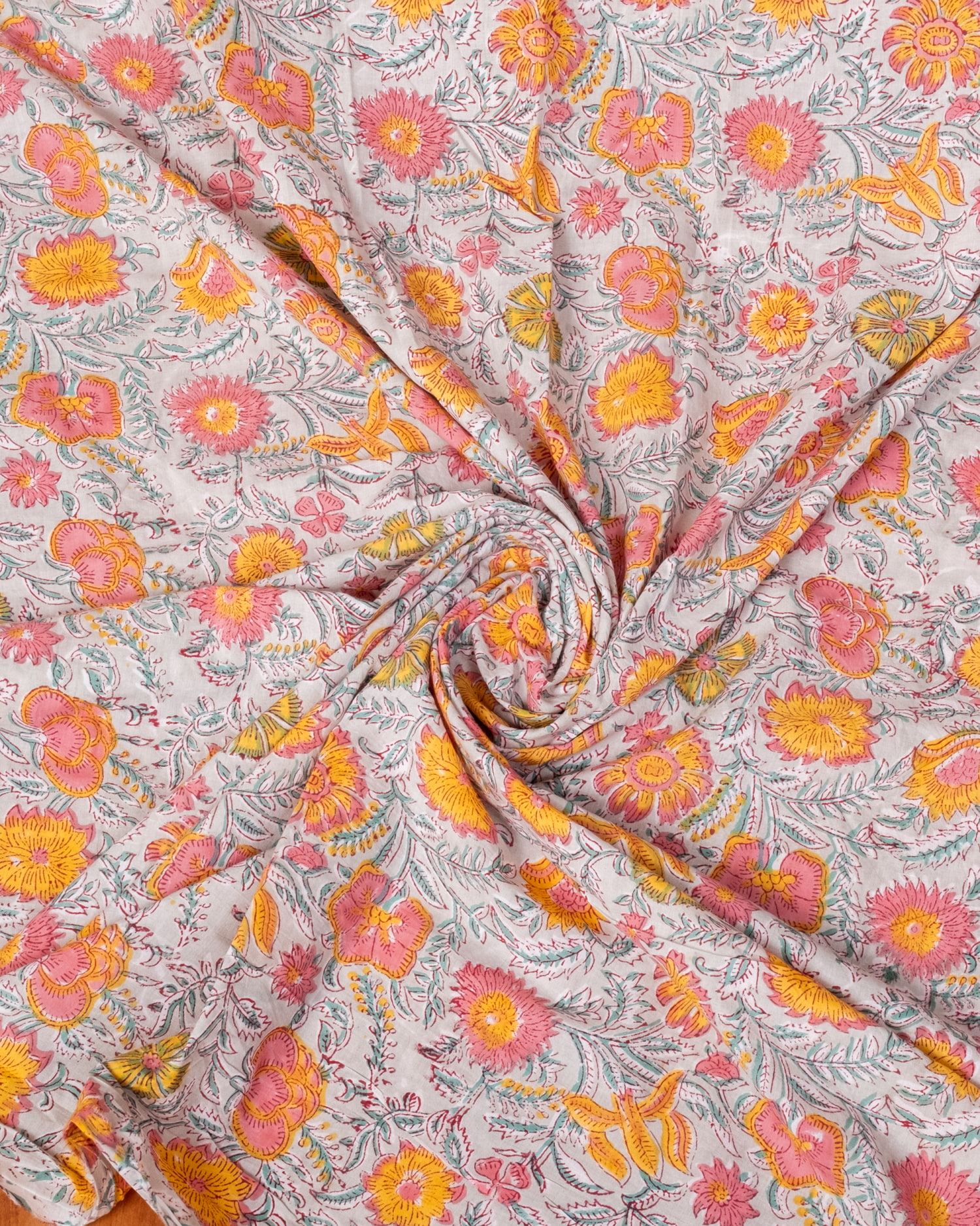 とってもかわいい生地がジャイプルからやってきました。どこかプロヴァンスなテイストも感じさせる、魅力的な色彩とデザイン。職人さんが全て手作りしており、インドらしい木版と鮮やかな色彩がきわだつ、インド綿100%のファブリックです。ナチュラルな風合いは、派手すぎずほどよく上品な雰囲気で、どんなお部屋にも馴染み、相性良くフィットしてくれそうです。