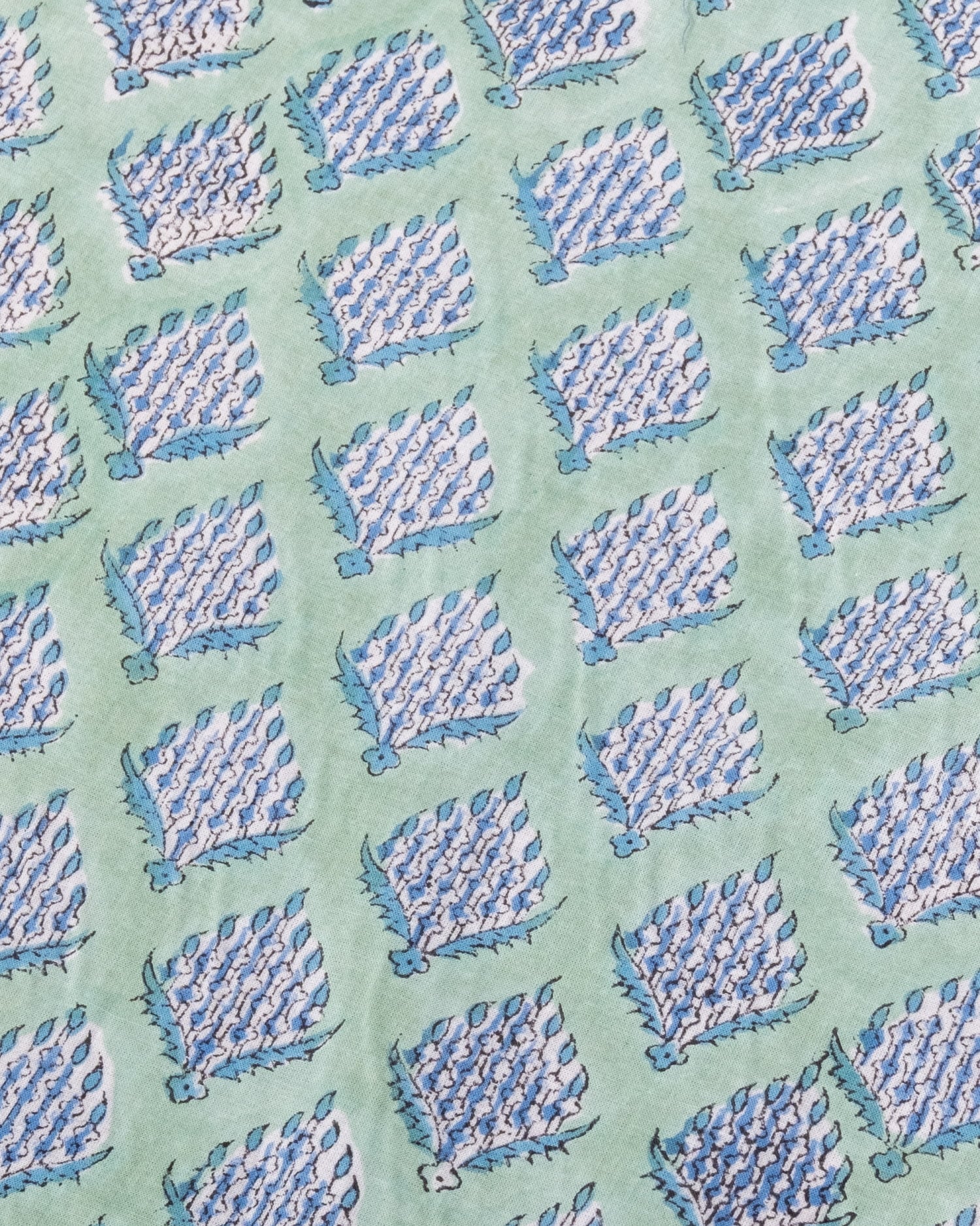 木版染めとは、ウッドブロック(木版)を用いて一つ一つ模様を染めこんだ優雅で贅沢な仕上がりの布です。大量生産には向かない、非常に時間のかかる丁寧な手仕事の賜物といえます。インドは美しい布の宝庫ですが、その中でも特に素敵な一枚に仕上がっています。ハンドメイドのウッドブロックプリントにしか出せない、独特のムラがありとても雰囲気があります。