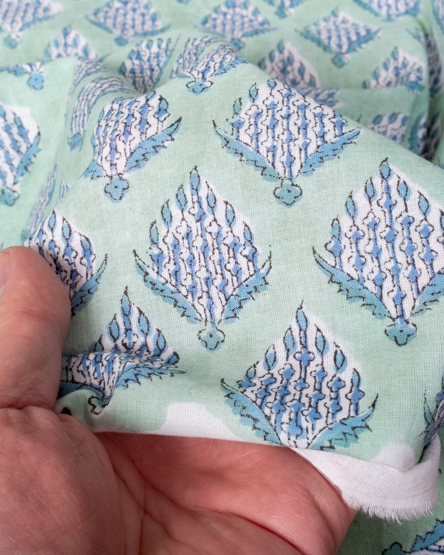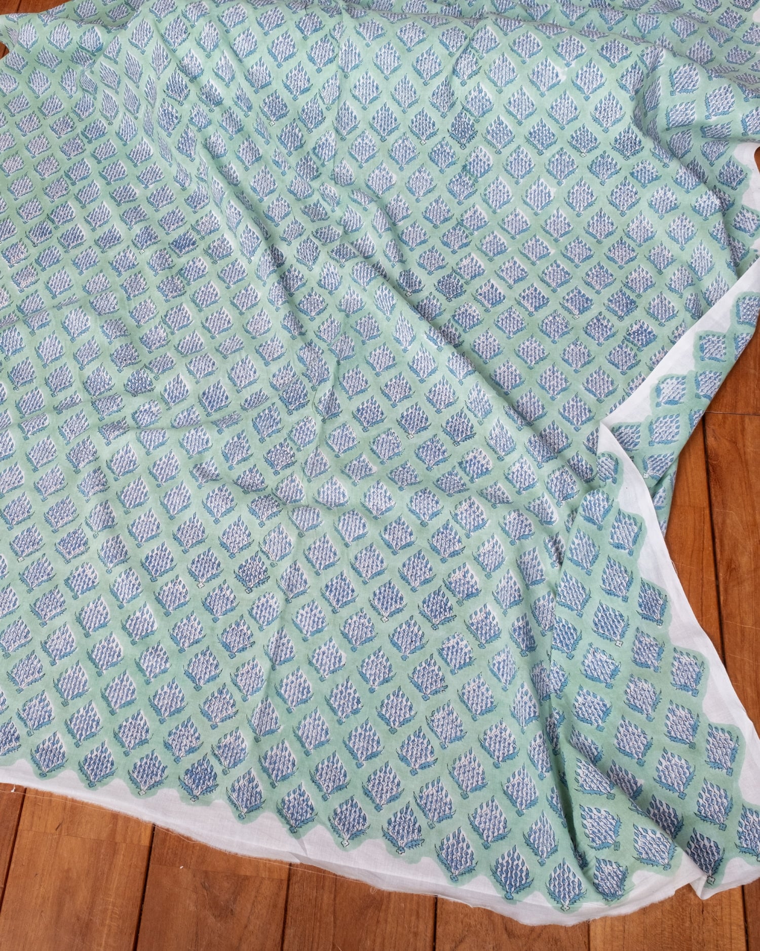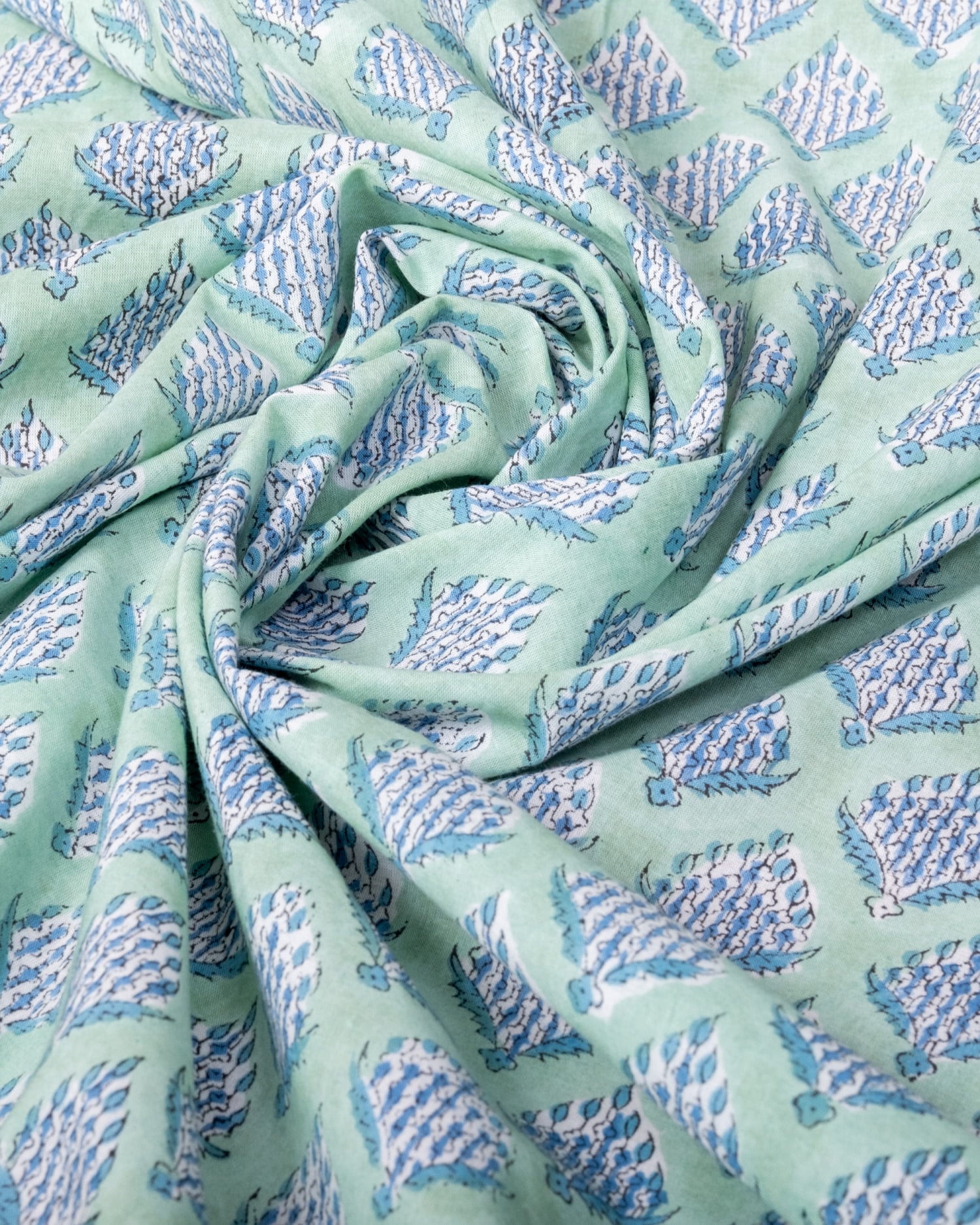 【3個セット】〔1m単位切り売り〕ジャイプル 職人手作り木版染め 色彩美しいボタニカルデザイン〔幅約106cm〕〔ミントグリーン系 小花柄〕 おしゃれ 生地 テーブルクロス 手芸素材などへ