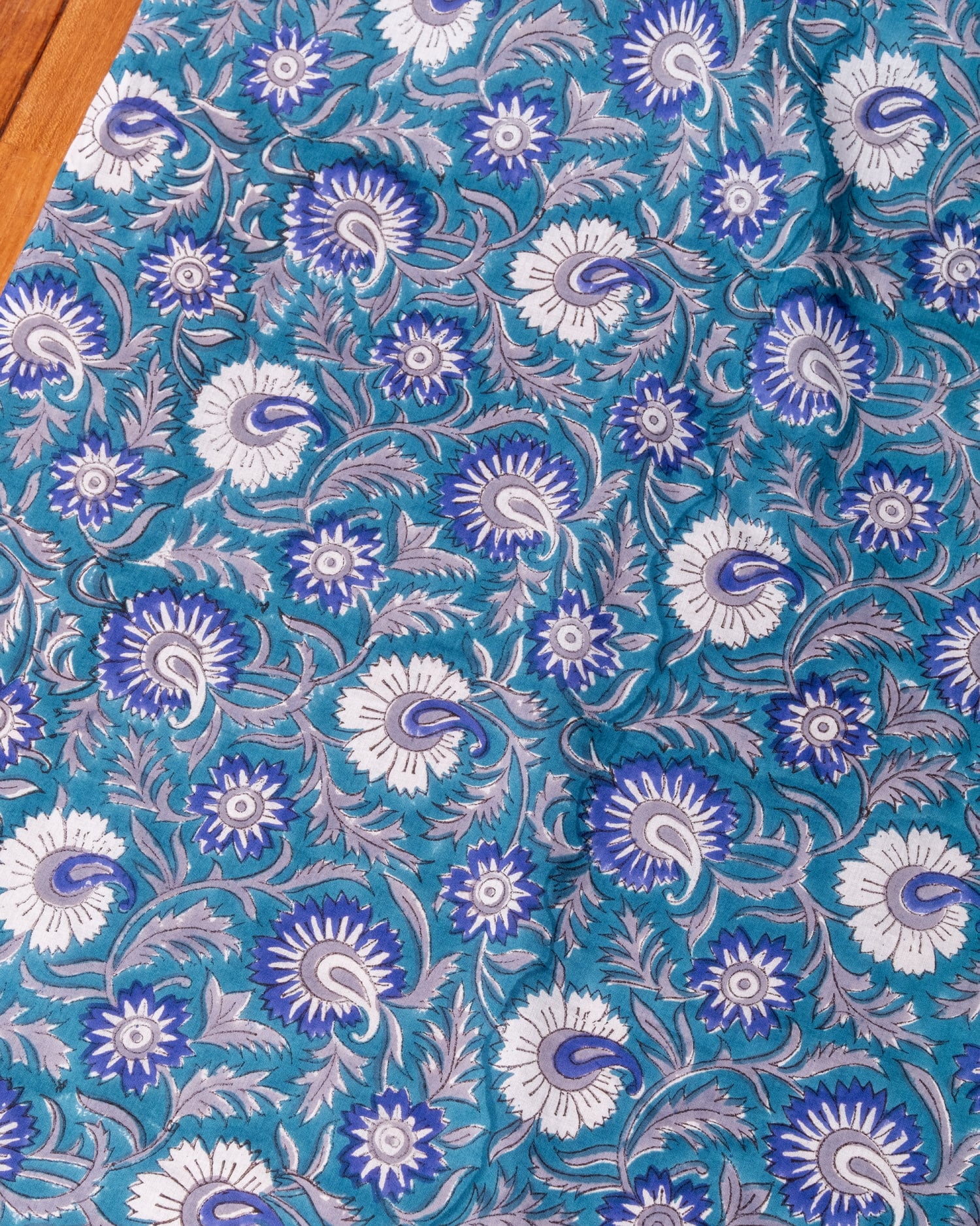 〔1m単位切り売り〕ジャイプル 職人手作り木版染め 色彩美しいボタニカルデザイン〔幅約108cm〕〔青緑系 更紗柄〕 おしゃれ 生地 テーブルクロス 手芸素材などへ x 3個