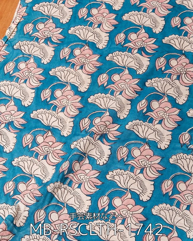 〔1m単位切り売り〕ジャイプル 職人手作り木版染め 色彩美しいボタニカルデザイン〔幅約108cm〕〔青緑系 ロータス柄〕 おしゃれ 生地 テーブルクロス 手芸素材などへ x 3個