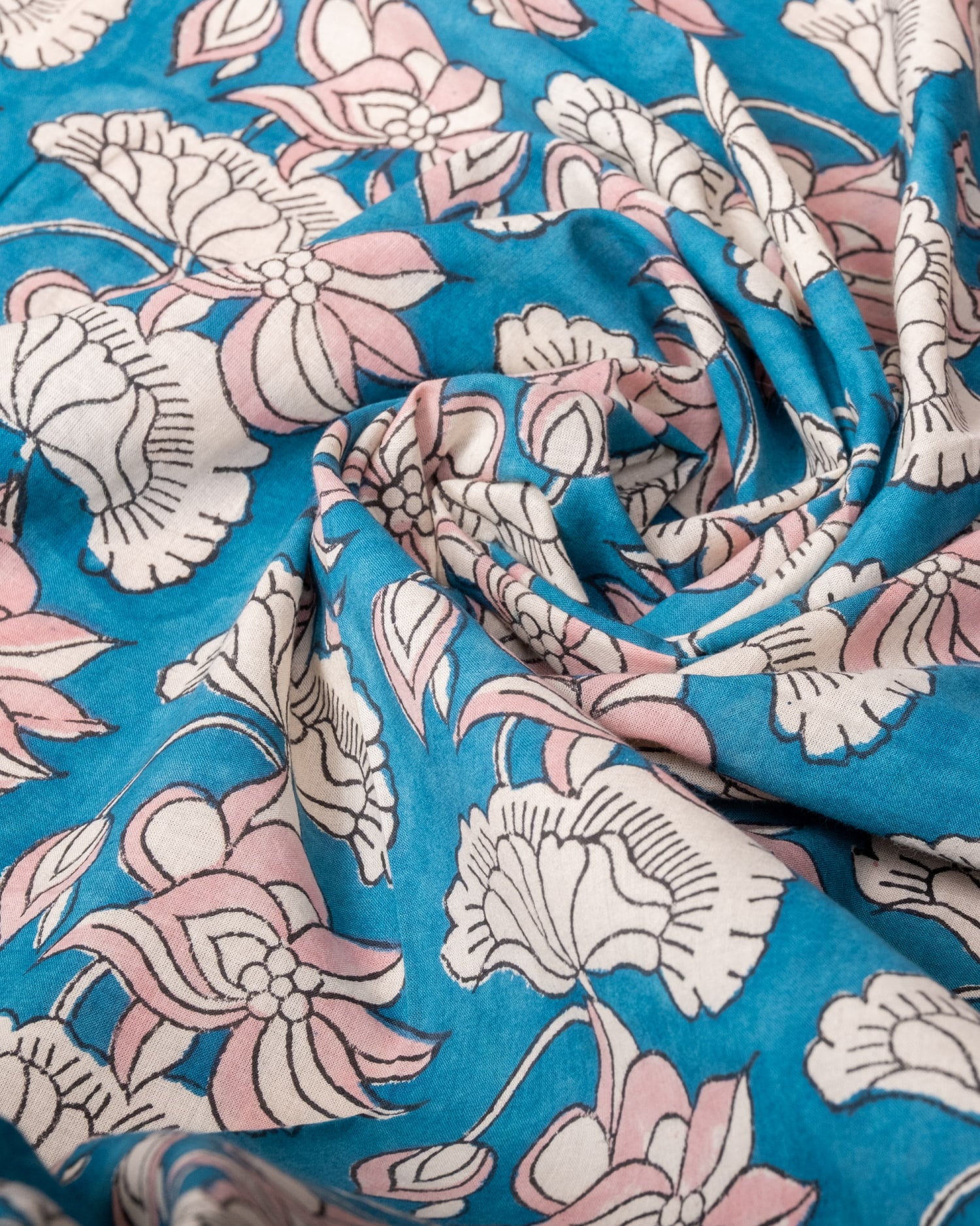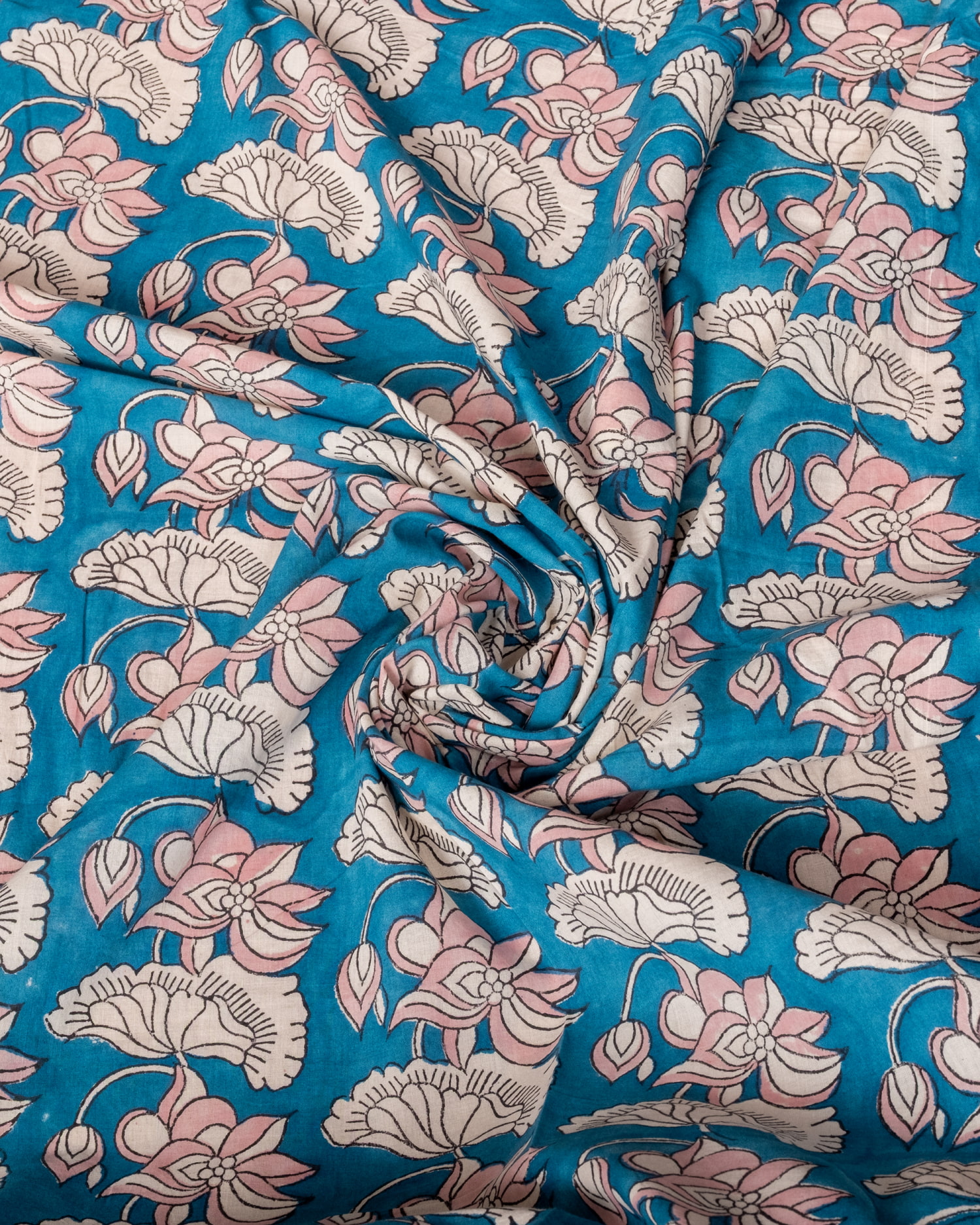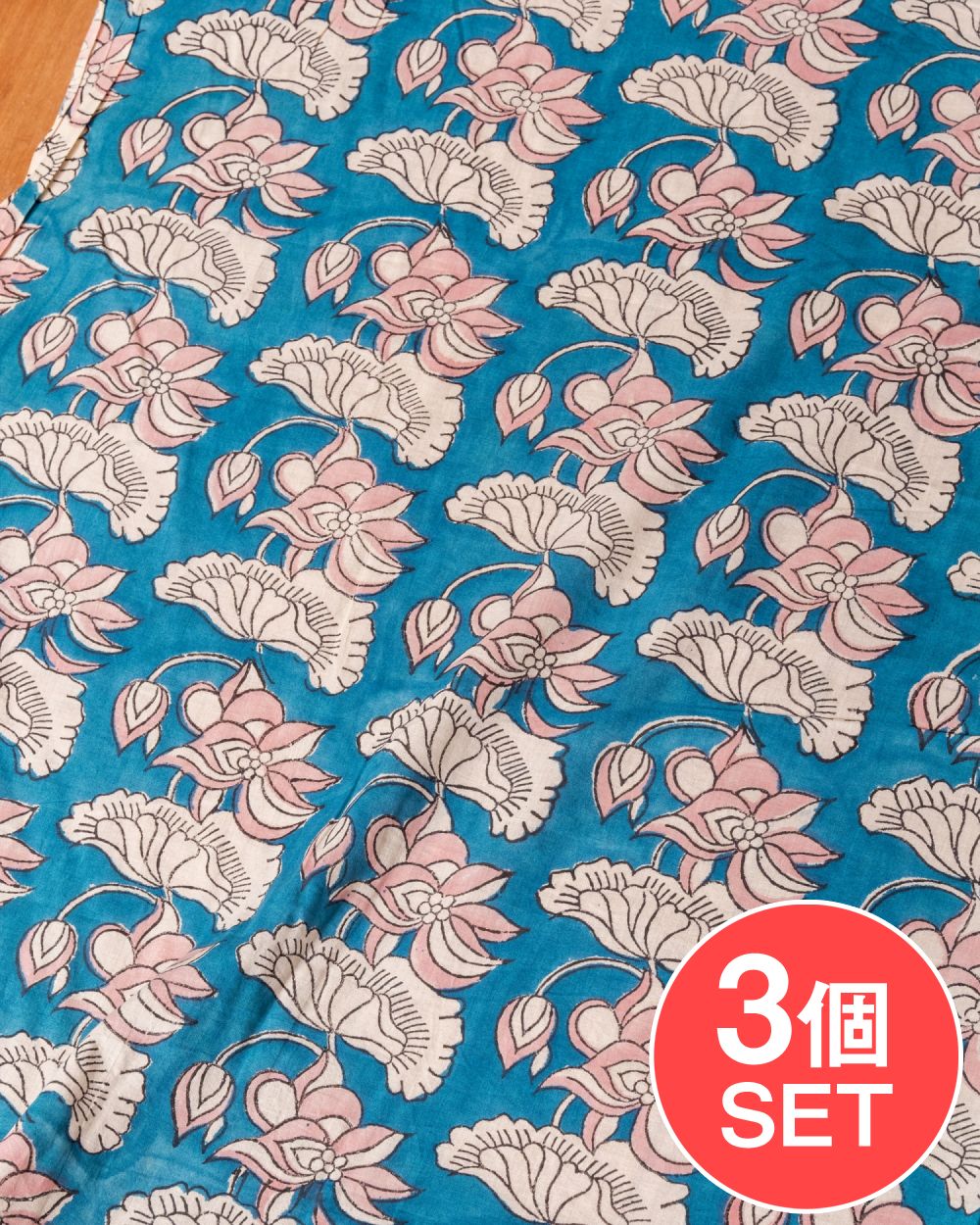 【3個セット】〔1m単位切り売り〕ジャイプル 職人手作り木版染め 色彩美しいボタニカルデザイン〔幅約108cm〕〔青緑系 ロータス柄〕 おしゃれ 生地 テーブルクロス 手芸素材などへ