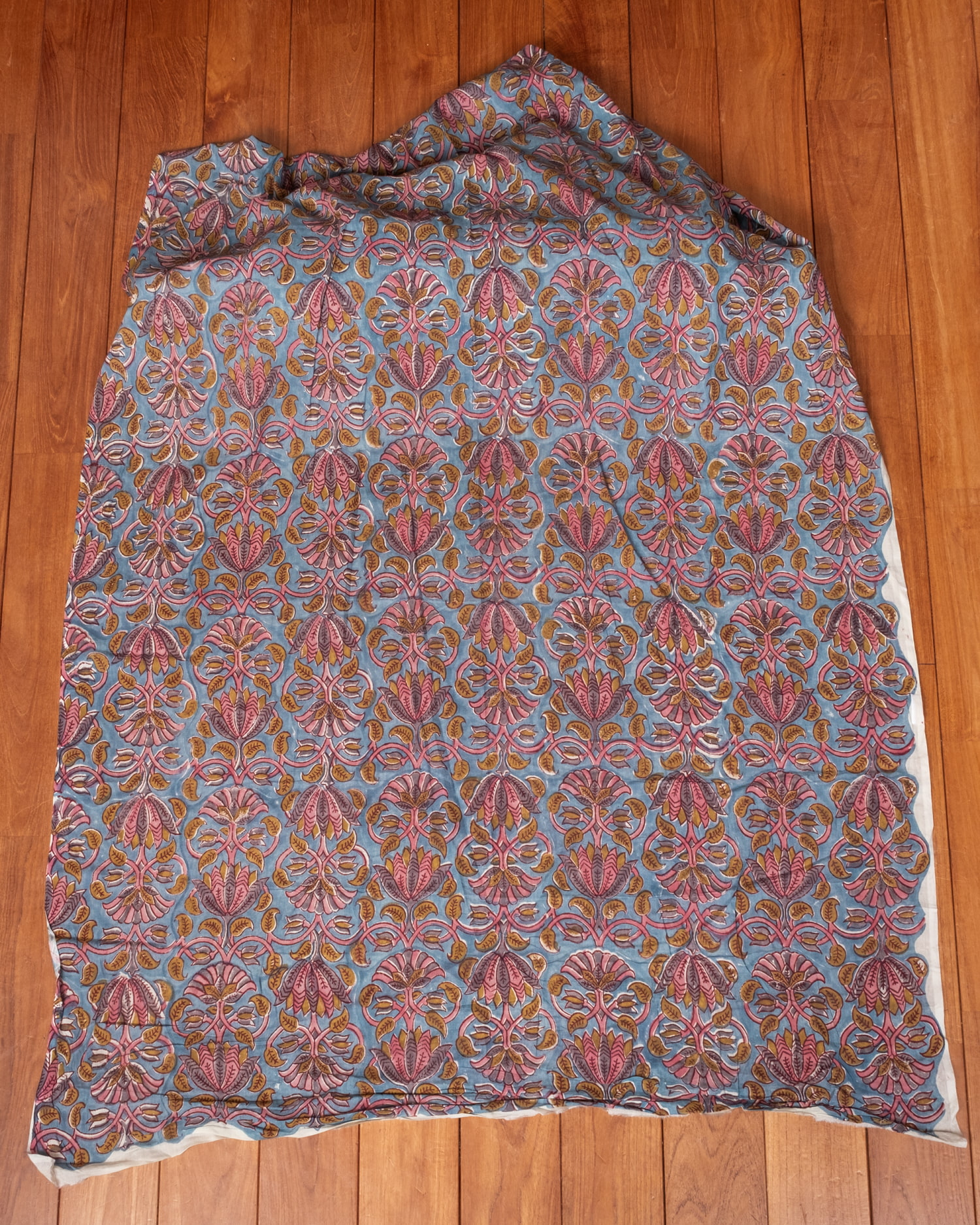 木版染めとは、ウッドブロック(木版)を用いて一つ一つ模様を染めこんだ優雅で贅沢な仕上がりの布です。大量生産には向かない、非常に時間のかかる丁寧な手仕事の賜物といえます。インドは美しい布の宝庫ですが、その中でも特に素敵な一枚に仕上がっています。ハンドメイドのウッドブロックプリントにしか出せない、独特のムラがありとても雰囲気があります。