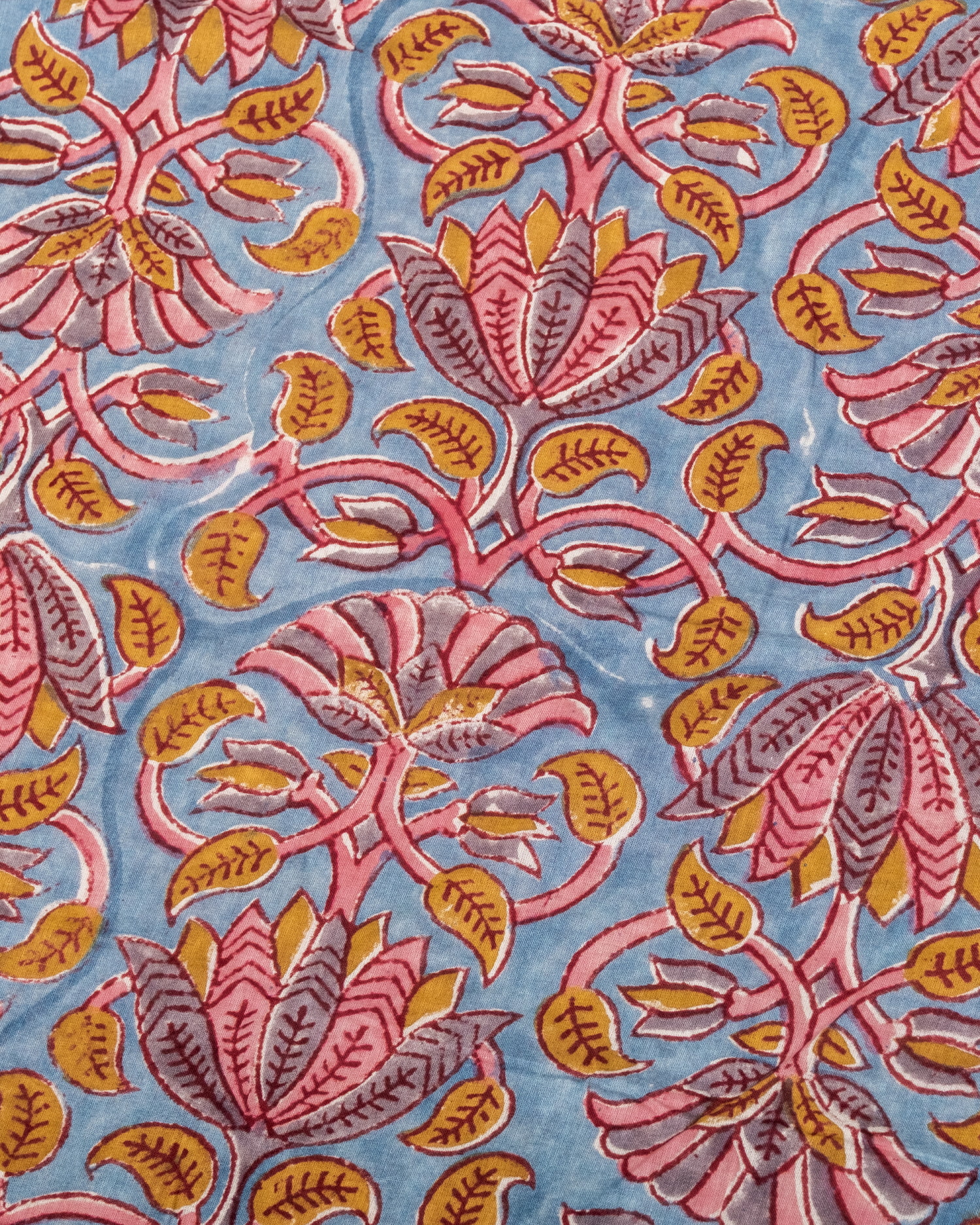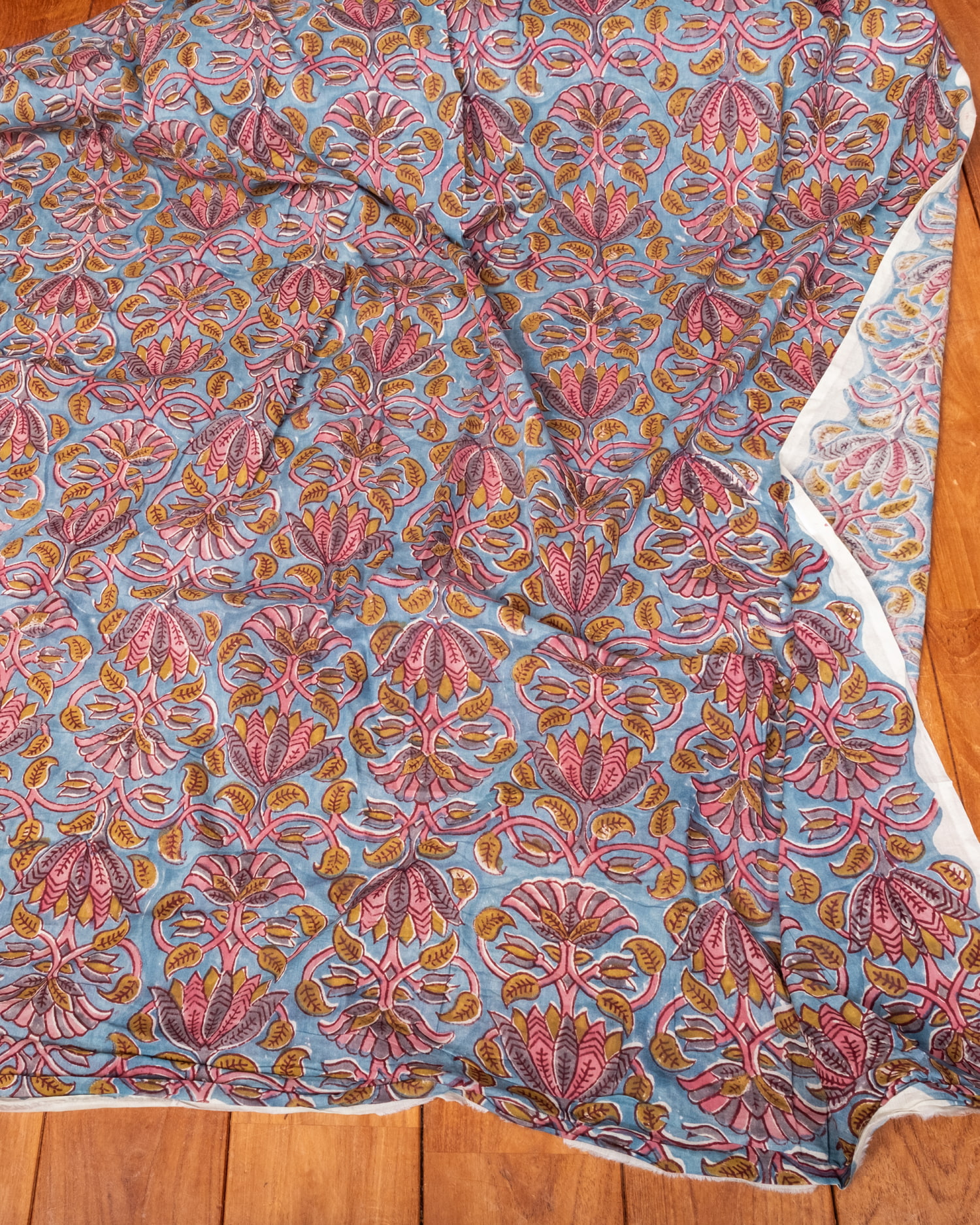 とってもかわいい生地がジャイプルからやってきました。どこかプロヴァンスなテイストも感じさせる、魅力的な色彩とデザイン。職人さんが全て手作りしており、インドらしい木版と鮮やかな色彩がきわだつ、インド綿100%のファブリックです。ナチュラルな風合いは、派手すぎずほどよく上品な雰囲気で、どんなお部屋にも馴染み、相性良くフィットしてくれそうです。