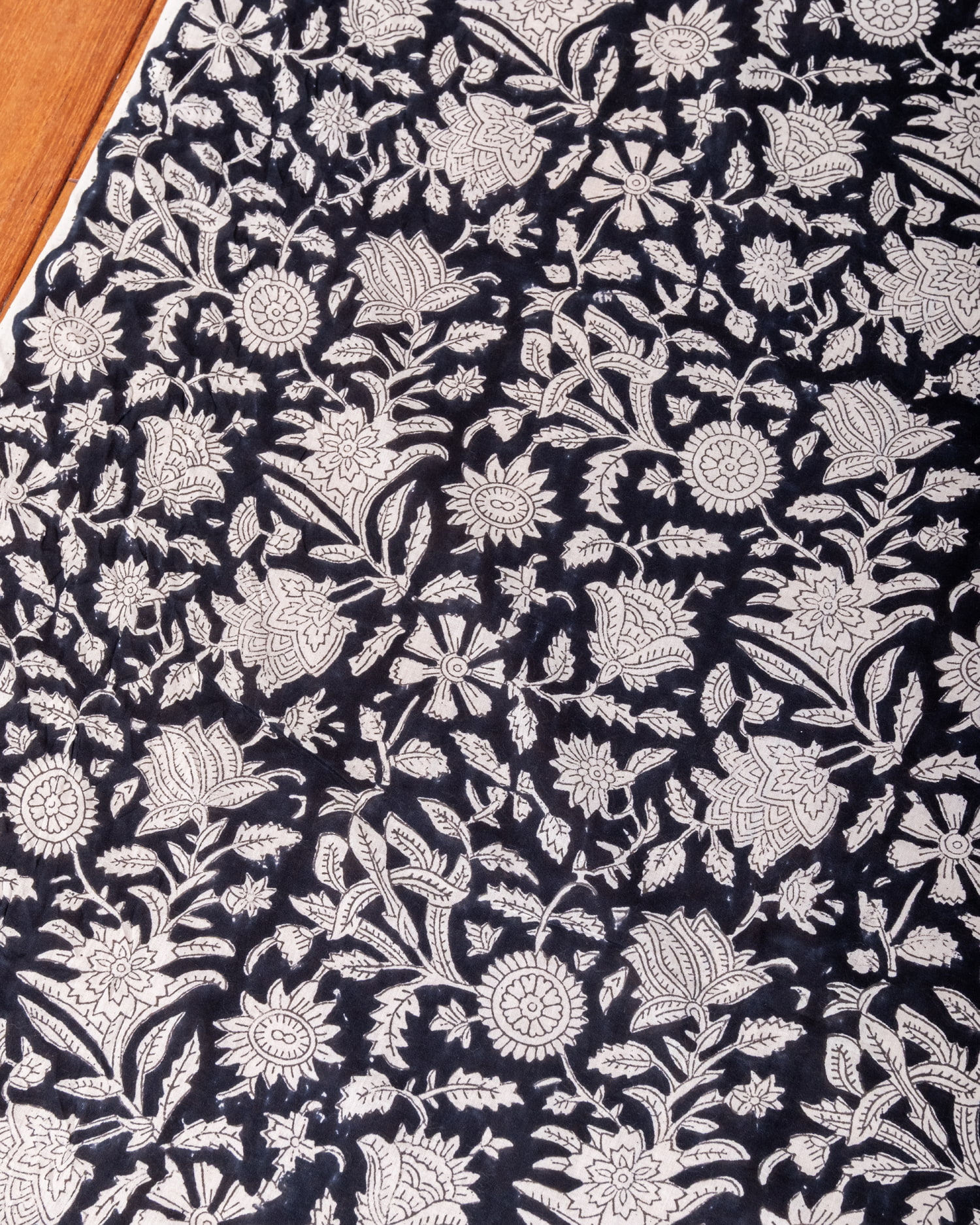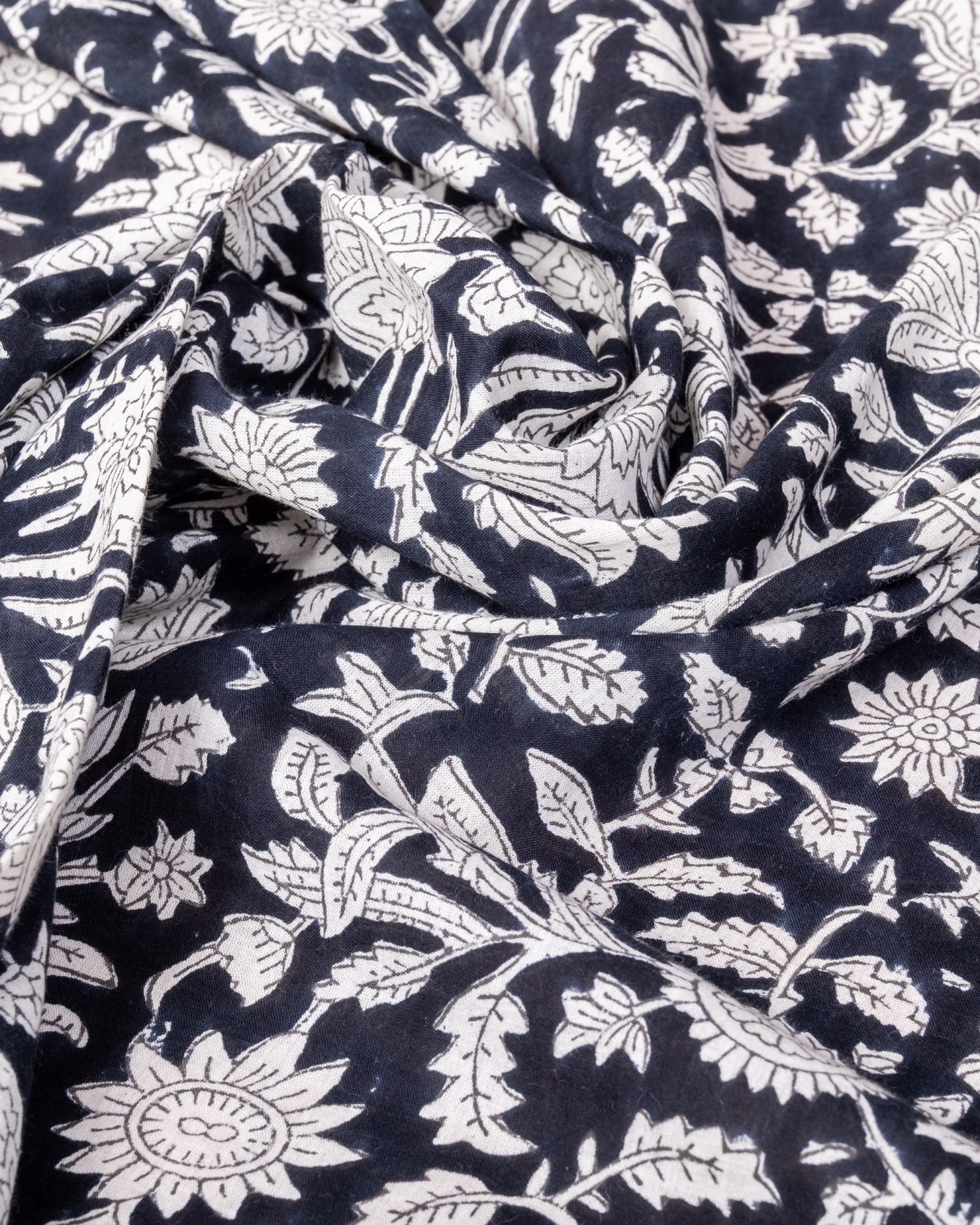 【3個セット】〔1m単位切り売り〕ジャイプル 職人手作り木版染め 色彩美しいボタニカルデザイン〔幅約109cm〕〔ブラック系 更紗柄〕 おしゃれ 生地 テーブルクロス 手芸素材などへ
