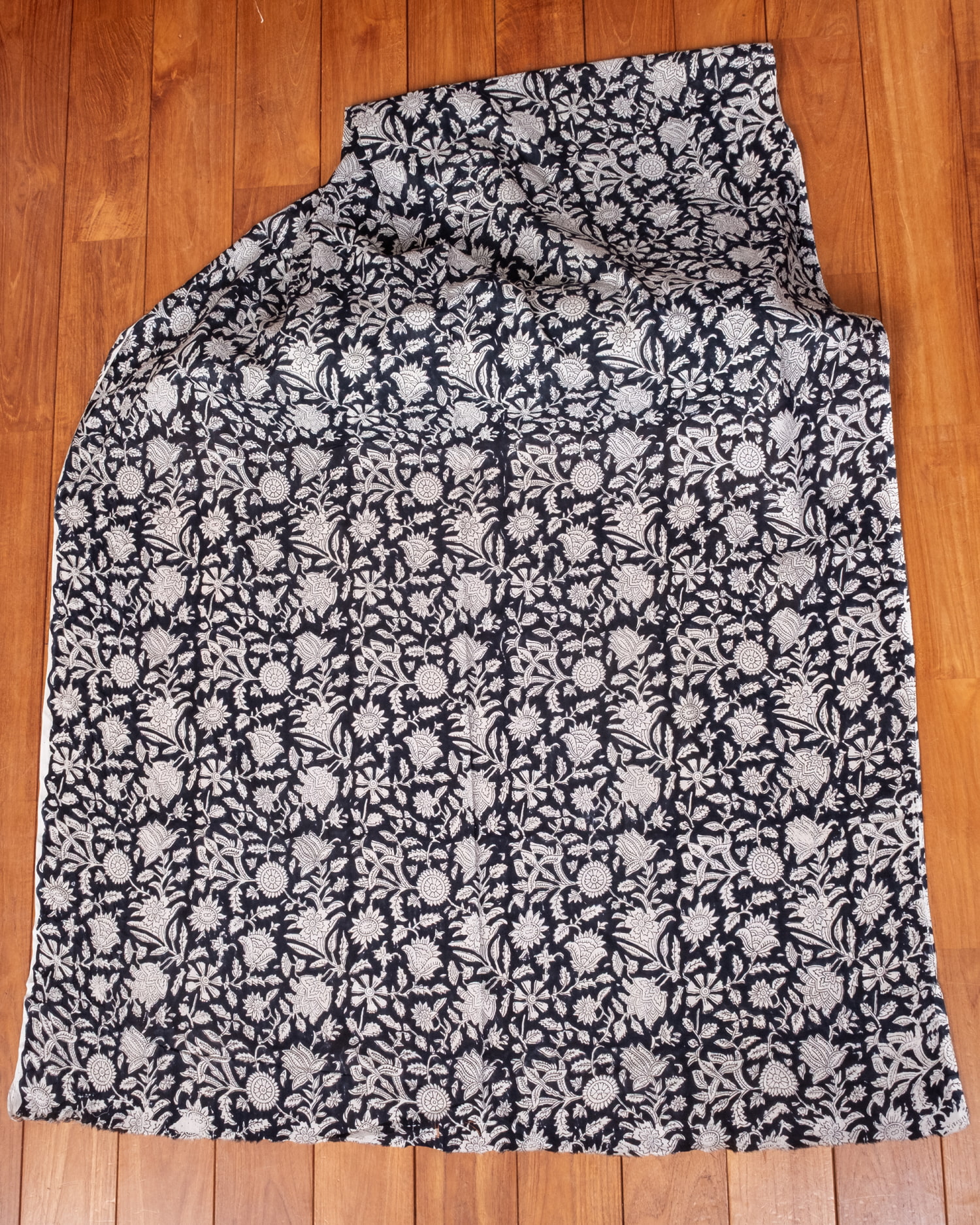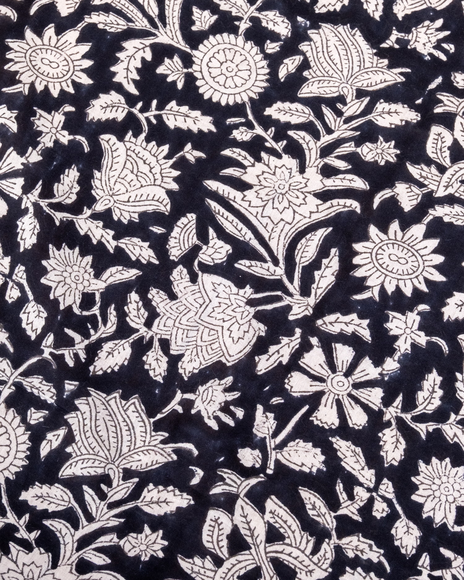 木版染めとは、ウッドブロック(木版)を用いて一つ一つ模様を染めこんだ優雅で贅沢な仕上がりの布です。大量生産には向かない、非常に時間のかかる丁寧な手仕事の賜物といえます。インドは美しい布の宝庫ですが、その中でも特に素敵な一枚に仕上がっています。ハンドメイドのウッドブロックプリントにしか出せない、独特のムラがありとても雰囲気があります。