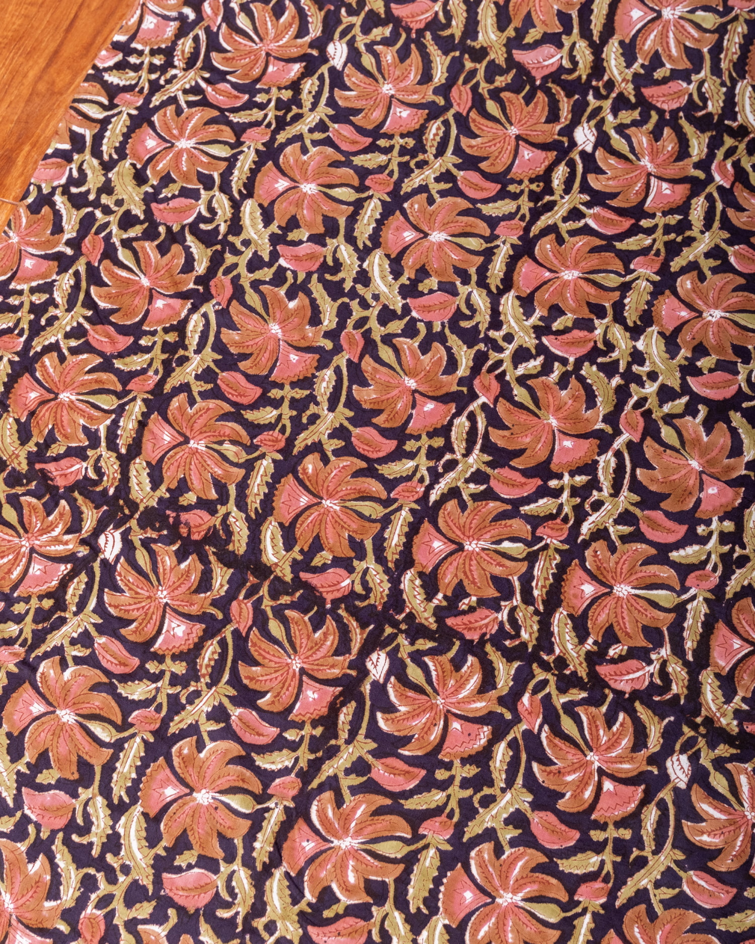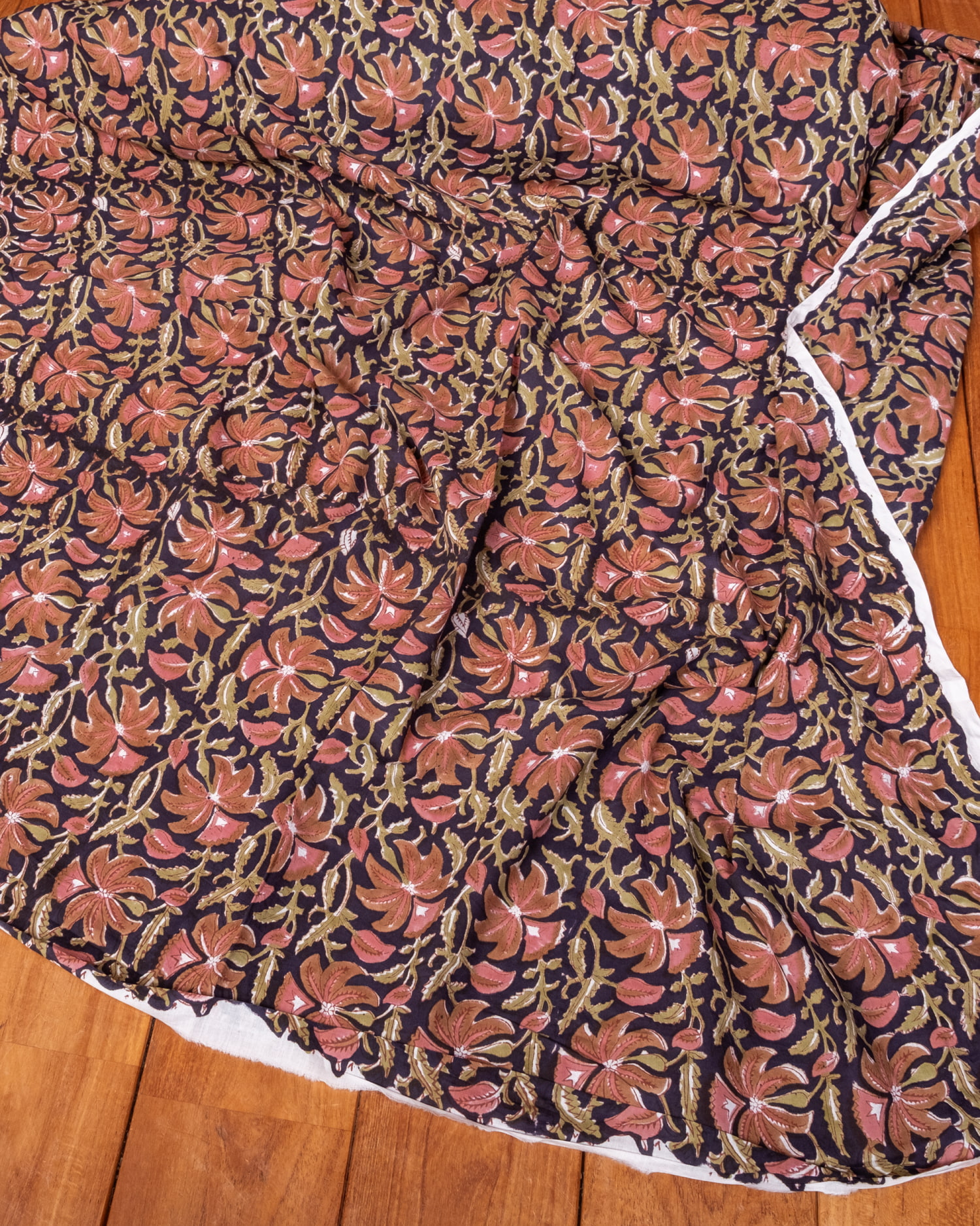 〔1m単位切り売り〕ジャイプル 職人手作り木版染め 色彩美しいボタニカルデザイン〔幅約110cm〕〔ブラック系 更紗柄〕 おしゃれ 生地 テーブルクロス 手芸素材などへ x 3個
