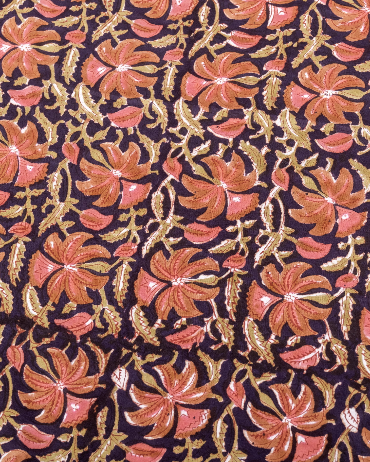 木版染めとは、ウッドブロック(木版)を用いて一つ一つ模様を染めこんだ優雅で贅沢な仕上がりの布です。大量生産には向かない、非常に時間のかかる丁寧な手仕事の賜物といえます。インドは美しい布の宝庫ですが、その中でも特に素敵な一枚に仕上がっています。ハンドメイドのウッドブロックプリントにしか出せない、独特のムラがありとても雰囲気があります。