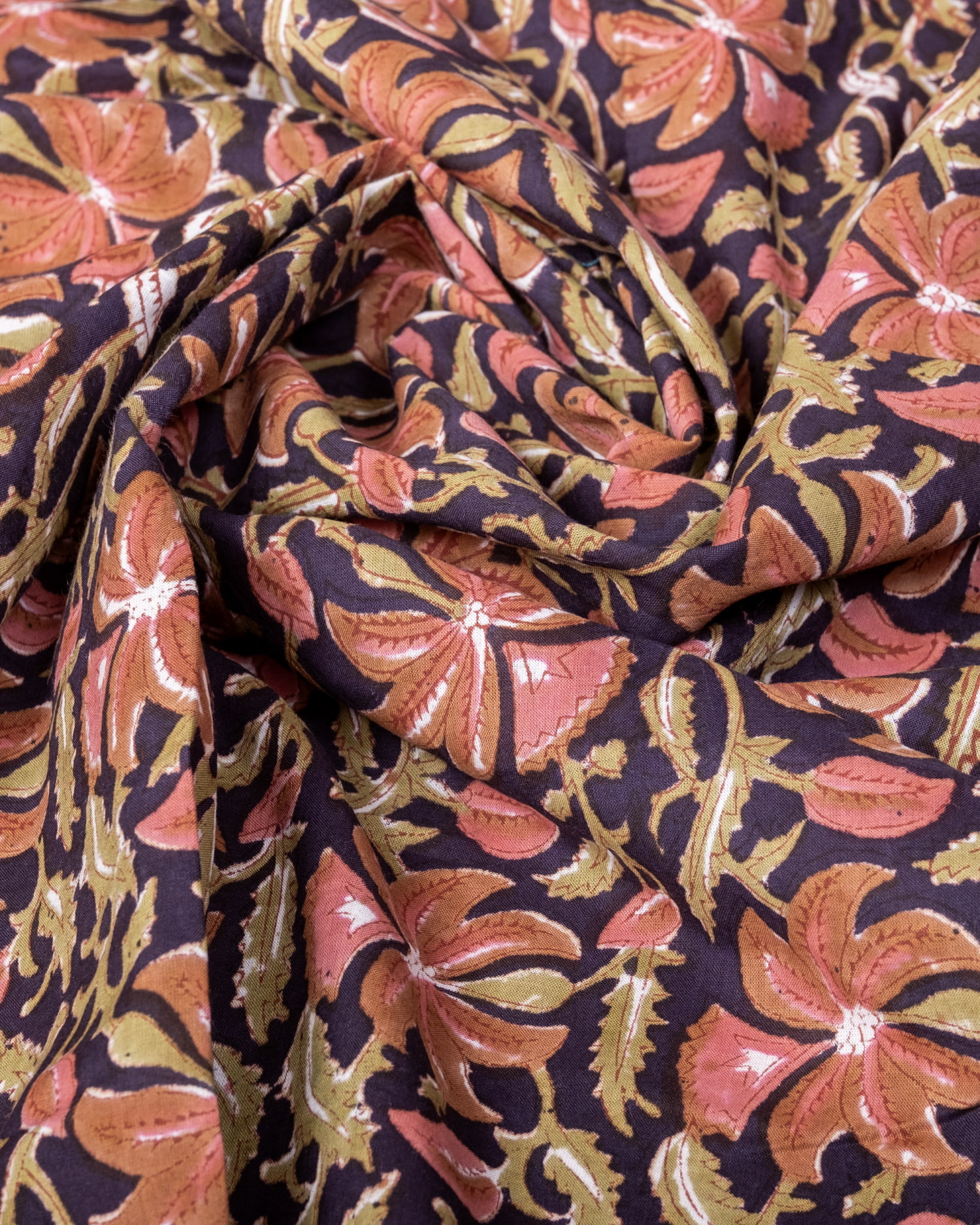 【3個セット】〔1m単位切り売り〕ジャイプル 職人手作り木版染め 色彩美しいボタニカルデザイン〔幅約110cm〕〔ブラック系 更紗柄〕 おしゃれ 生地 テーブルクロス 手芸素材などへ
