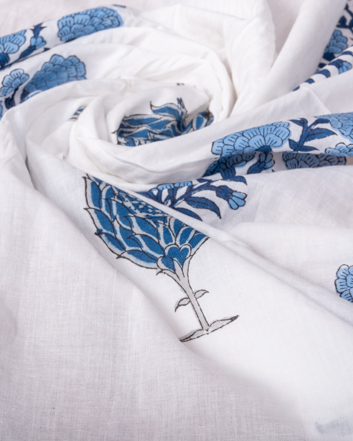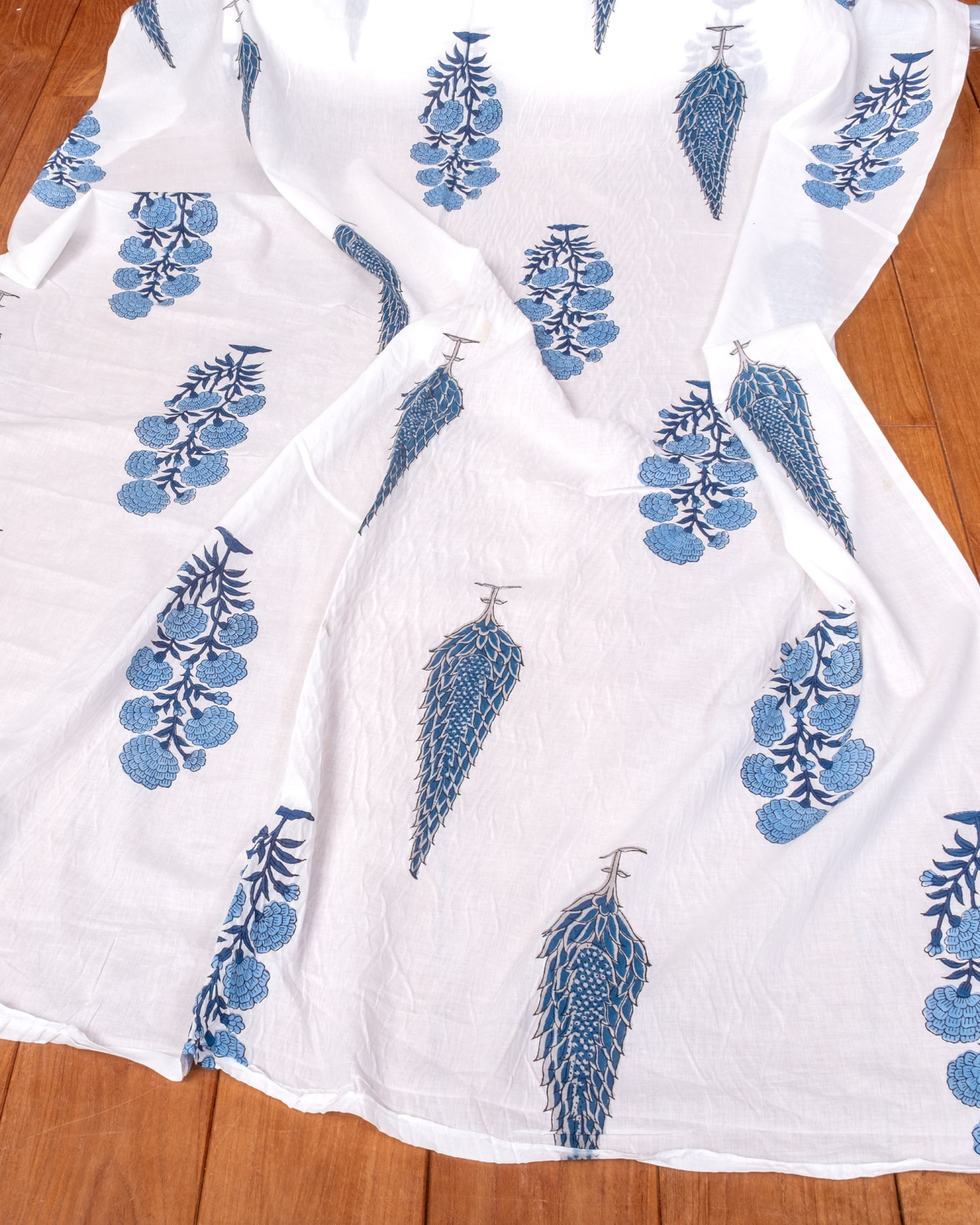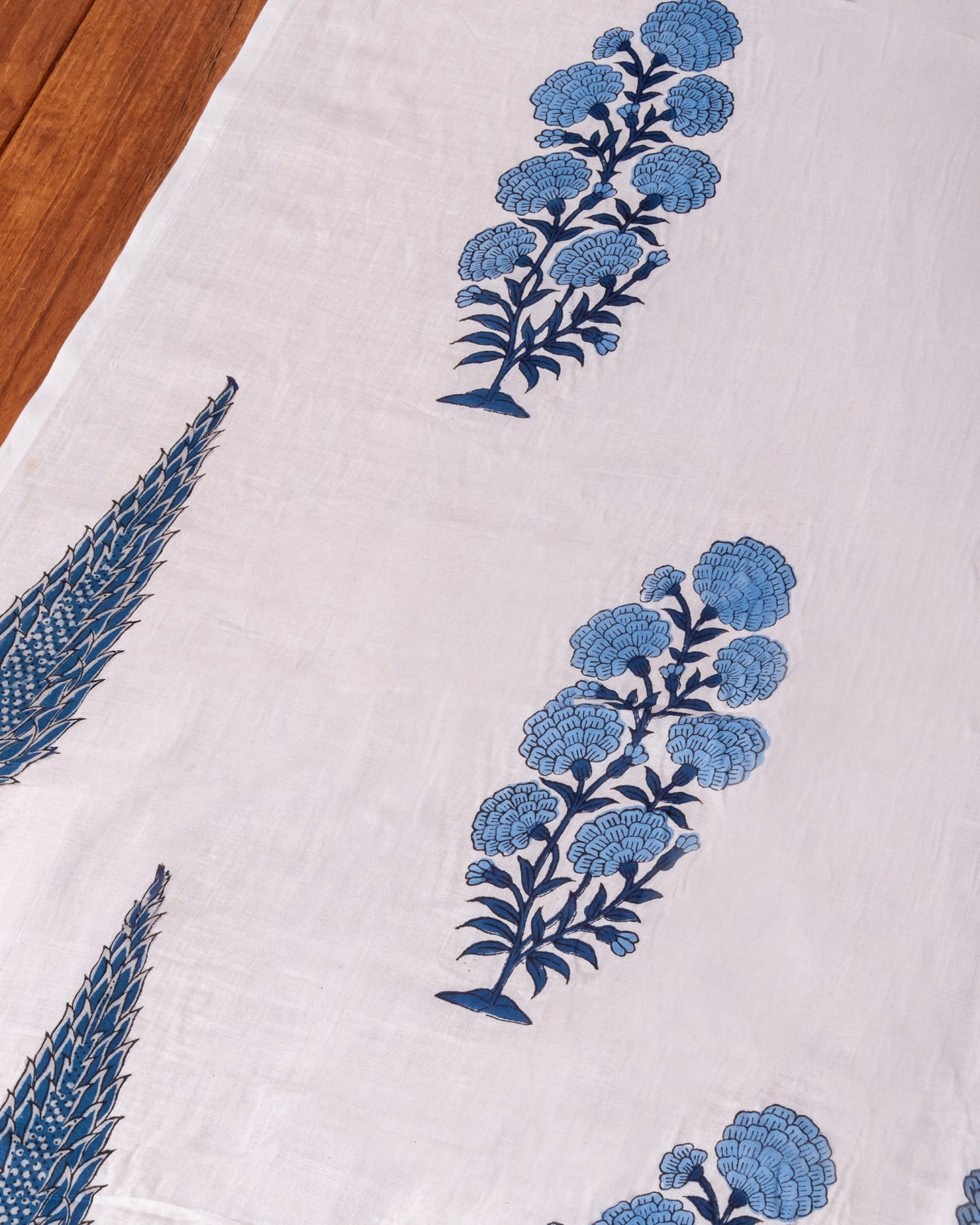 【3個セット】〔1m単位切り売り〕ジャイプル 職人手作り木版染め 色彩美しいボタニカルデザイン〔幅約110cm〕〔白×青系 植物柄〕 おしゃれ 生地 テーブルクロス 手芸素材などへ