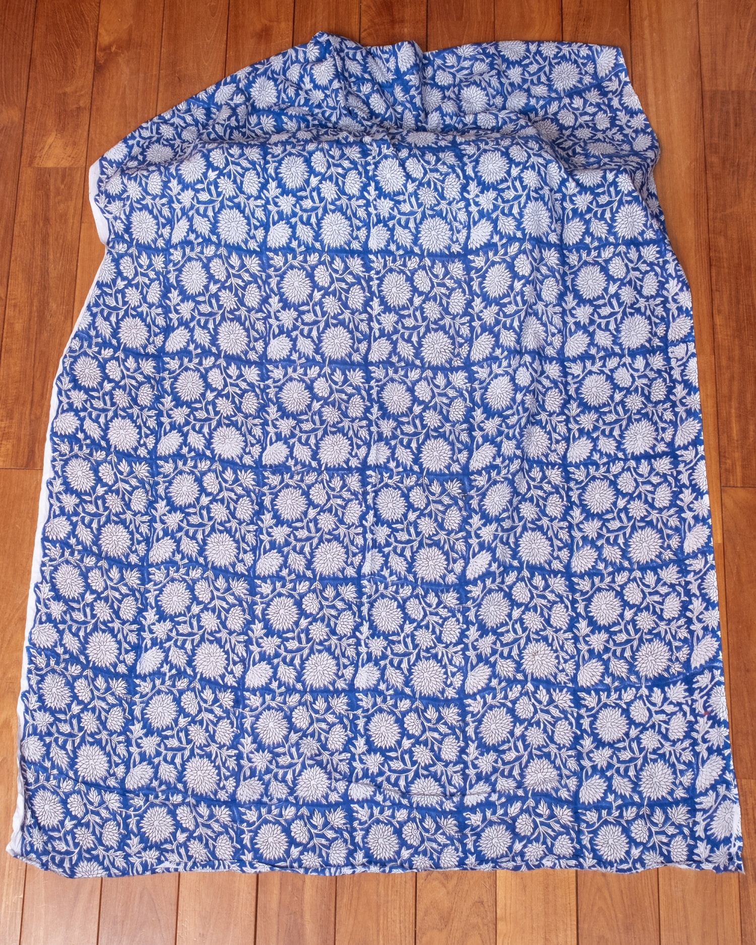木版染めとは、ウッドブロック(木版)を用いて一つ一つ模様を染めこんだ優雅で贅沢な仕上がりの布です。大量生産には向かない、非常に時間のかかる丁寧な手仕事の賜物といえます。インドは美しい布の宝庫ですが、その中でも特に素敵な一枚に仕上がっています。ハンドメイドのウッドブロックプリントにしか出せない、独特のムラがありとても雰囲気があります。