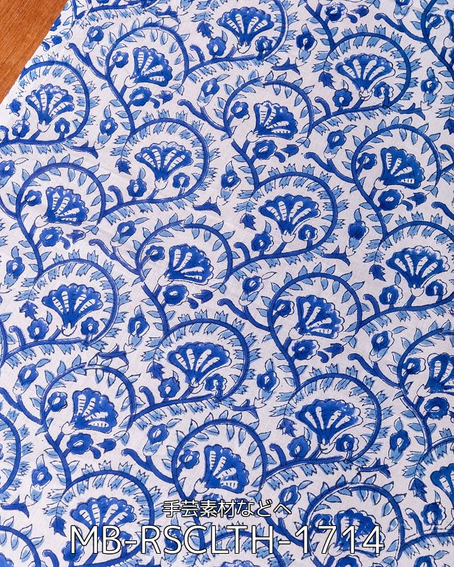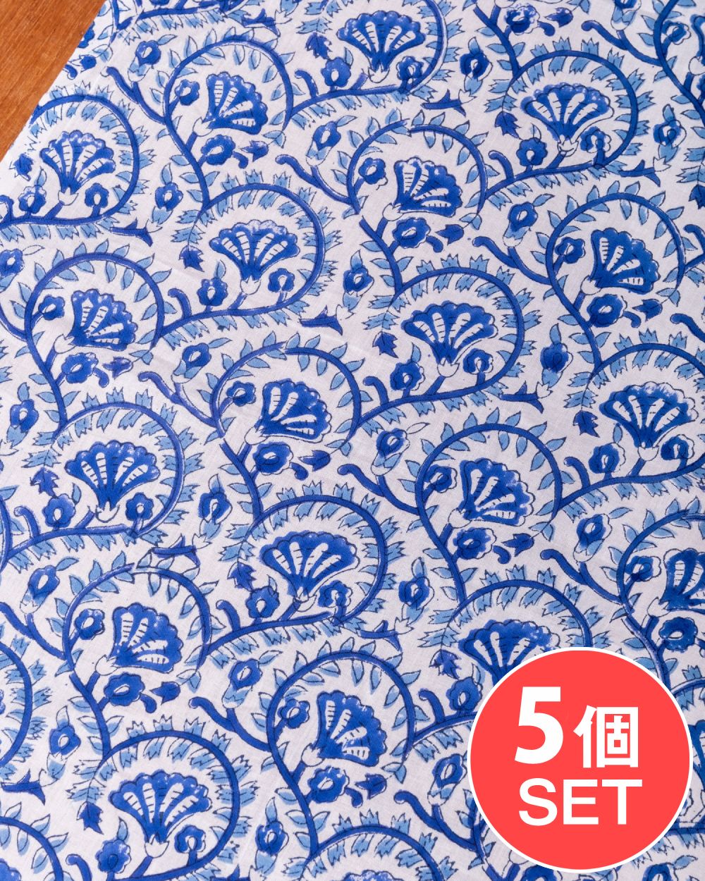 【5個セット】〔1m単位切り売り〕ジャイプル 職人手作り木版染め 色彩美しいボタニカルデザイン〔幅約106cm〕〔ブルー系 更紗柄〕 おしゃれ 生地 テーブルクロス 手芸素材などへ