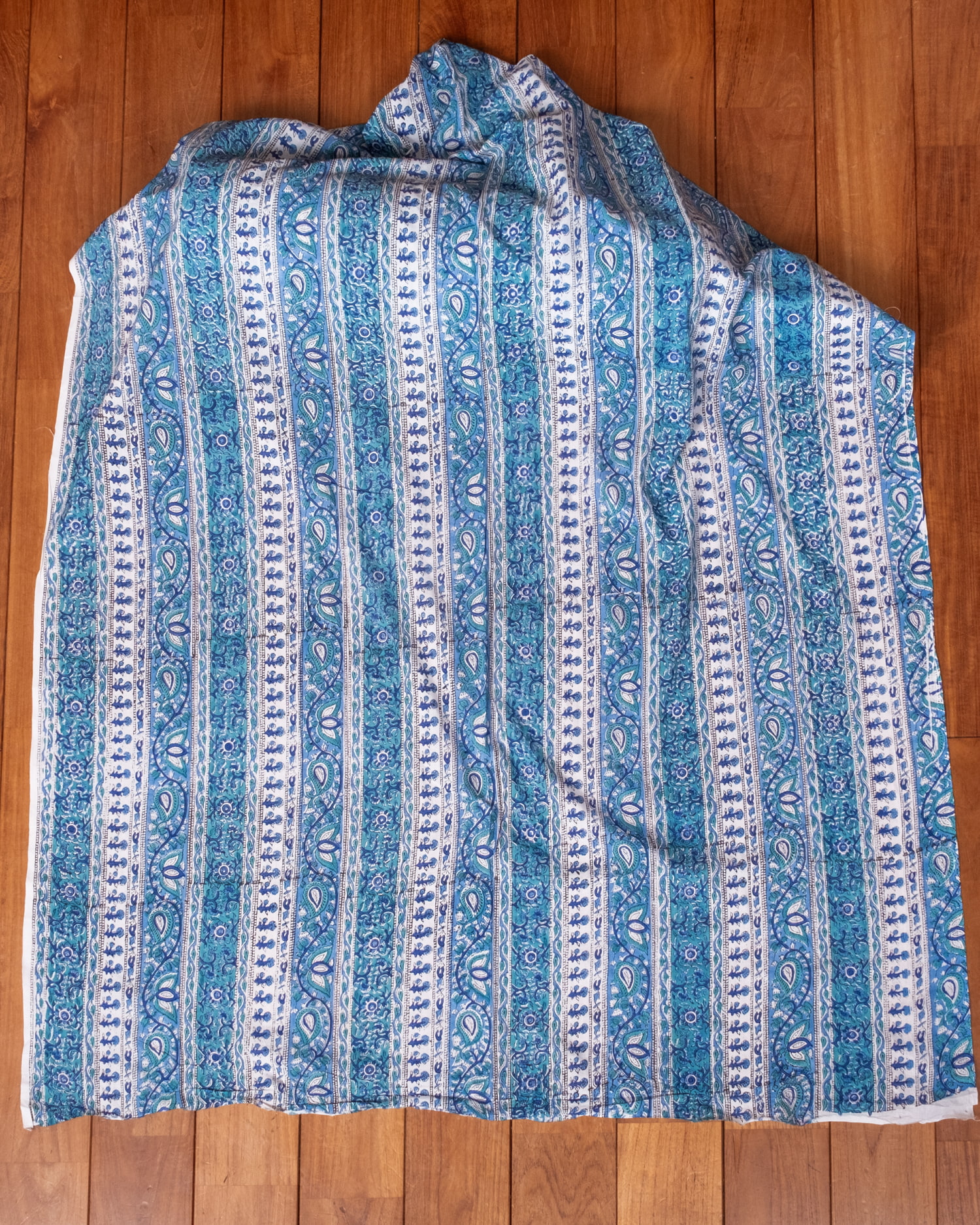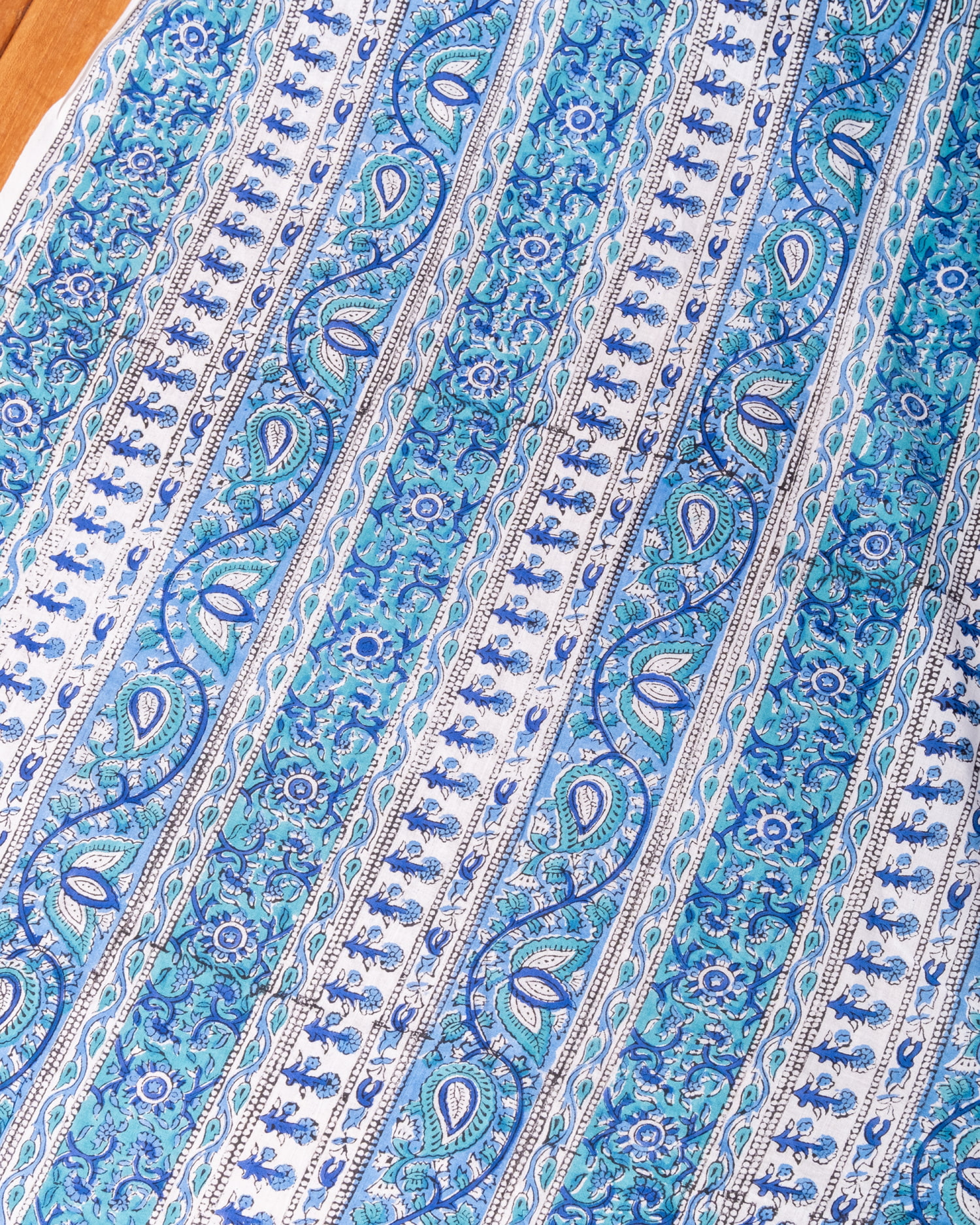 木版染めとは、ウッドブロック(木版)を用いて一つ一つ模様を染めこんだ優雅で贅沢な仕上がりの布です。大量生産には向かない、非常に時間のかかる丁寧な手仕事の賜物といえます。インドは美しい布の宝庫ですが、その中でも特に素敵な一枚に仕上がっています。ハンドメイドのウッドブロックプリントにしか出せない、独特のムラがありとても雰囲気があります。