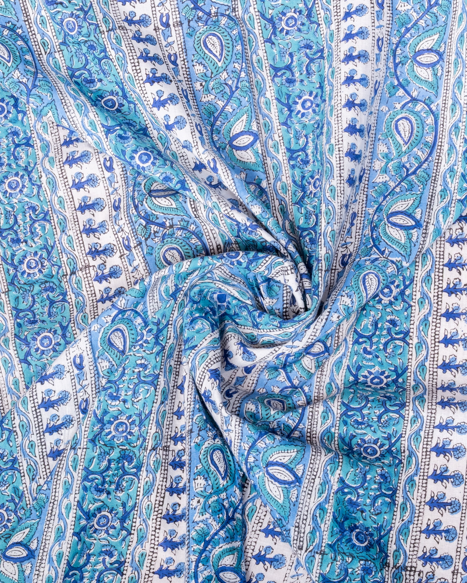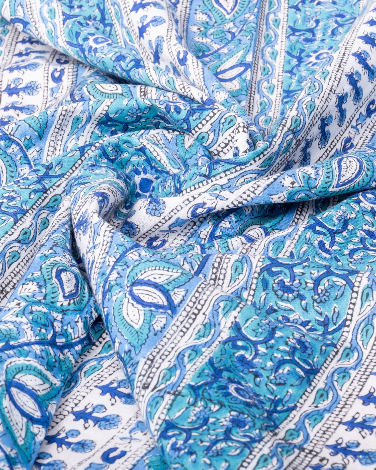 【5個セット】〔1m単位切り売り〕ジャイプル 職人手作り木版染め 色彩美しいボタニカルデザイン〔幅約109cm〕〔ブルー×青緑系 更紗柄〕 おしゃれ 生地 テーブルクロス 手芸素材などへ