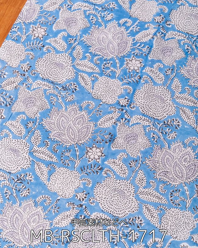 【5個セット】〔1m単位切り売り〕ジャイプル 職人手作り木版染め 色彩美しいボタニカルデザイン〔幅約106cm〕〔水色系 更紗柄〕 おしゃれ 生地 テーブルクロス 手芸素材などへ
