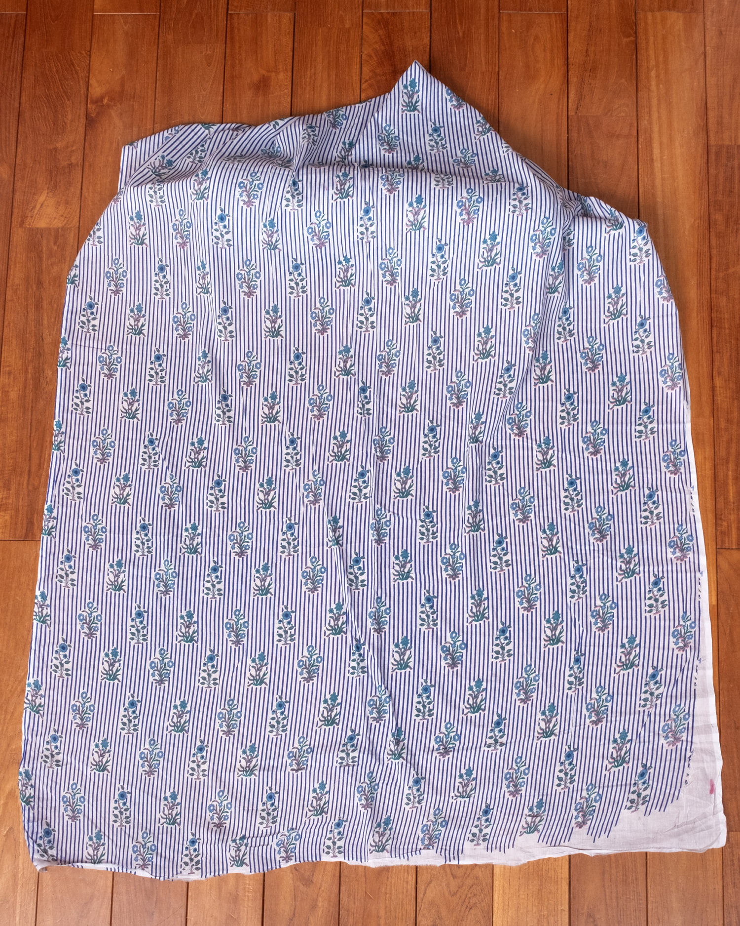 木版染めとは、ウッドブロック(木版)を用いて一つ一つ模様を染めこんだ優雅で贅沢な仕上がりの布です。大量生産には向かない、非常に時間のかかる丁寧な手仕事の賜物といえます。インドは美しい布の宝庫ですが、その中でも特に素敵な一枚に仕上がっています。ハンドメイドのウッドブロックプリントにしか出せない、独特のムラがありとても雰囲気があります。