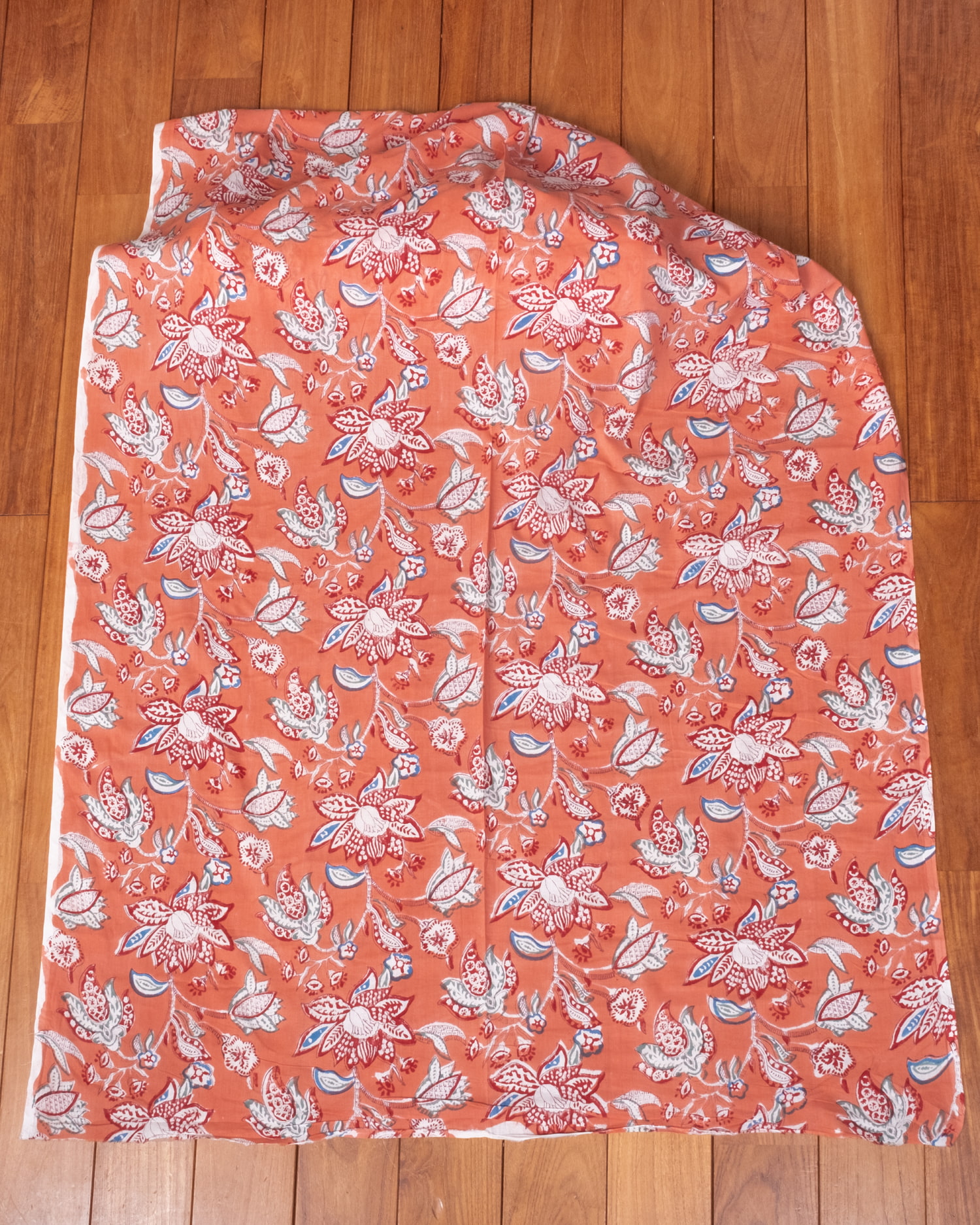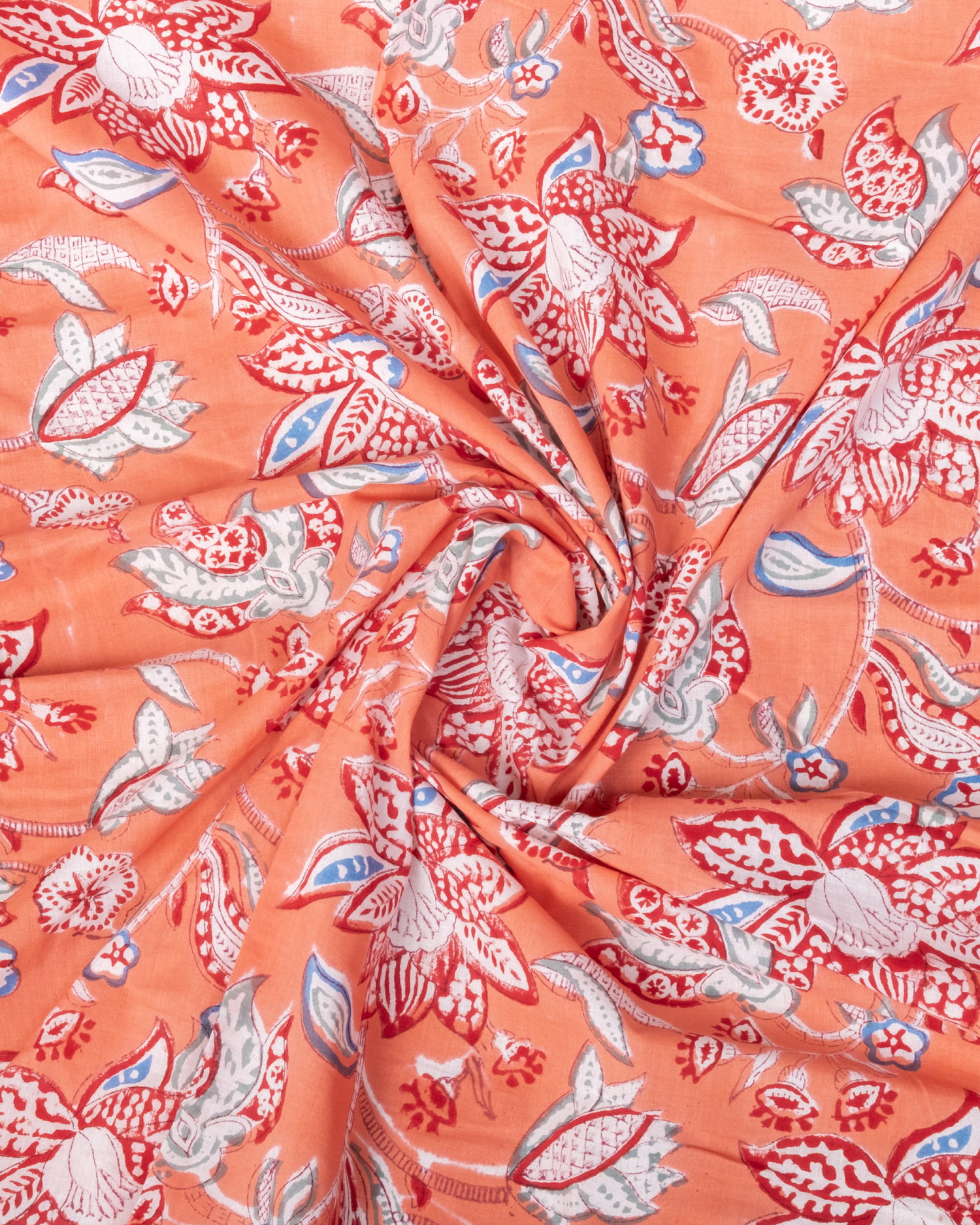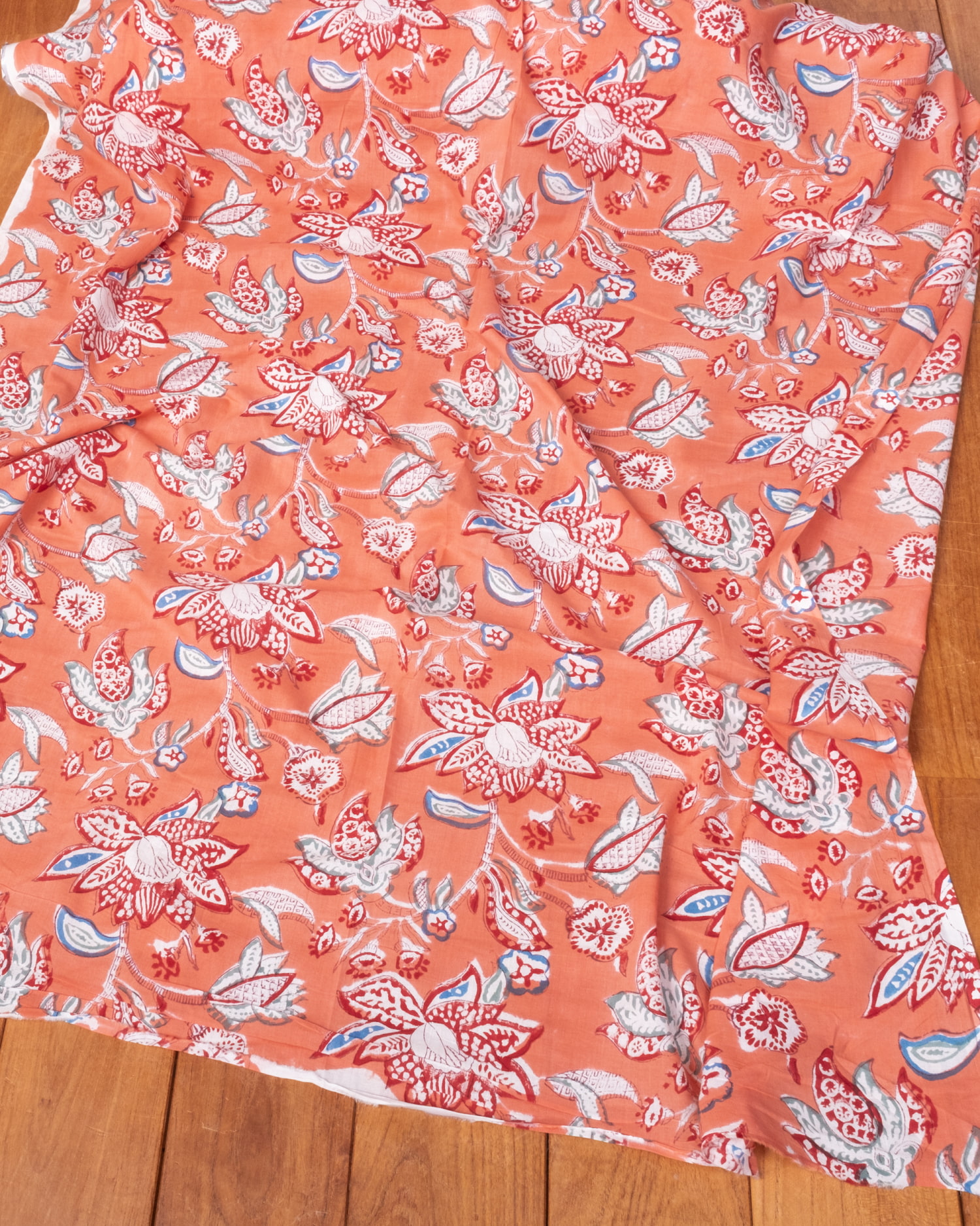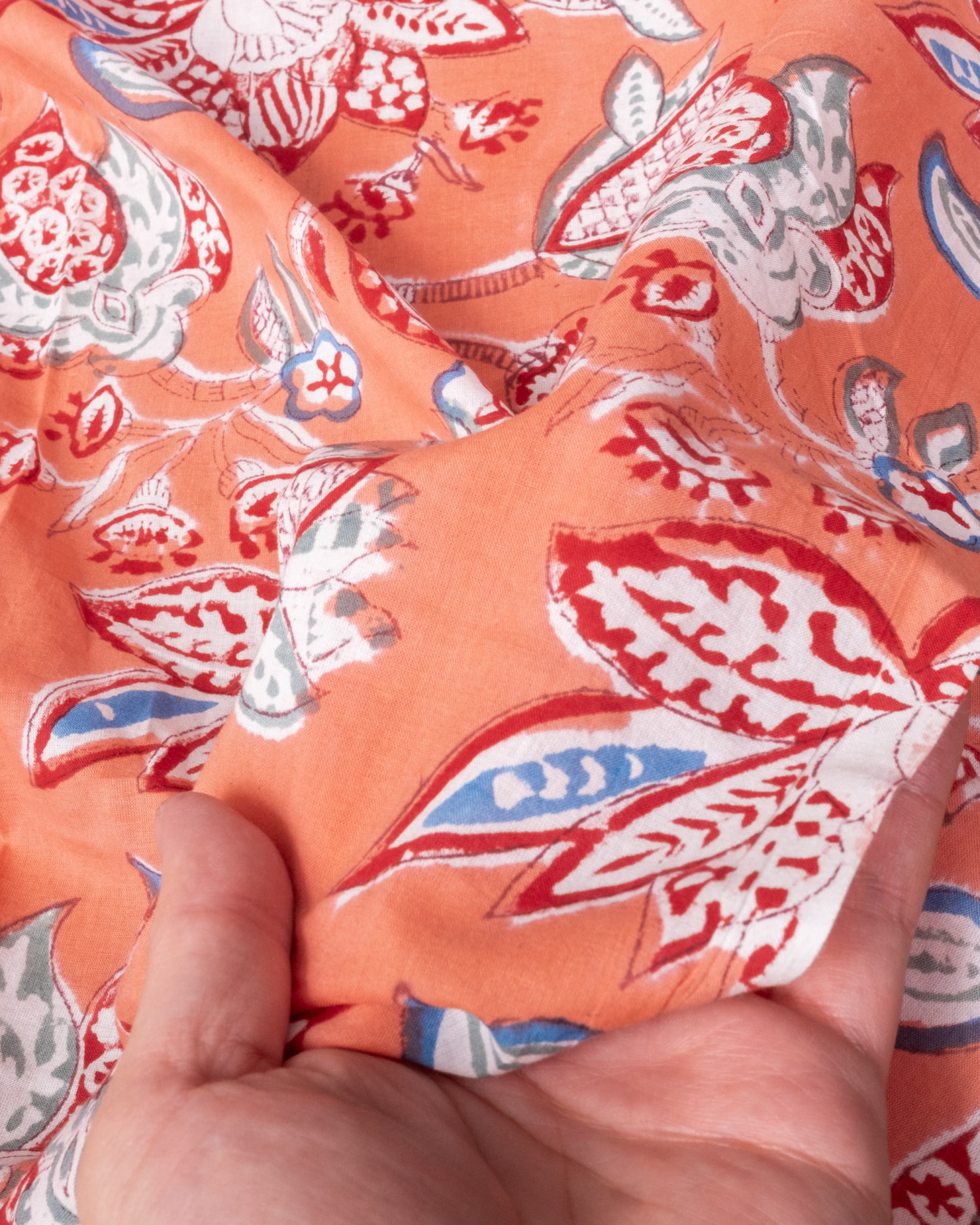 【5個セット】〔1m単位切り売り〕ジャイプル 職人手作り木版染め 色彩美しいボタニカルデザイン〔幅約109cm〕〔サーモンオレンジ系 更紗柄〕 おしゃれ 生地 テーブルクロス 手芸素材などへ