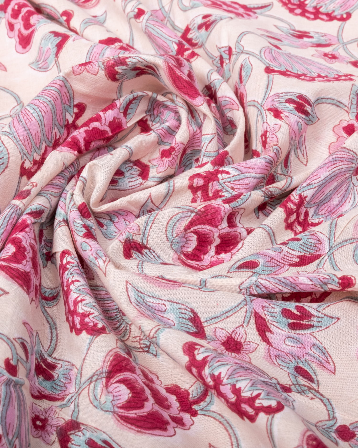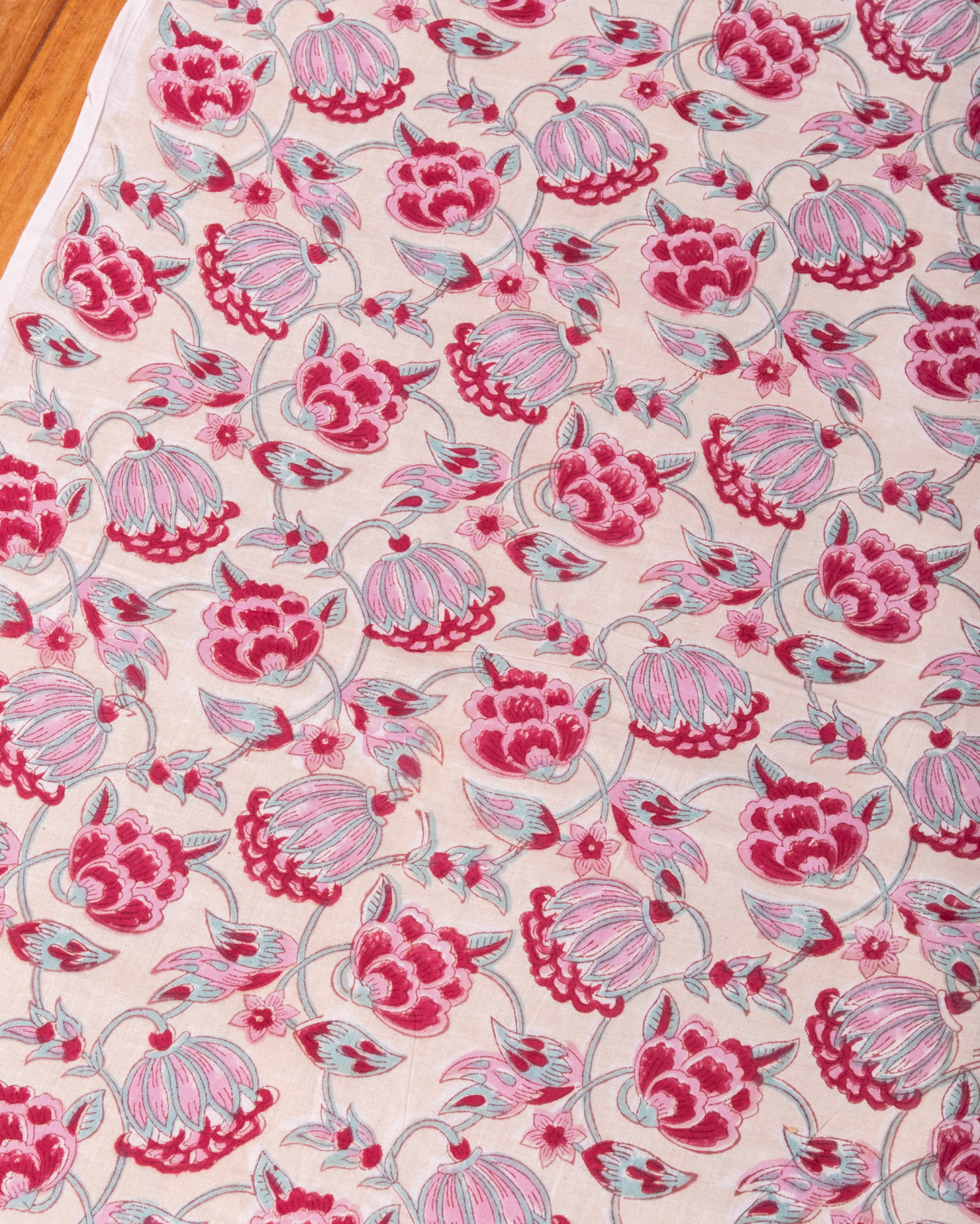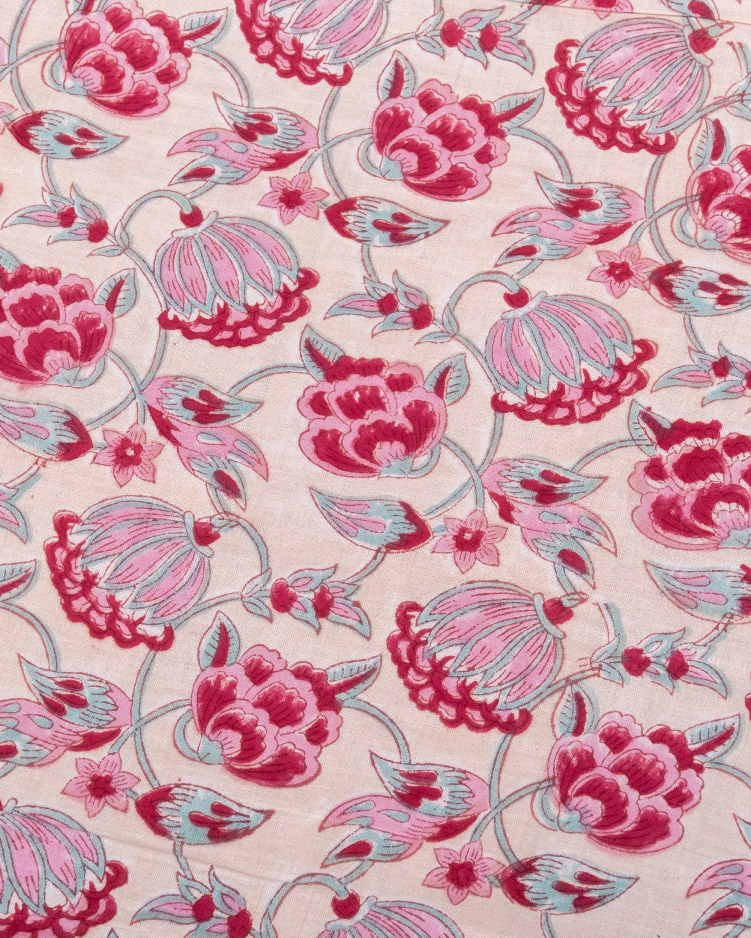 【5個セット】〔1m単位切り売り〕ジャイプル 職人手作り木版染め 色彩美しいボタニカルデザイン〔幅約108cm〕〔薄黄クリーム×ピンク×赤系 更紗柄〕 おしゃれ 生地 テーブルクロス 手芸素材などへ