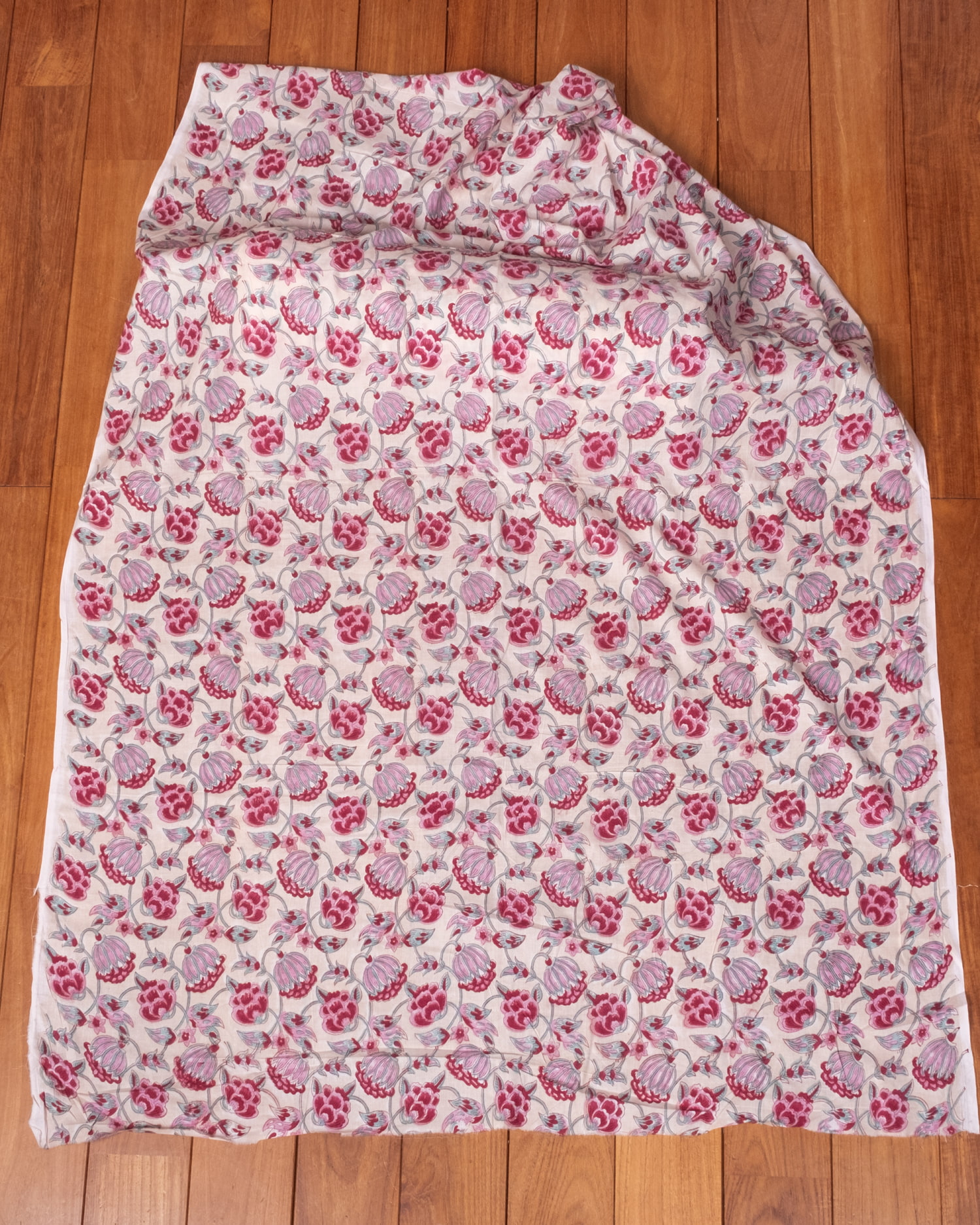 木版染めとは、ウッドブロック(木版)を用いて一つ一つ模様を染めこんだ優雅で贅沢な仕上がりの布です。大量生産には向かない、非常に時間のかかる丁寧な手仕事の賜物といえます。インドは美しい布の宝庫ですが、その中でも特に素敵な一枚に仕上がっています。ハンドメイドのウッドブロックプリントにしか出せない、独特のムラがありとても雰囲気があります。