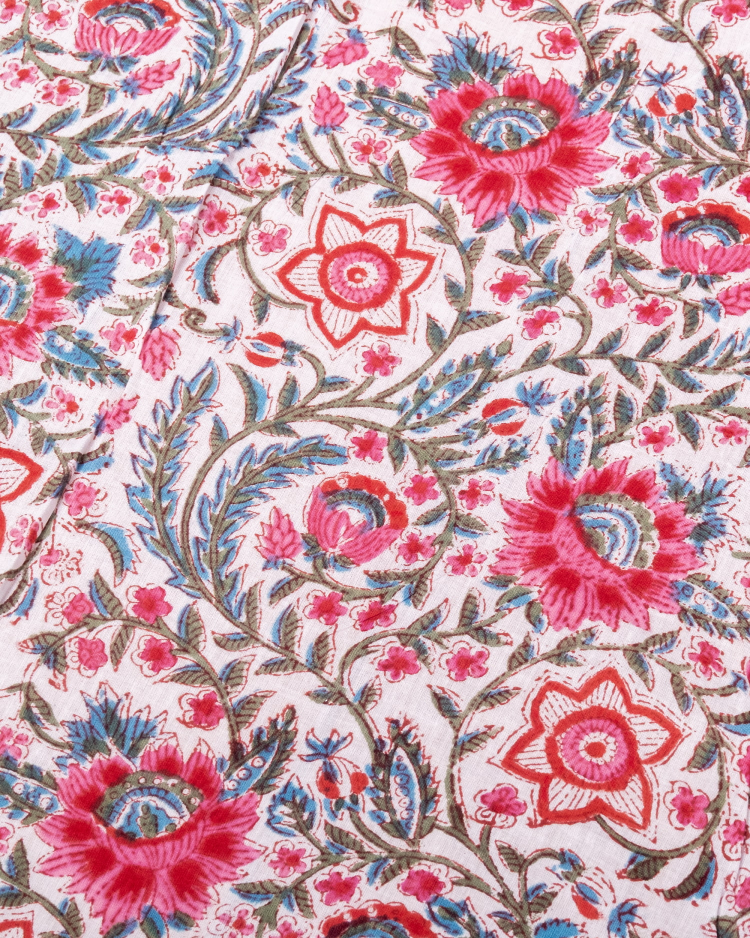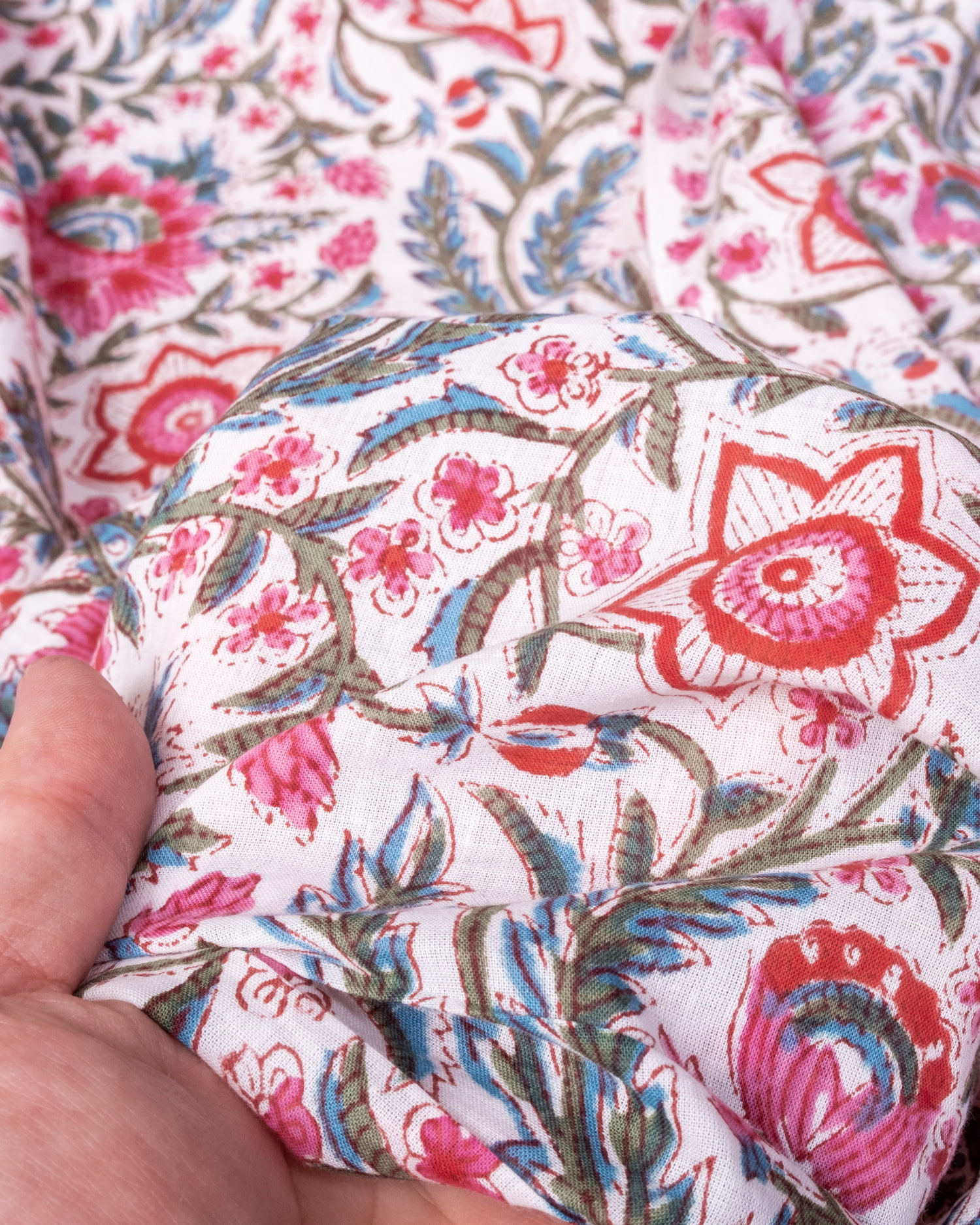 とってもかわいい生地がジャイプルからやってきました。どこかプロヴァンスなテイストも感じさせる、魅力的な色彩とデザイン。職人さんが全て手作りしており、インドらしい木版と鮮やかな色彩がきわだつ、インド綿100%のファブリックです。ナチュラルな風合いは、派手すぎずほどよく上品な雰囲気で、どんなお部屋にも馴染み、相性良くフィットしてくれそうです。