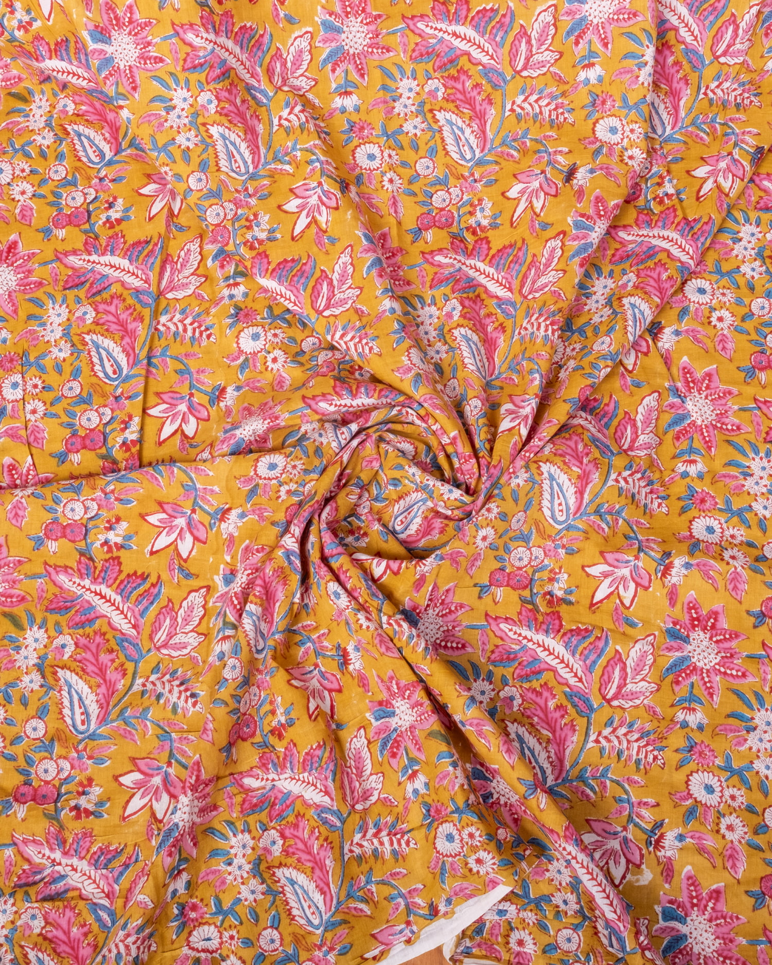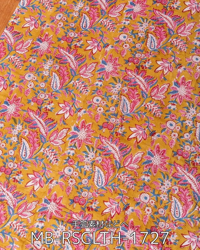 【5個セット】〔1m単位切り売り〕ジャイプル 職人手作り木版染め 色彩美しいボタニカルデザイン〔幅約111cm〕〔黄土×ピンク×青緑系 更紗柄〕 おしゃれ 生地 テーブルクロス 手芸素材などへ