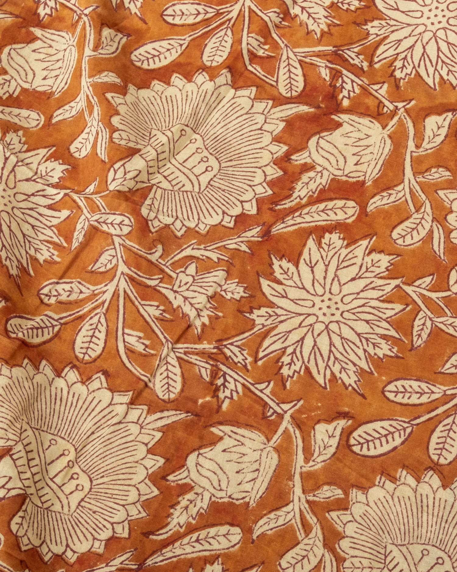 木版染めとは、ウッドブロック(木版)を用いて一つ一つ模様を染めこんだ優雅で贅沢な仕上がりの布です。大量生産には向かない、非常に時間のかかる丁寧な手仕事の賜物といえます。インドは美しい布の宝庫ですが、その中でも特に素敵な一枚に仕上がっています。ハンドメイドのウッドブロックプリントにしか出せない、独特のムラがありとても雰囲気があります。