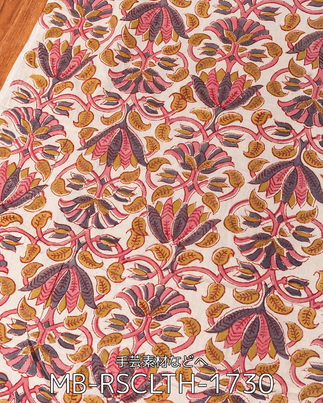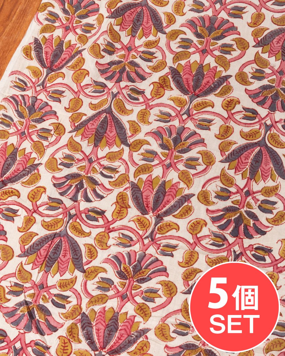 【5個セット】〔1m単位切り売り〕ジャイプル 職人手作り木版染め 色彩美しいボタニカルデザイン〔幅約110cm〕〔黒×ピンク×茶系 更紗柄〕 おしゃれ 生地 テーブルクロス 手芸素材などへ